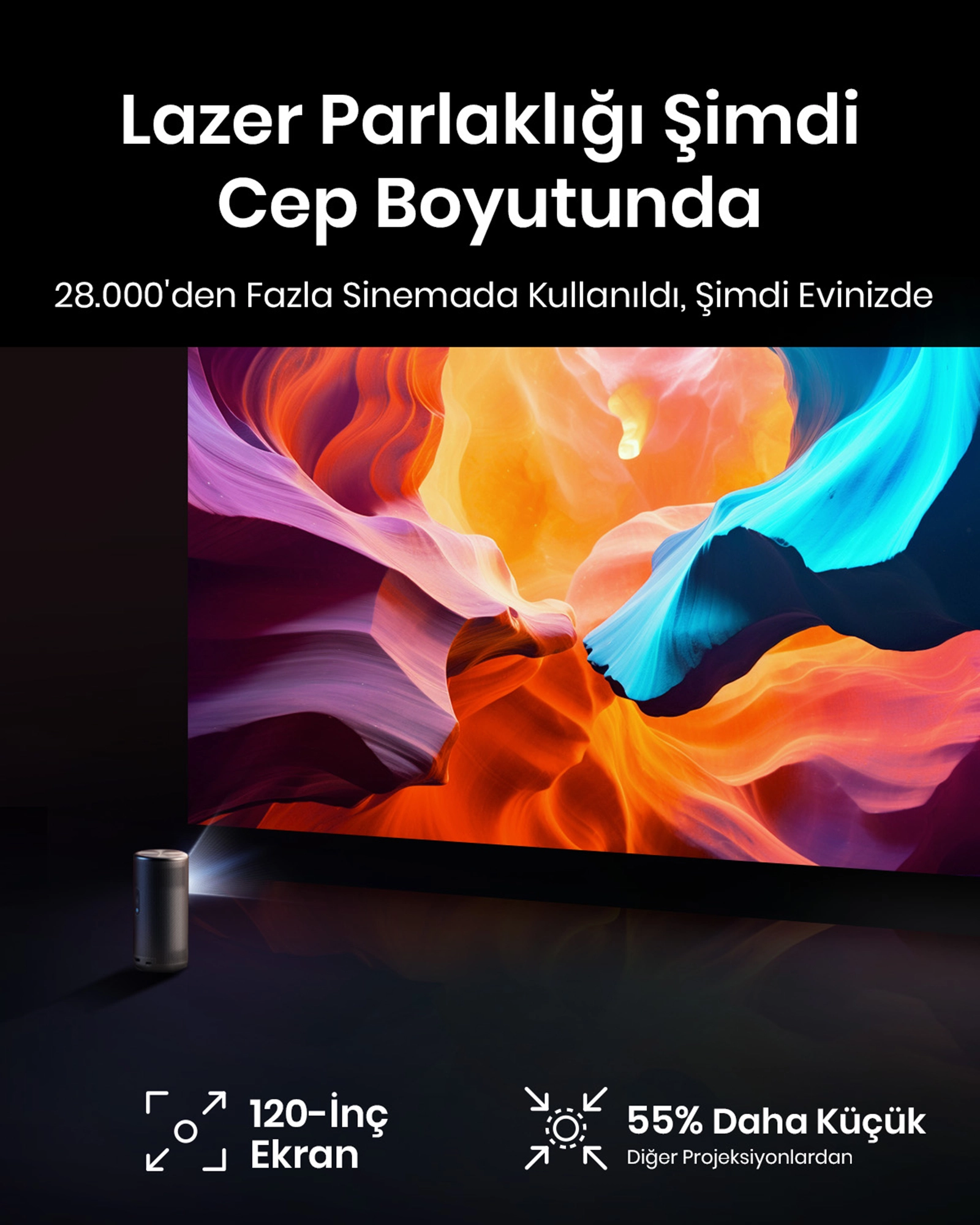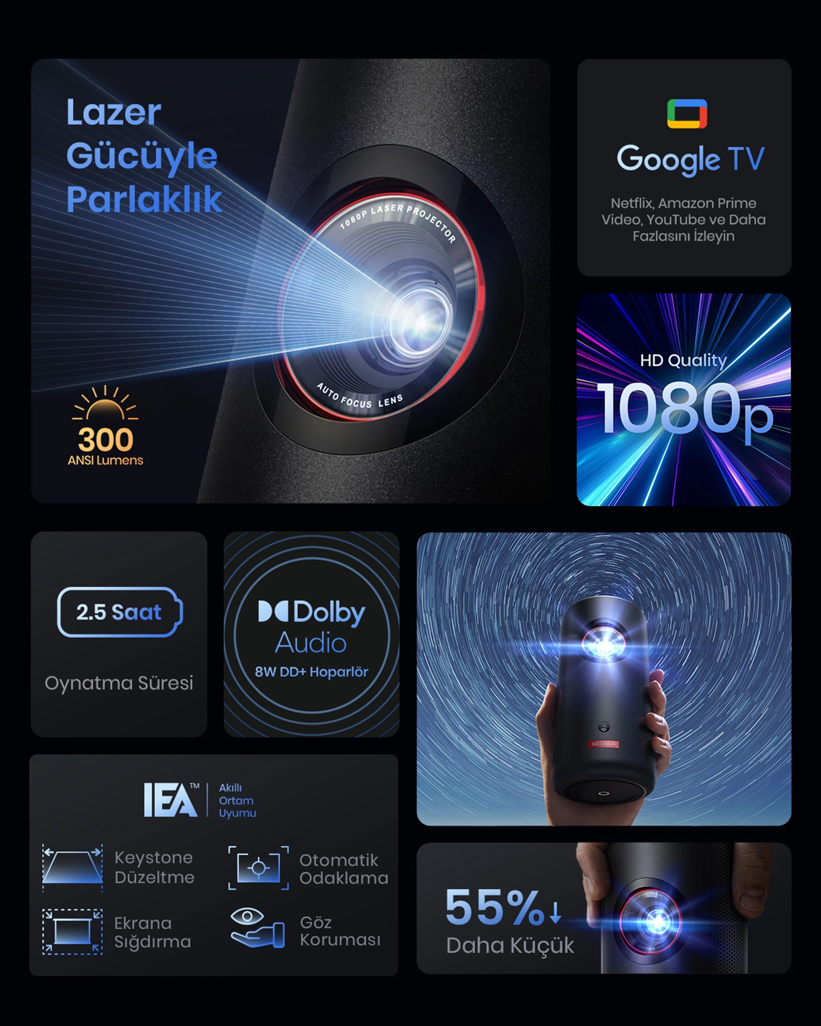 Anker Nebula Capsule 3 Laser Google TV. Projector brightness: 300 ANSI lumens, Projection technology: DLP, Projector native resolution: 1080p (1920x1080). Light source type: Laser, Service life of light source: 2.5 h. Focus: Auto. Noise level: 32 dB. Product type: Projector module, Product colour: Black
