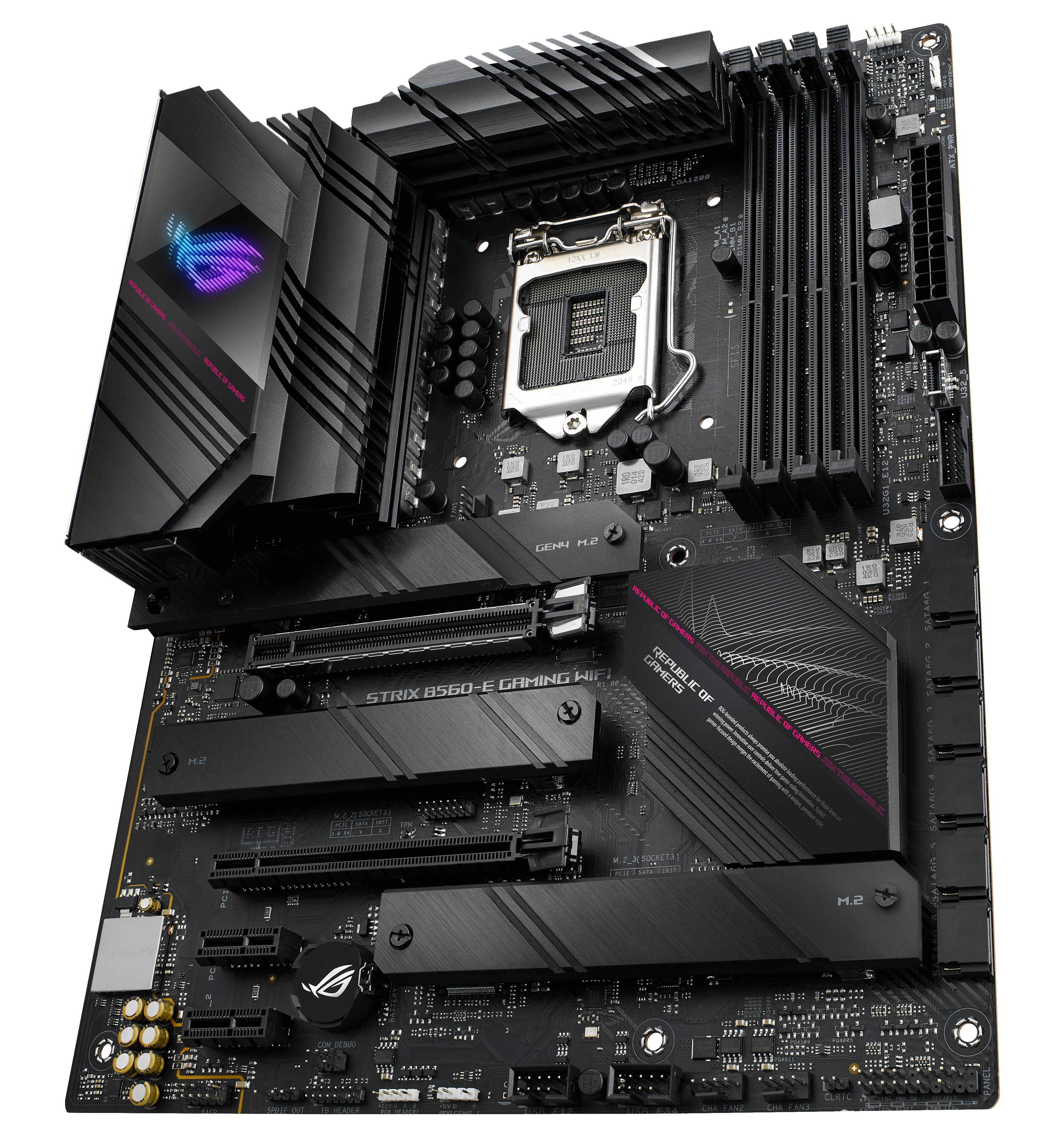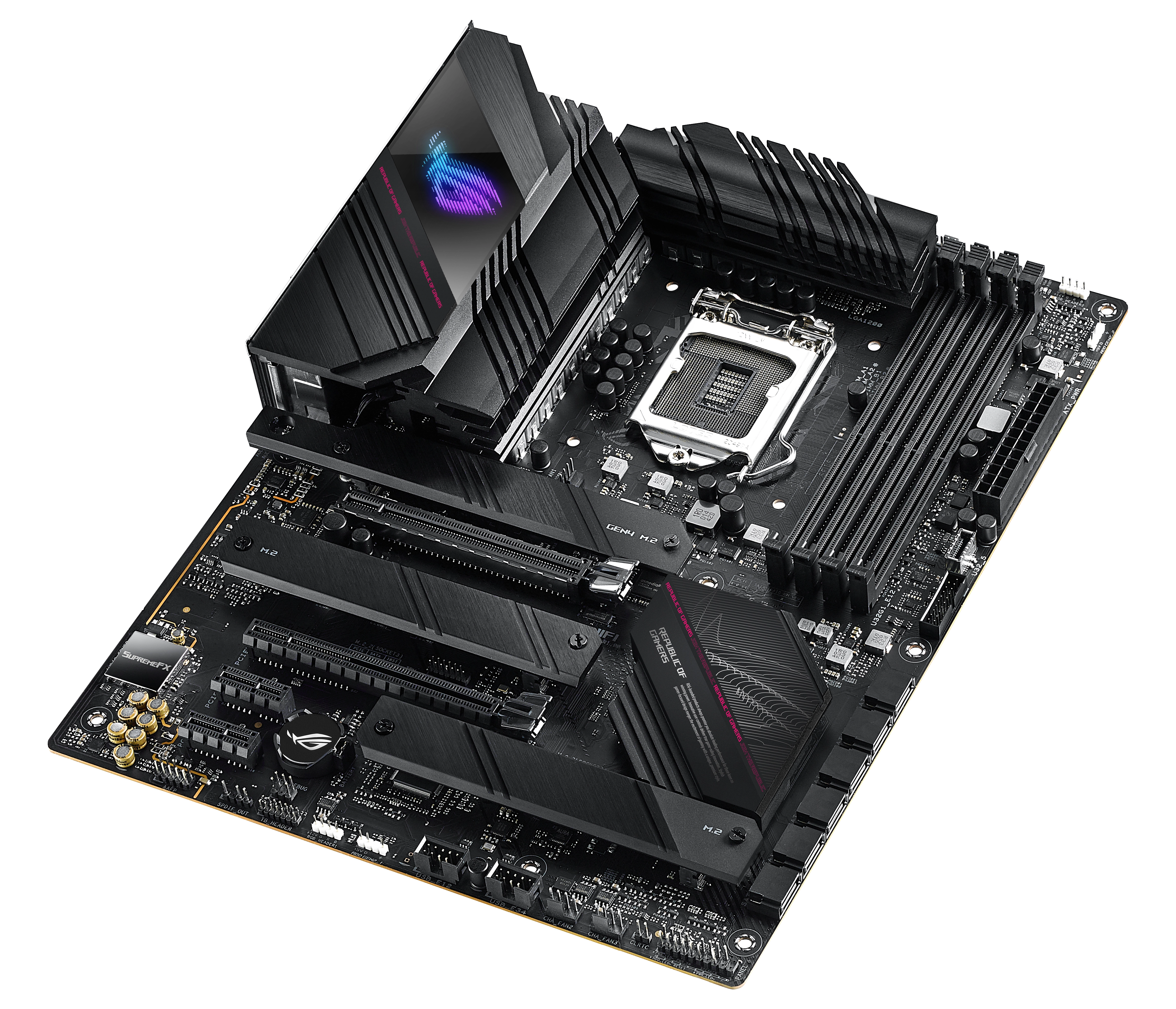 Intel® B560 LGA 1200 ATX motherboard with PCIe® 4.0, 14+2 teamed power stages, Two-Way AI Noise Cancelation, WiFi 6E (802.11ax), Intel 2.5 Gb Ethernet, three M.2 slots with heatsinks and NVMe SSD support, USB 3.2 Gen 2x2 USB Type-C®, SATA and Aura Sync RGB lighting