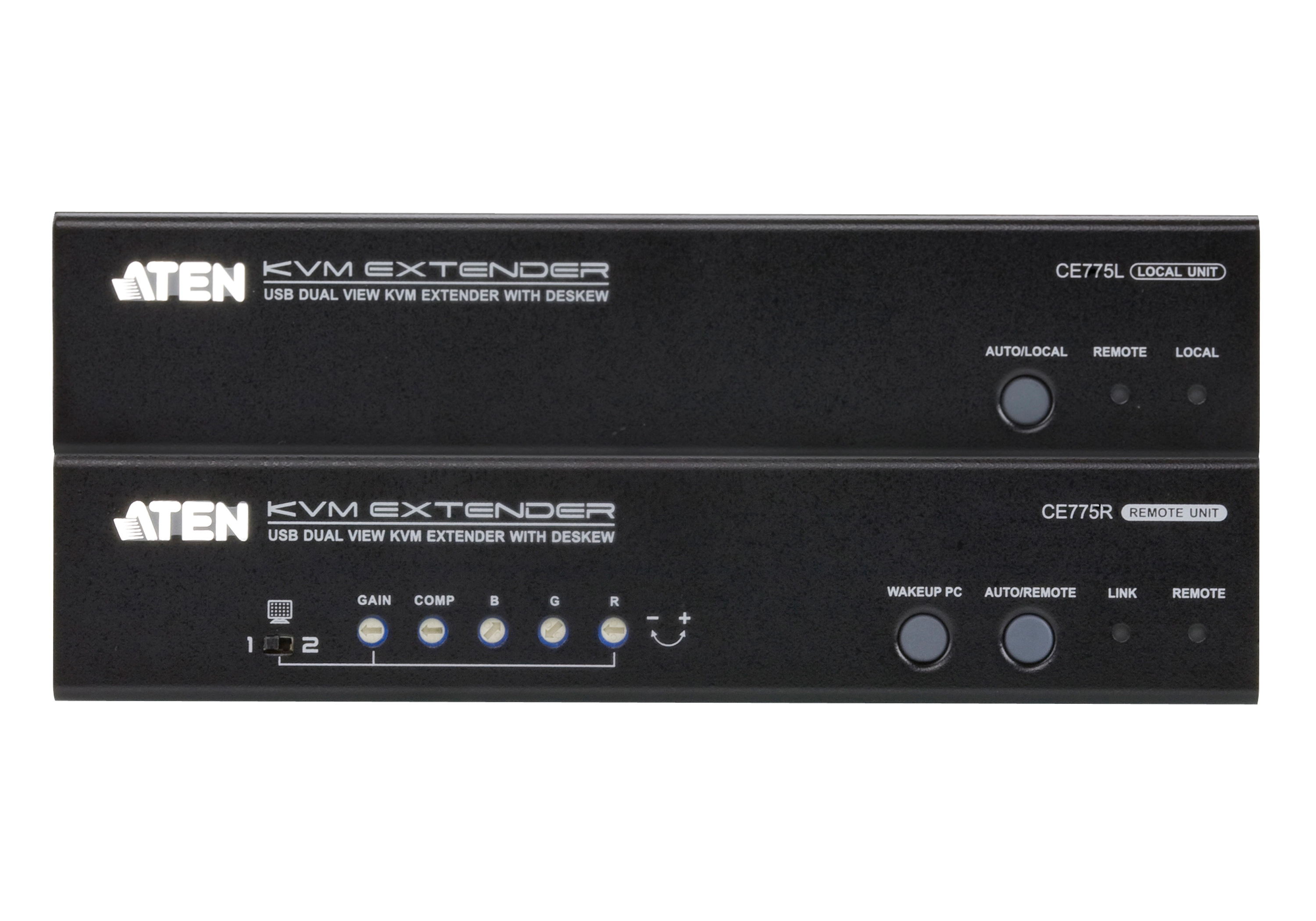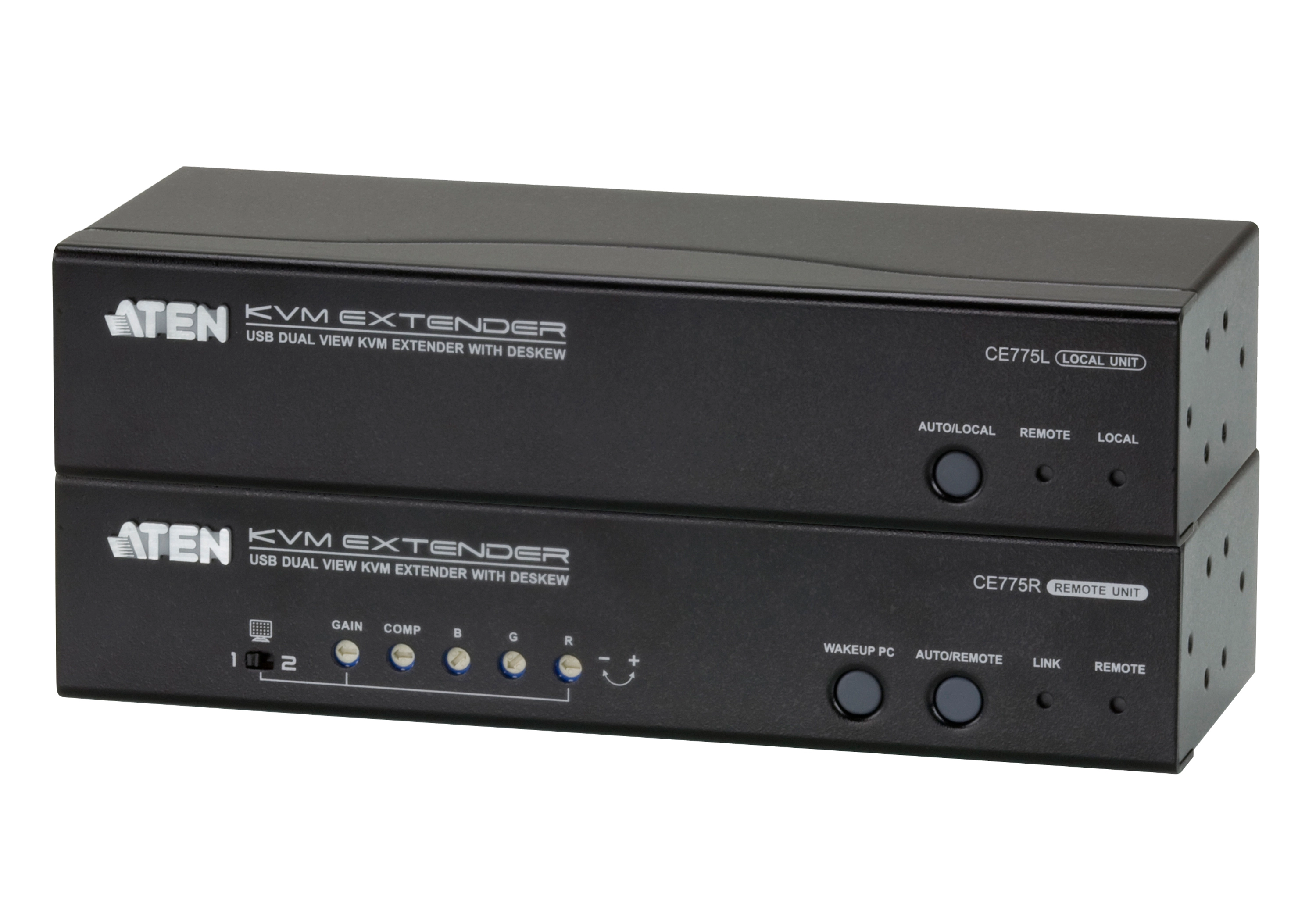 ATEN CE775 Dual View KVM Extenders with Deskew function allows access to a computer system from a remote Dual View console up to 300 m away. The dual view function provides support for two displays, allowing the video output to seamlessly display on two monitors. Its advanced PC Wake - Up feature that allows you simply uses a pushbutton from the remote dual view console to wake a PC at the local site via RS-232, no need to go to the local site to wake up the PC. It eliminates the need for traveling back and forth between the local computer and remote console, effi cient and flexible.