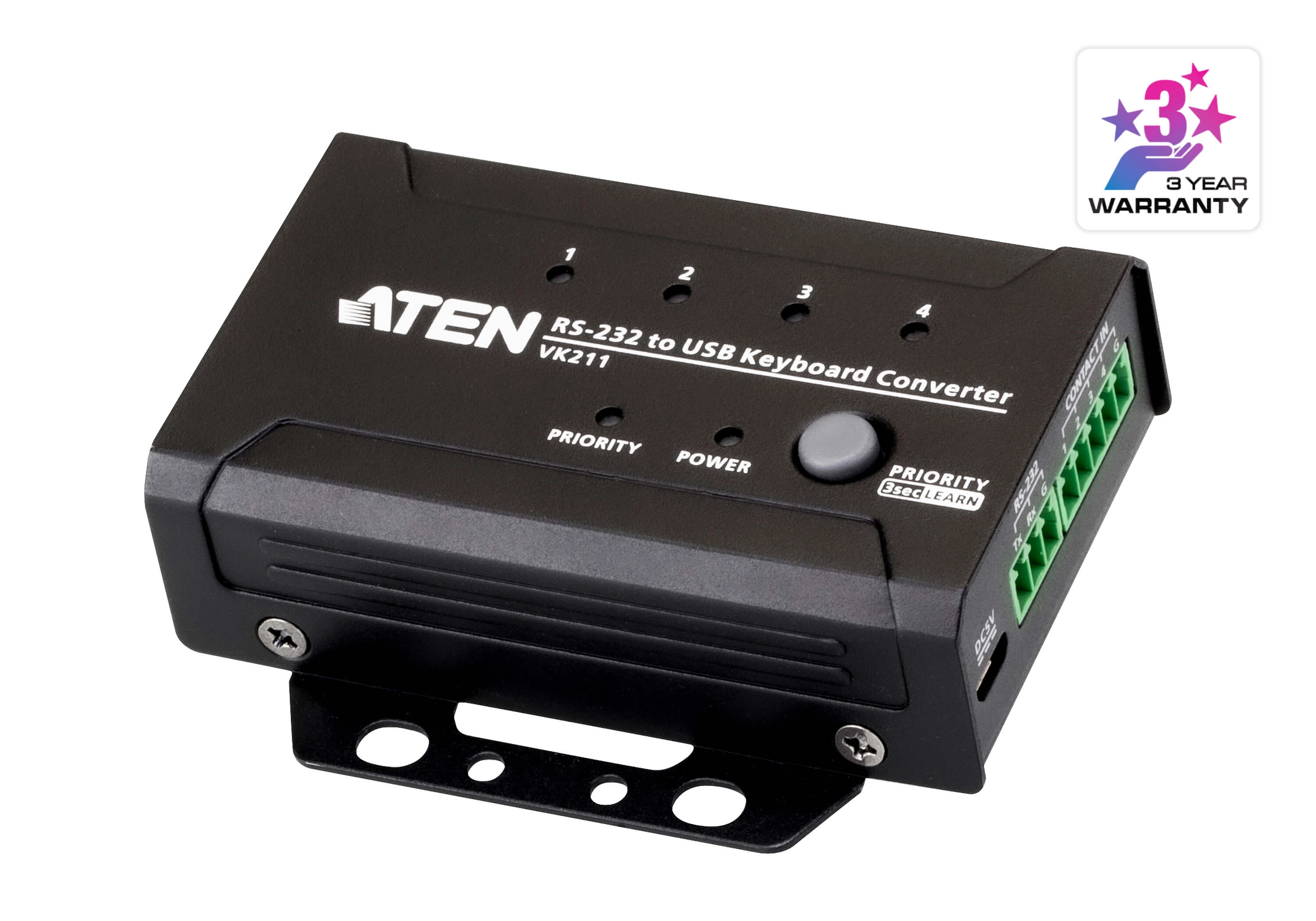 VK211 converts RS-232 commands to full-range USB keyboard signals for remote control over PC-based devices/KVM Switches, broadening ATEN Control System/3rd party controller applications. Besides, VK211 can recall the stored key codes and store up to 4 preset actions triggered via Contact In signals. The Learn function captures USB keyboard signals by pressing certain key combinations to ease the setup procedure and configurations.