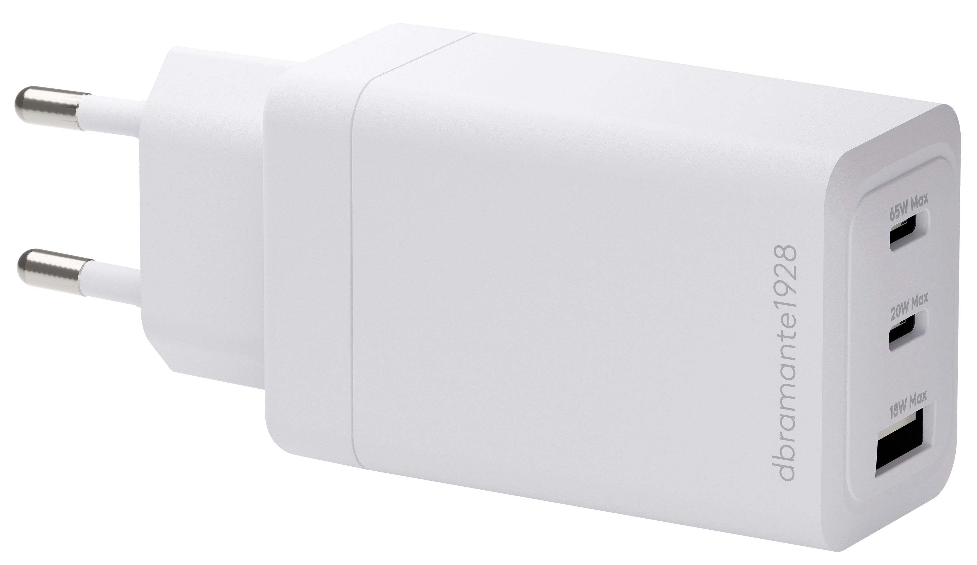 dbramante1928 re-charge IT - EU W. Charger - 2xUSB-C 65W + 1xUSB-A - W. Charger type: Indoor, Power source type: AC, Charger compatibility: Laptop, Smartphone, Tablet, USB Type-C ports quantity: 2, Fast charging. Product colour: White
