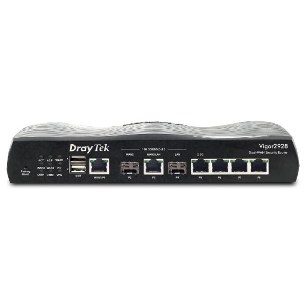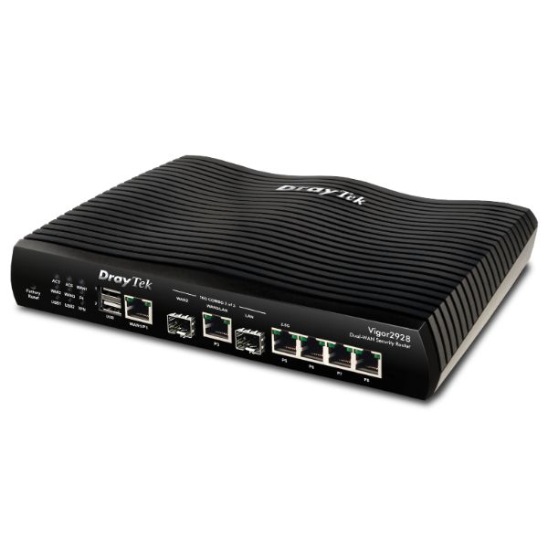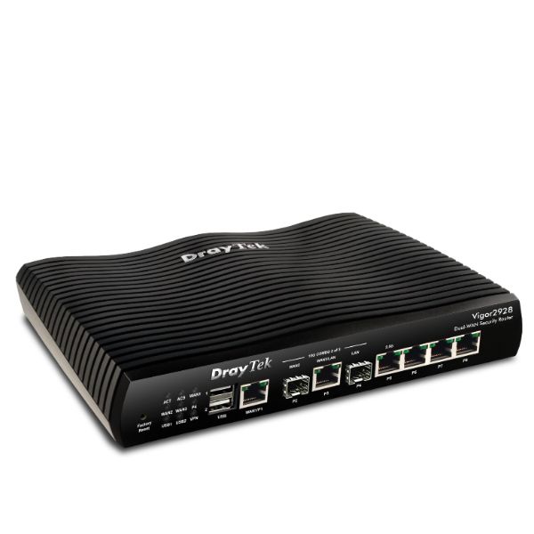 Vigor 2928 10 Gigabit multi-WAN breedband router, 1x SFP+ 10Gbps slot (WAN), 1x 10GbE WAN/LAN, 1x SFP+ 10Gbps slot (LAN), 1x 1GbE LAN/WAN, 1x 2.5GbE LAN, 3x GbE LAN 5 Gigabit LAN, 2 USB poorten, 50 VPN LAN-LAN IPSEC, DrayOS