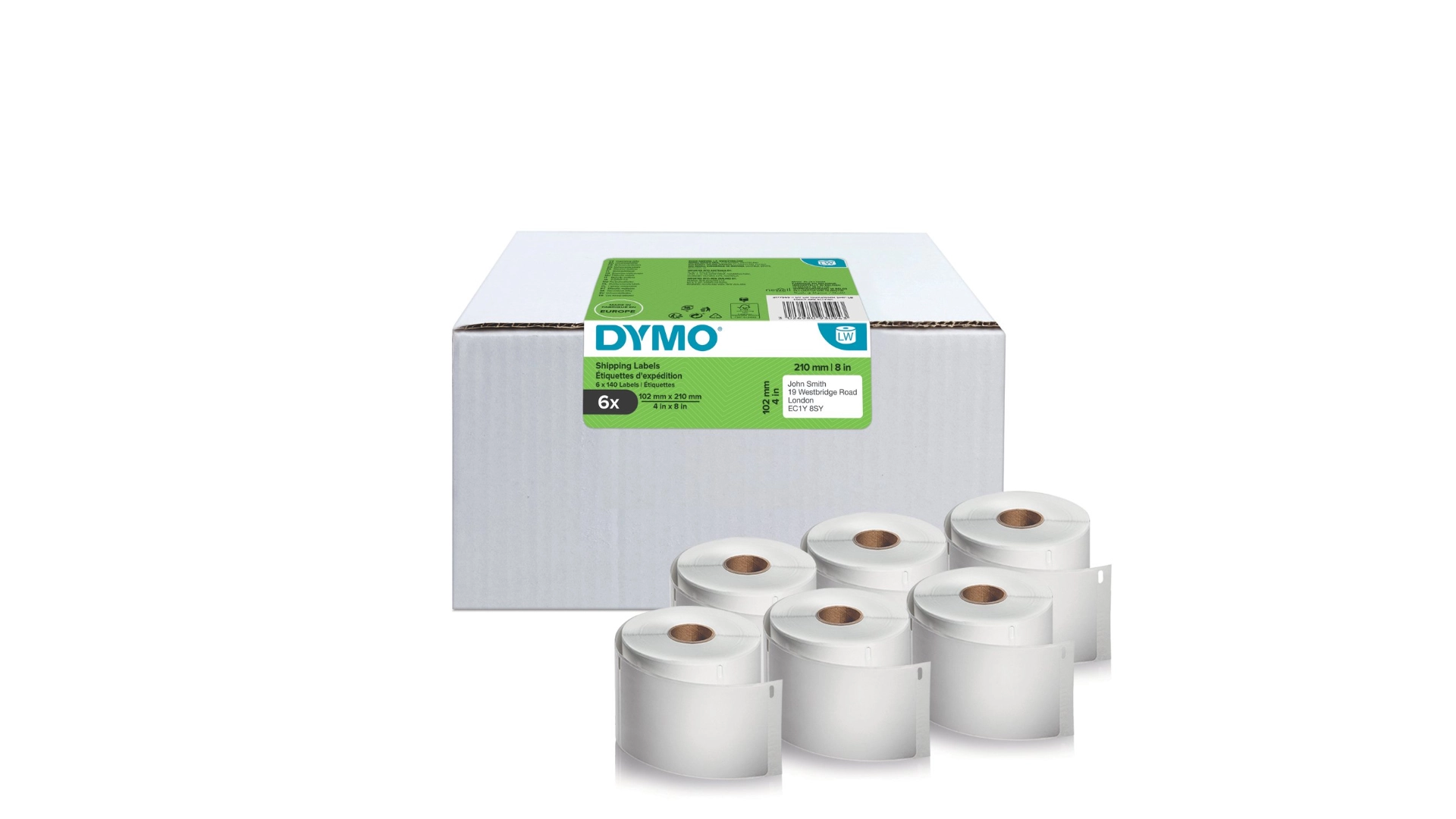 DYMO 2177565. Product colour: White, Label type: Self-adhesive printer label, Type: Die-cut label. Sustainability certificates: Forest Stewardship Council (FSC), Doesn't contain: Bisphenol A (BPA). Label width: 10.2 cm, Label height: 21 cm, Weight: 6 kg. Labels per pack: 840 pc(s), Labels per roll: 140 pc(s)