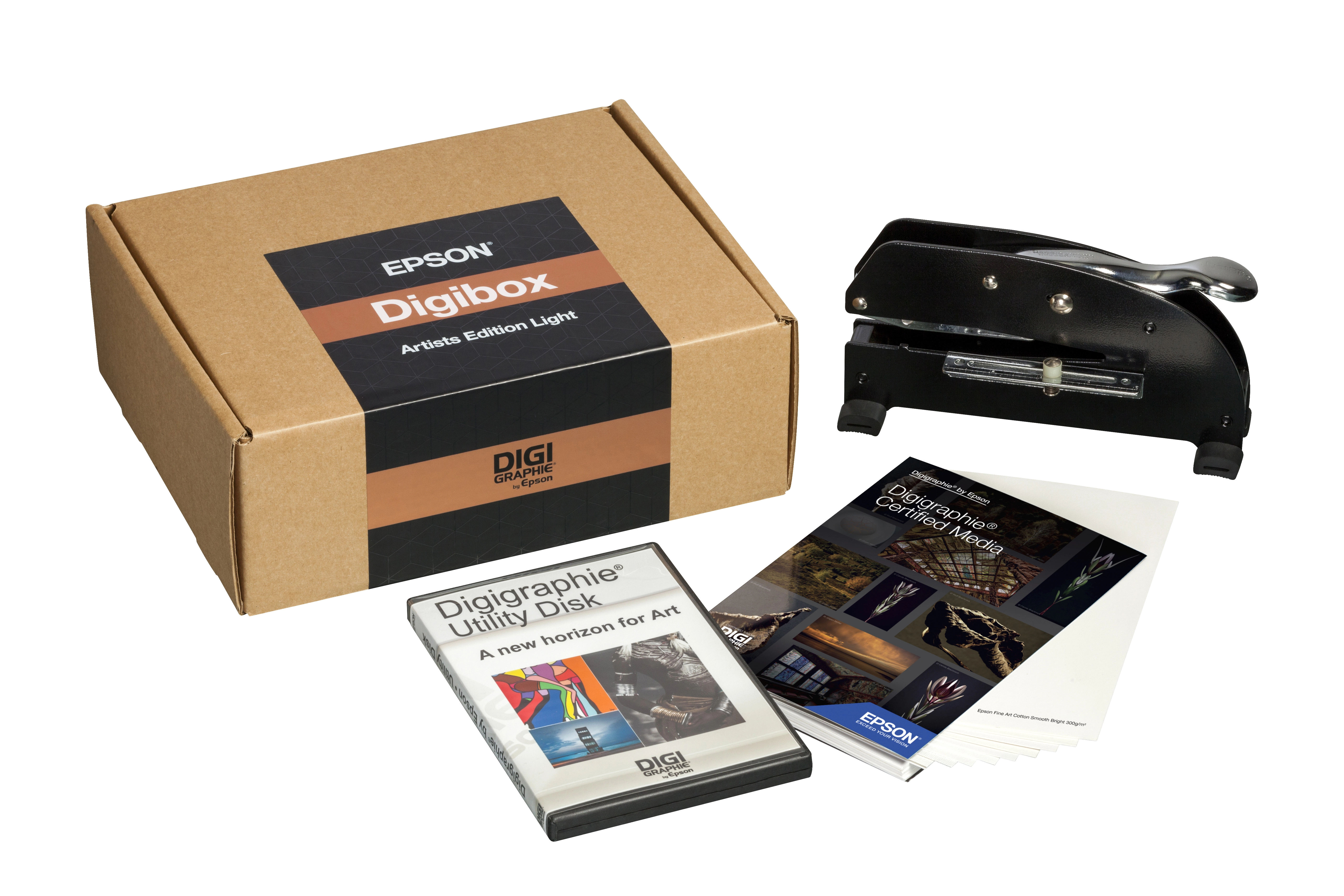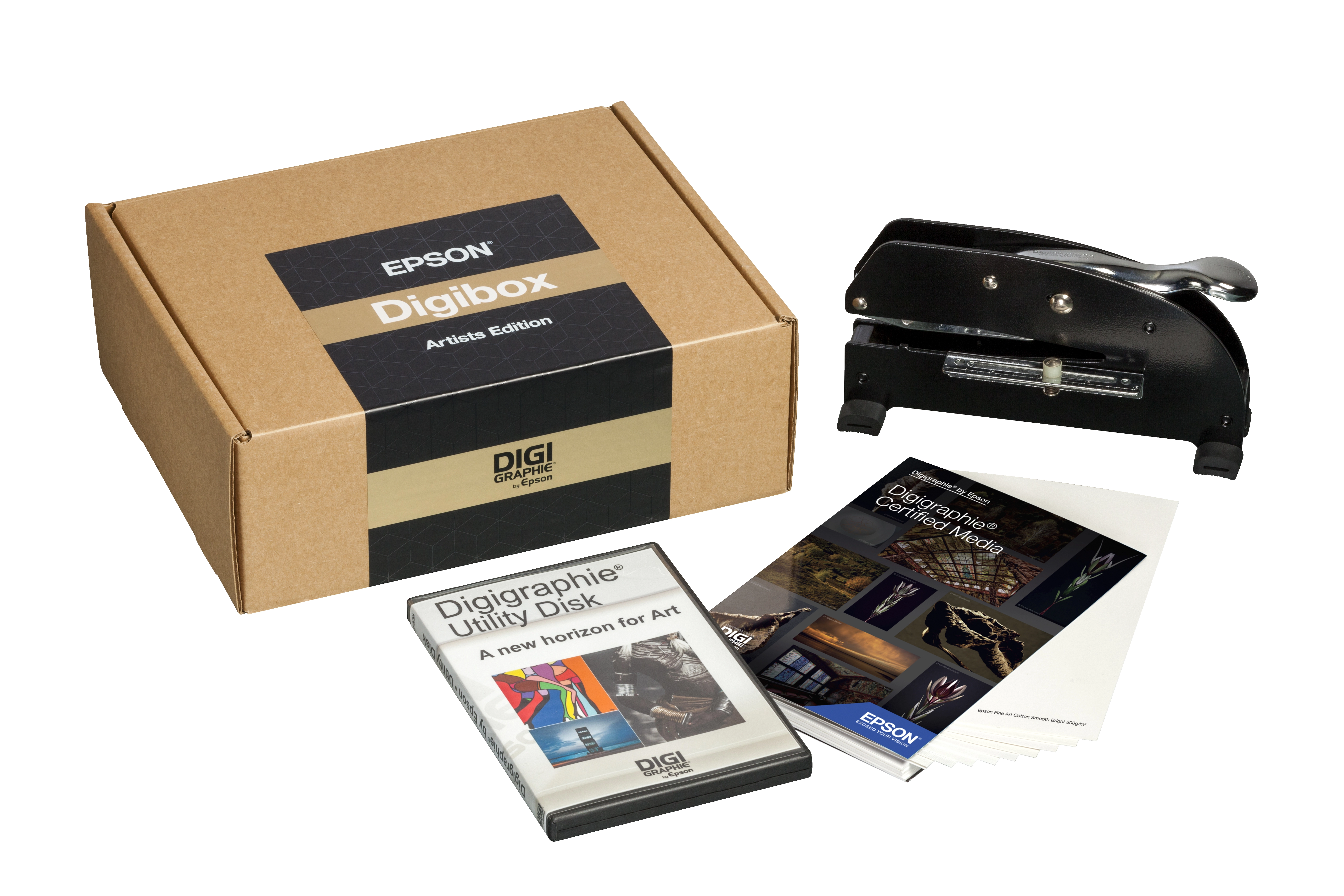 Digibox is the start up kit for Digigraphie artists to know more about Digigraphie program and start producing the first Digigraphies art work. This package contains the following items: Digigraphie Tools CD, Embossing Die, Certified Media Swatch Book and it can be delivered together with the Cold Stamp (produced by the Digigraphie certified dealer) and the self inking stamp. Stamps may be delivered on a later stage, and not initially included on the Digibox.
