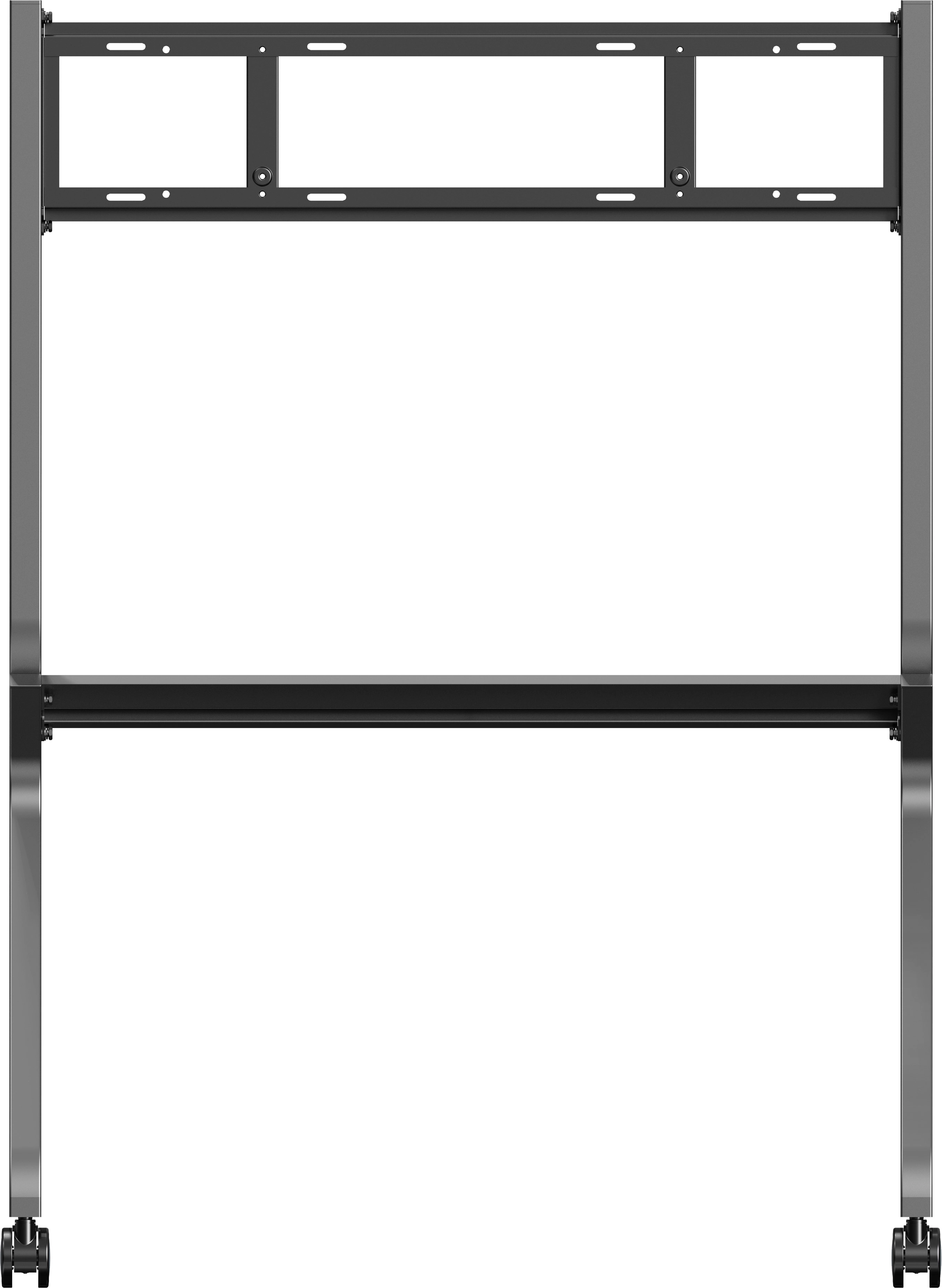 A robust anti-collision mobile stand designed for large format (Touch) displays from 55" to 86", supporting up to 100kg with VESA mounting up to 800×600mm. Ideal for classrooms, offices, and meeting rooms. The trolley comes with pre-drilled holes for quick and accurate installation. Depending on the size of the display, three mounting positions are recommended to ensure optimal viewing height. In addition it features smooth-rolling 3-inch omni directional lockable wheels, an integrated media shelf/ accessory tray, and built-in cable management for a tidy setup. The sturdy construction ensures stability during movement and use. Designed for landscape installation (portrait supported for displays up to 700mm wide). Easy to assemble and move, it offers a reliable, flexible solution for modern mobile presentations in any indoor environment.