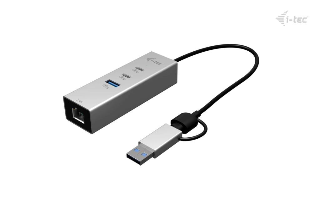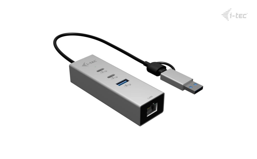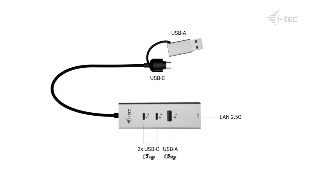 The hub features two USB-C and one USB-A port for connecting peripherals such as external drives, keyboards, or other accessories. It also includes a fast 2.5 Gigabit Ethernet port, providing significantly higher speed and stability compared to standard Gigabit LAN – ideal for working with large data files, online meetings, and streaming.