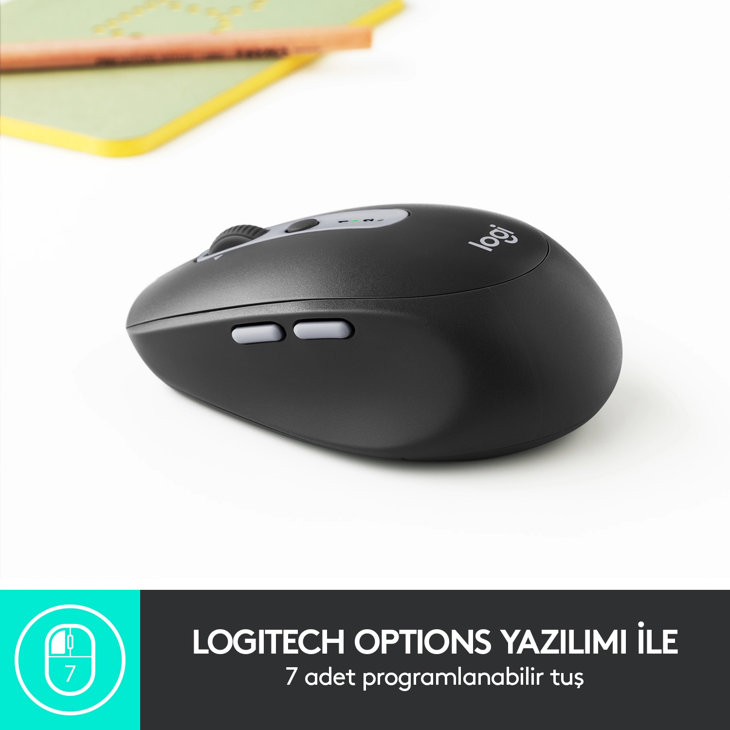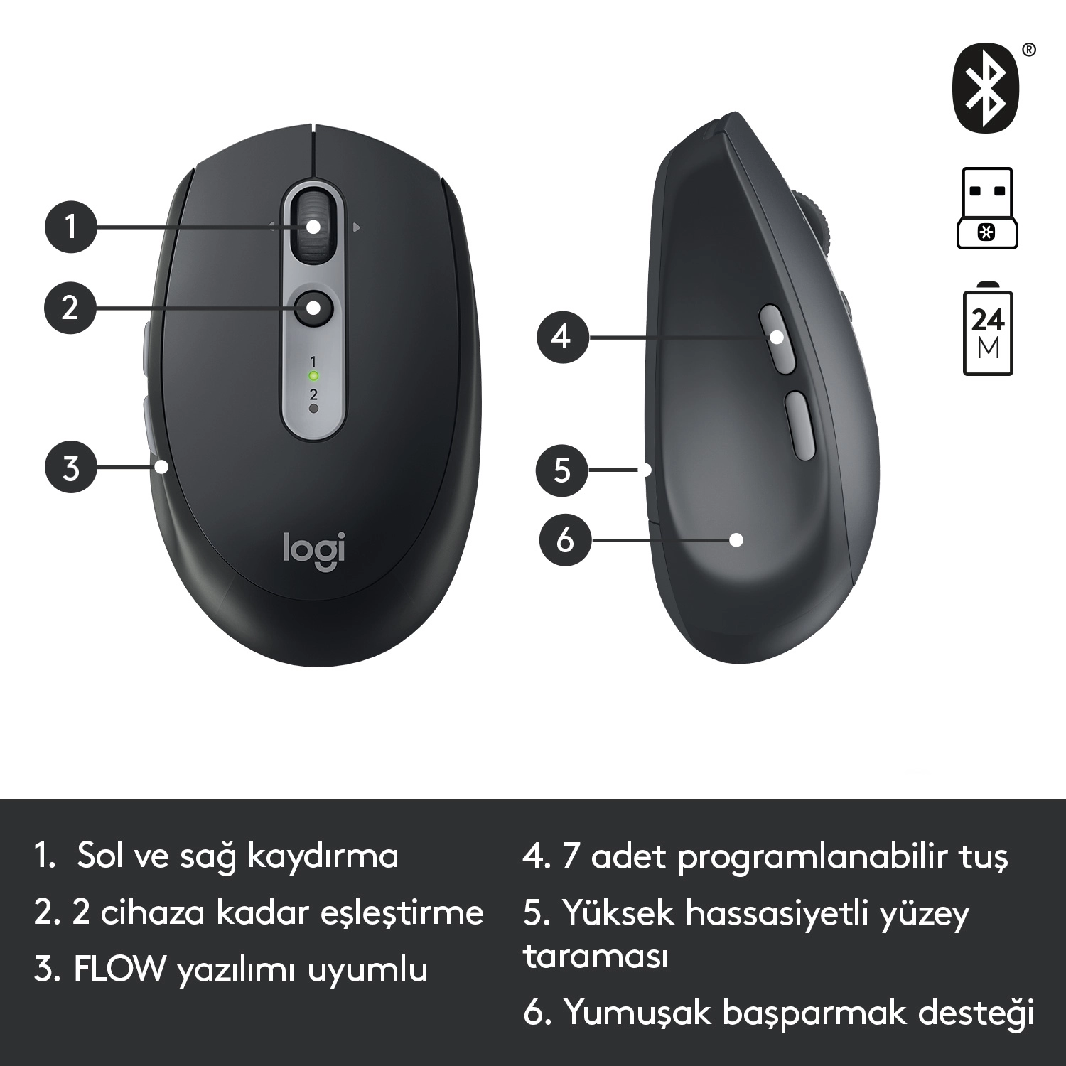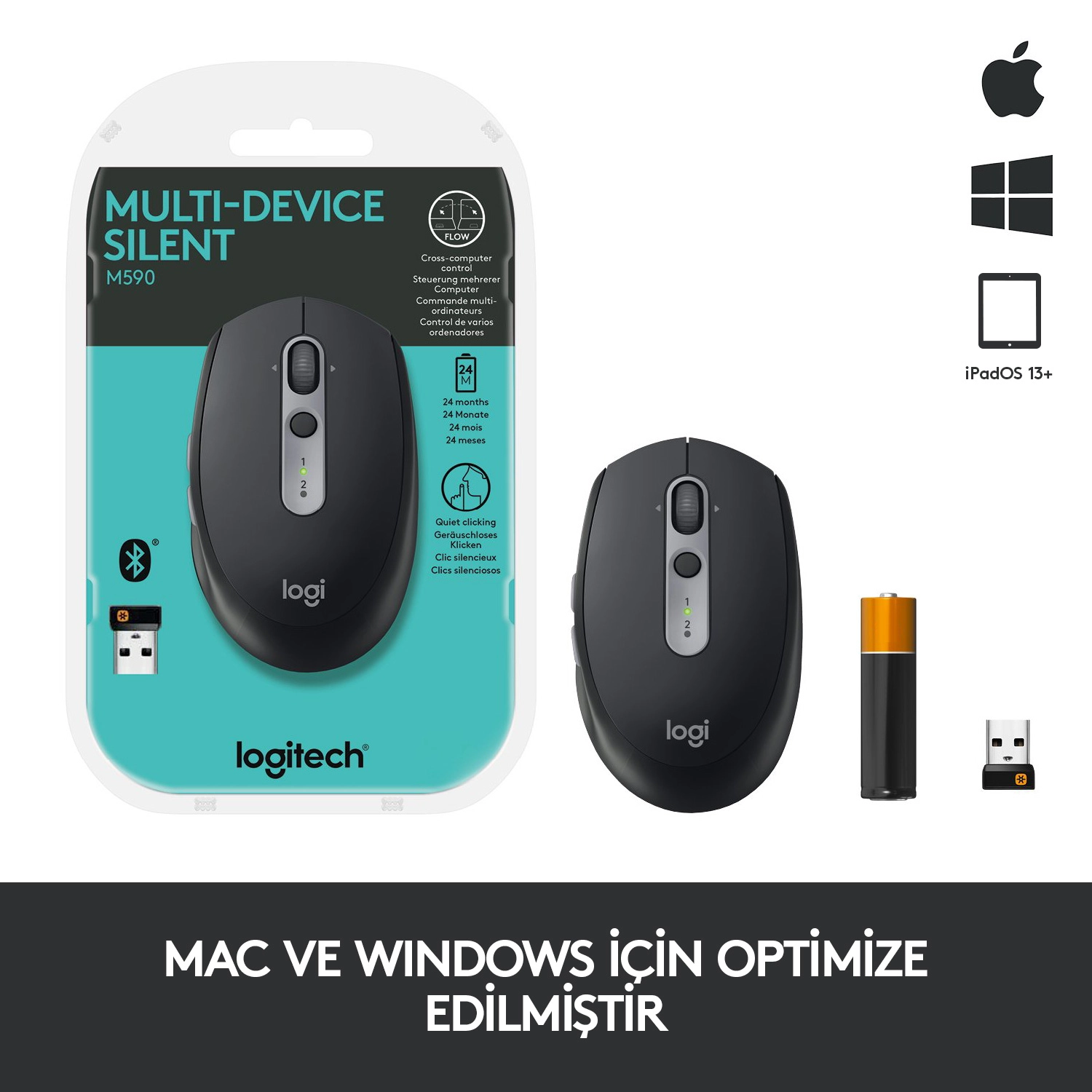 Logitech Wireless Mouse M590 Multi-Device Silent. Form factor: Right-hand. Movement detection technology: Optical, Device interface: RF Wireless + Bluetooth, Movement resolution: 1000 DPI, Buttons type: Pressed buttons, Buttons quantity: 7, Scroll type: Wheel. Power source: Batteries. Product colour: Graphite
