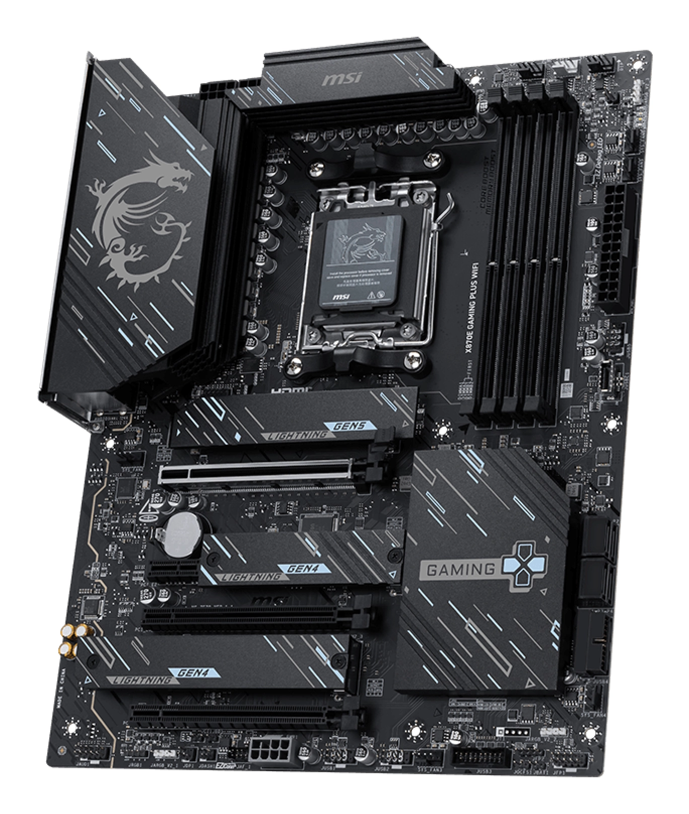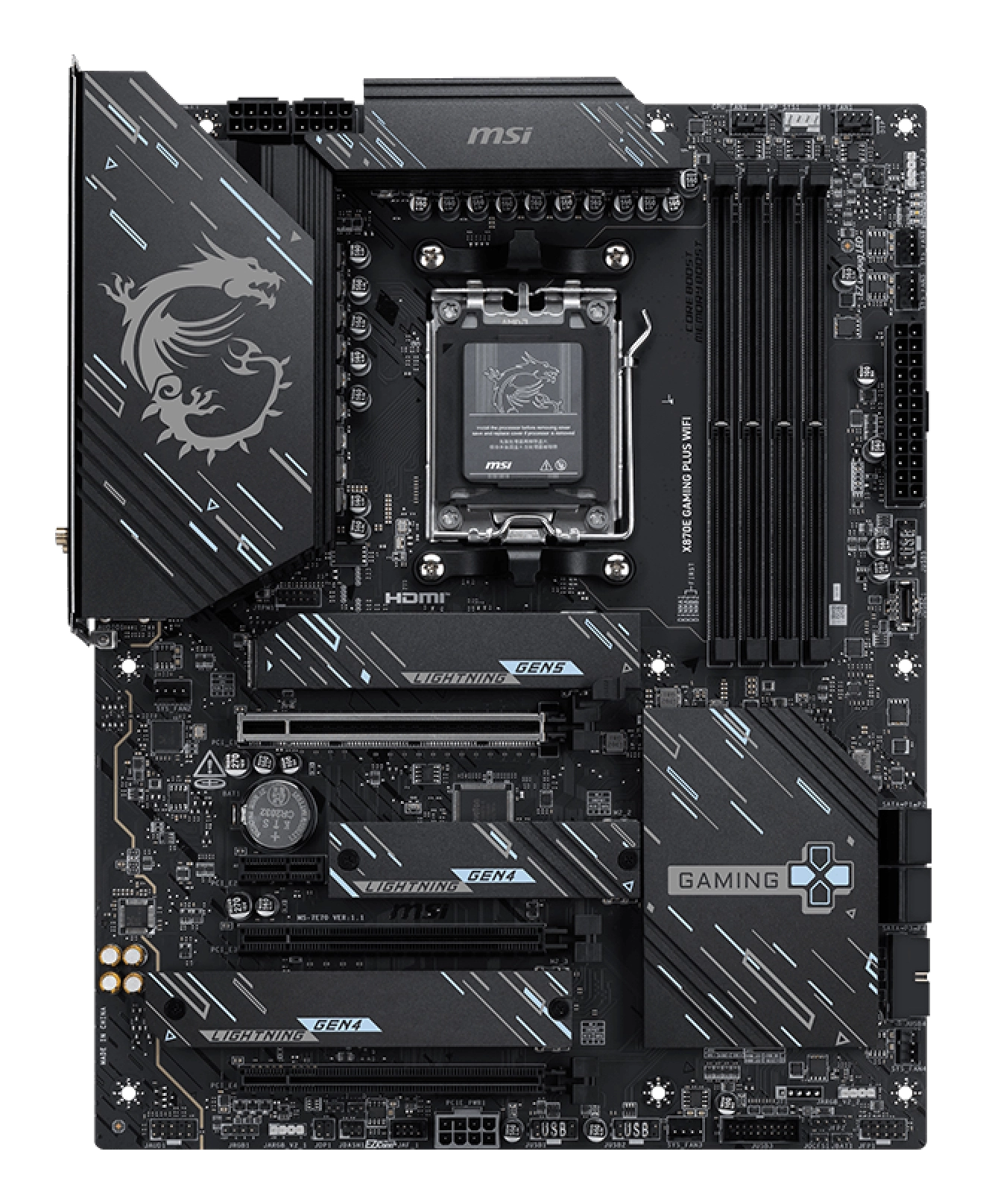 X870E GAMING PLUS WIFI is designed with durable components to provide great gaming experience. Designed with Wi-Fi 7 and 5G LAN, high-speed USB4, PCIe 5.0 solutions, Supplemental PCIe Power and exclusive EZ DIY features, it's ready for 24/7 non-stop gaming of AMD Ryzen™ 9000 series processors.