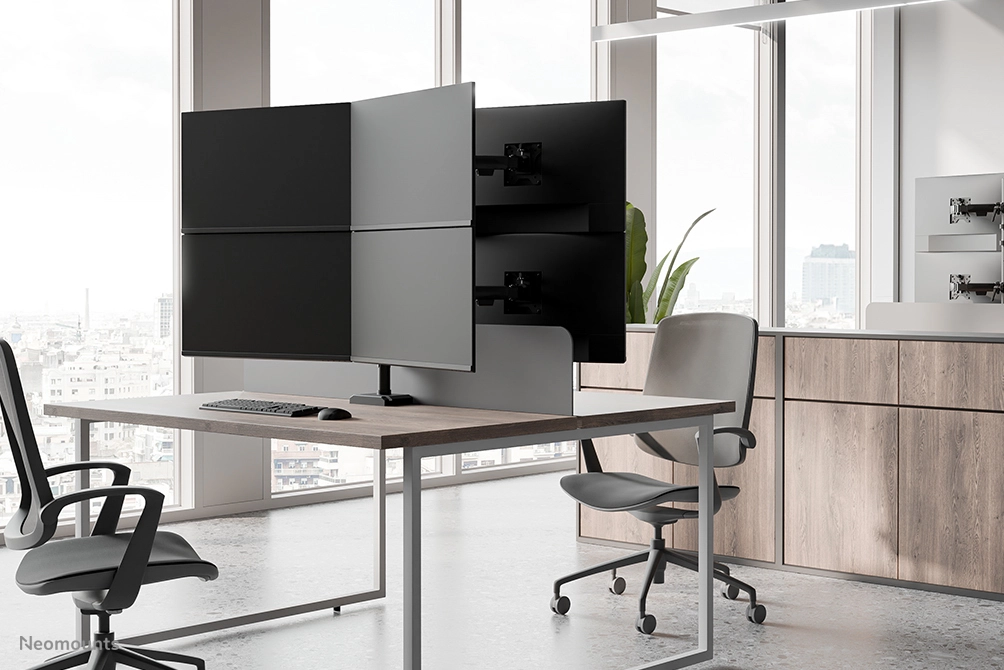 The Neomounts DS60-600BL2-2 provides a professional and durable solution for a stacked four-screen configuration. This quadruple monitor arm is constructed with a solid vertical pole and supports four monitors up to 32" with a weight capacity of 8 kg per screen. The full motion technology allows for precise adjustments in tilt, rotation, and swivel for each monitor, ensuring a correct ergonomic posture and optimal workflow efficiency across all displays.