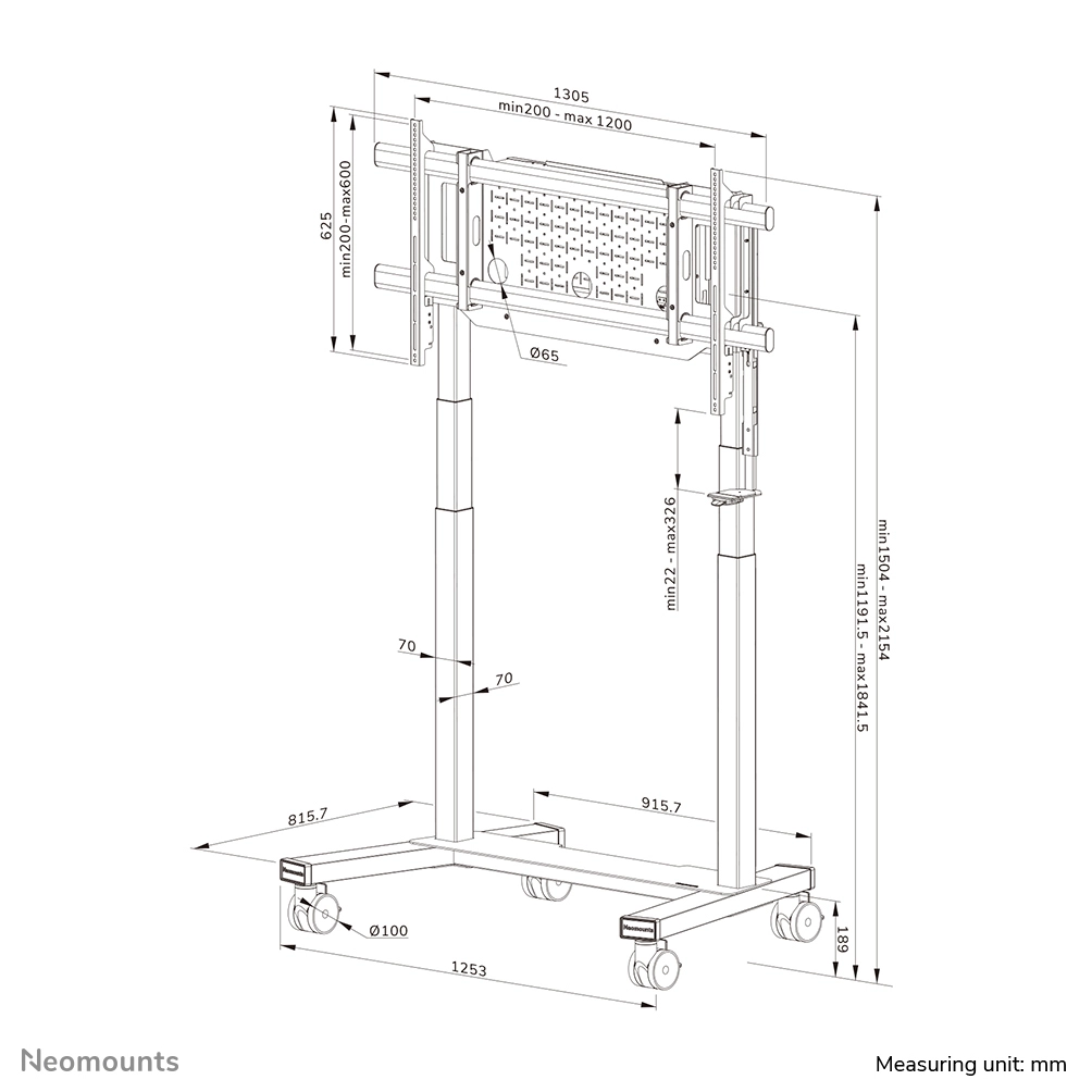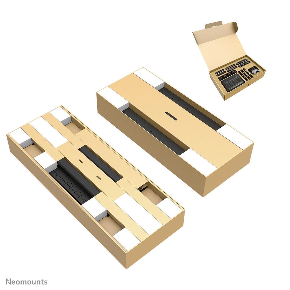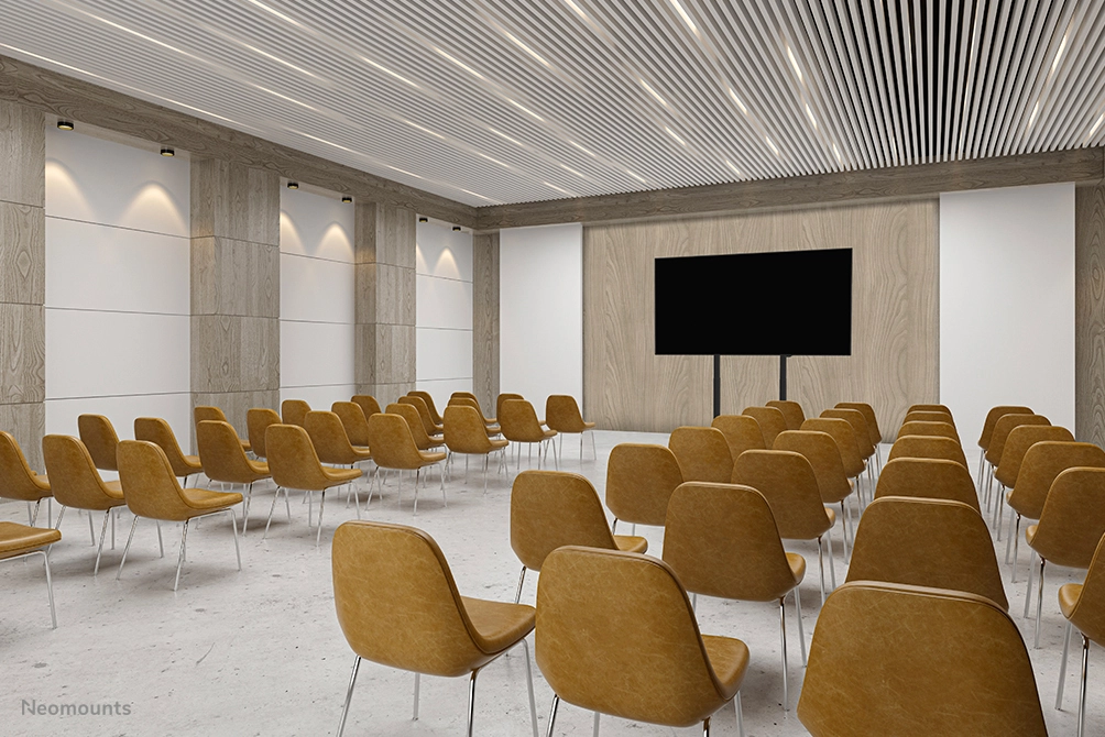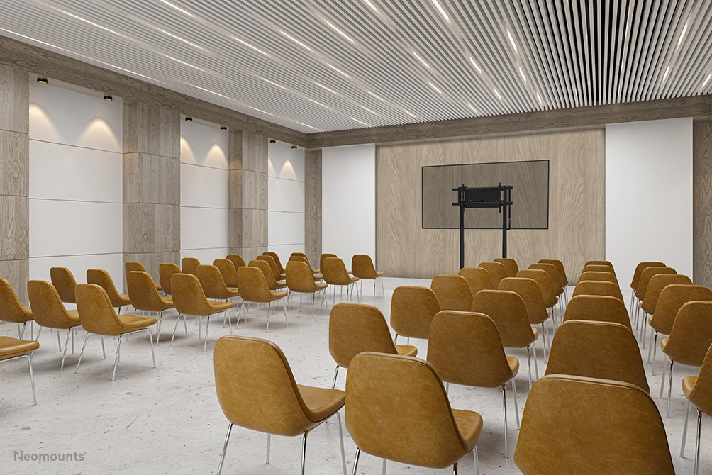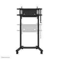 The Neomounts FL55-975BL1 MOVE Lift XL is the ideal motorised trolley for large displays up to 115" and 160 kg. The heavy-duty stand offers 65 cm of motorised height adjustment, allowing both seated and standing presentations at the perfect viewing height and raising the screen above the audience. Operation is smooth and precise via a conveniently positioned control panel. The anti-collision system ensures safe height adjustments, and the brackets can be locked with a padlock (not included) for extra security. A ventilated, lockable hardware compartment with a cable opening can be optionally installed to provide clean and secure equipment storage.