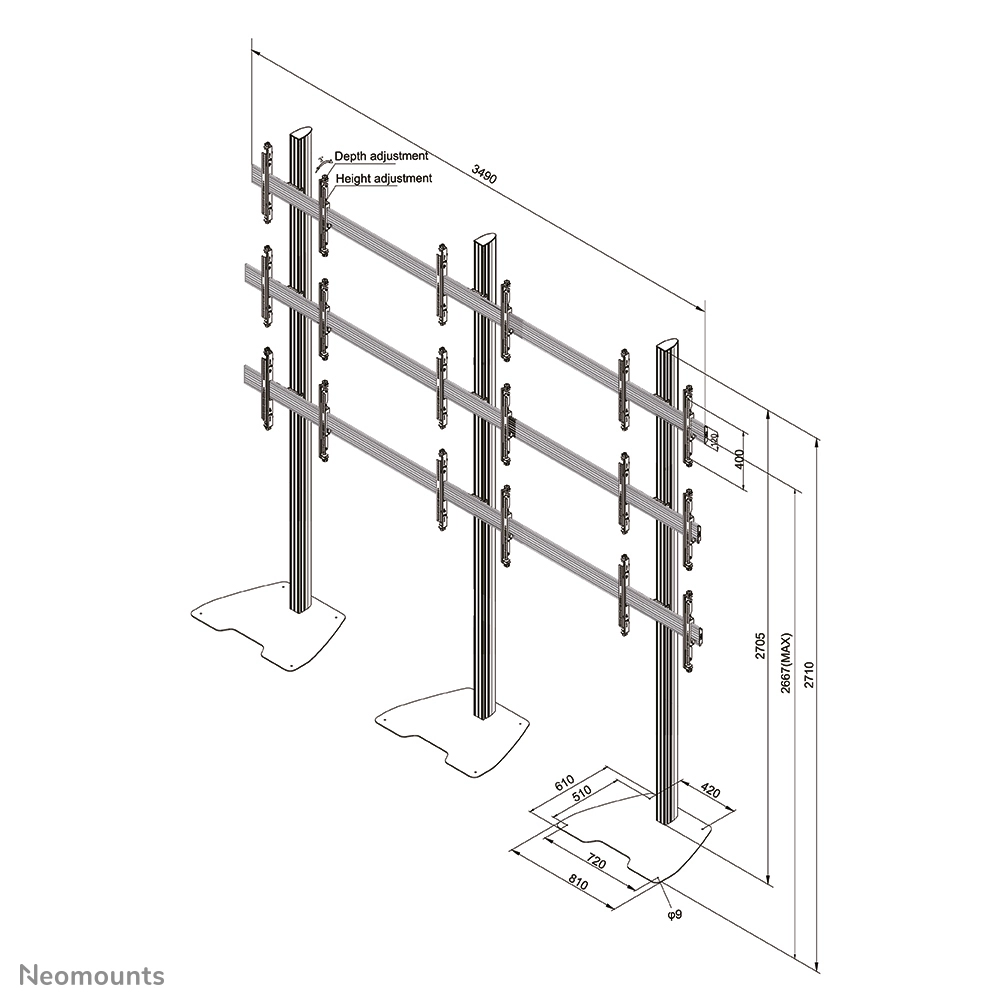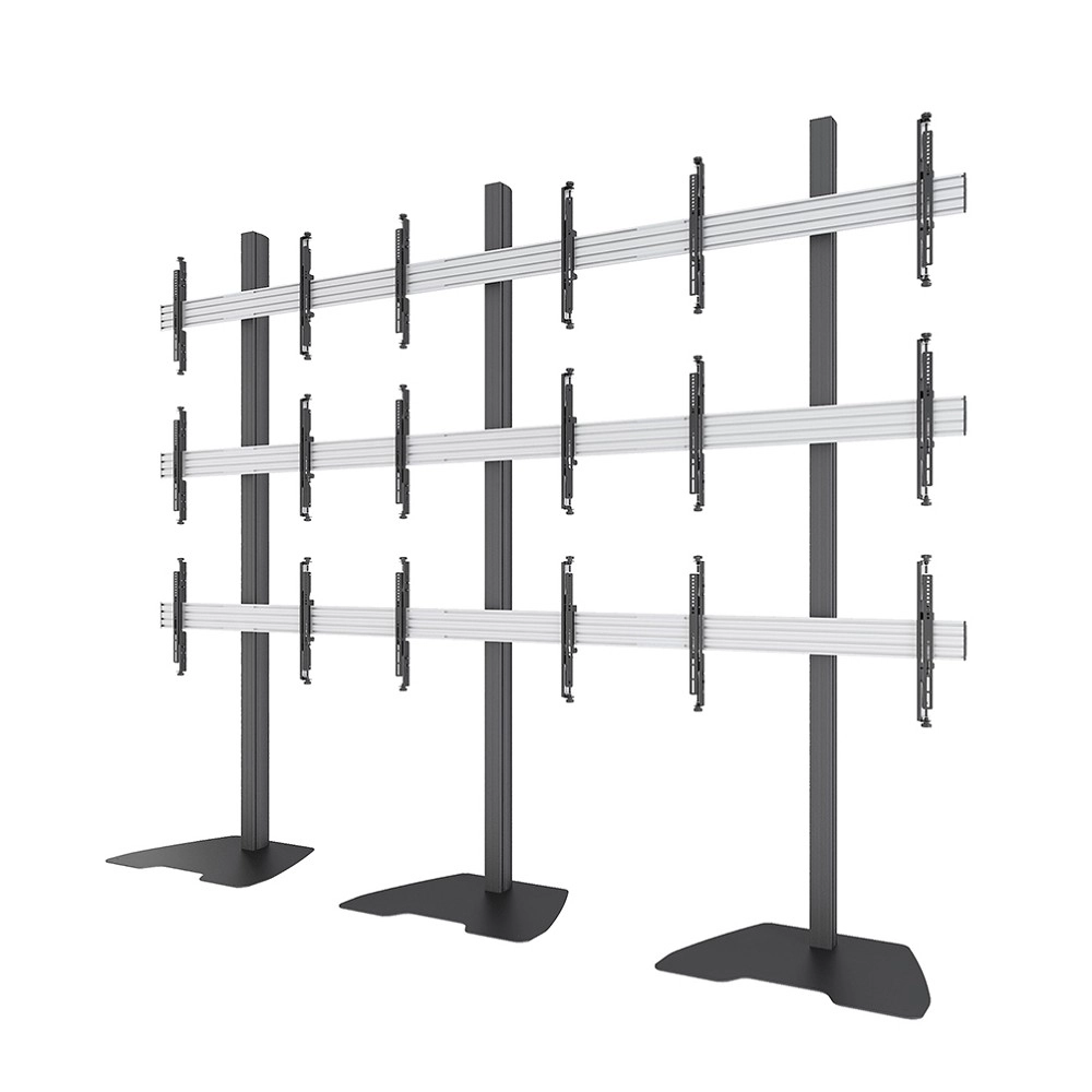 Neomounts Pro NMPRO-S33 is suitable for nine screens up to 55"/65". The weight capacity of this product is 30 kg per screen. The stand is suitable for screens that meet VESA 100x100 to 400x400mm (65") or VESA 100x100 to 600x400mm (55"). An innovative cable management conceals and routes cables from mount to flat screen.
