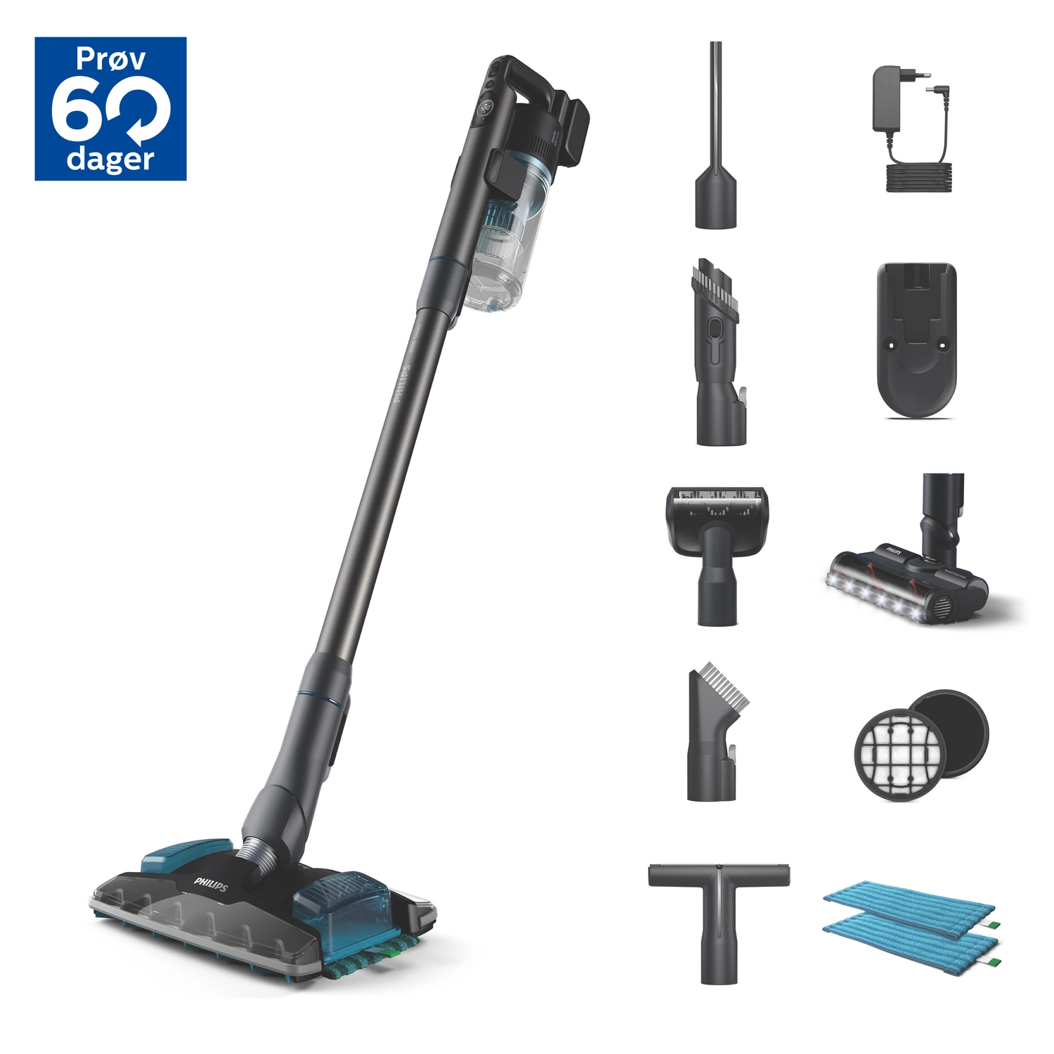 Philips 8000 series XC8057/01. Product type: Stick vacuum, Dust container type: Bagless, Product colour: Aqua colour, Black. Cleaning type: Dry&wet, Vacuum air filtering: Cyclonic, Dirt separating method: Cyclonic/filtering. Handle type: Loop handle. Power source: Battery, Battery technology: Lithium-Ion (Li-Ion), Battery voltage: 25.2 V. Package width: 200 mm, Package depth: 320 mm, Package height: 750 mm