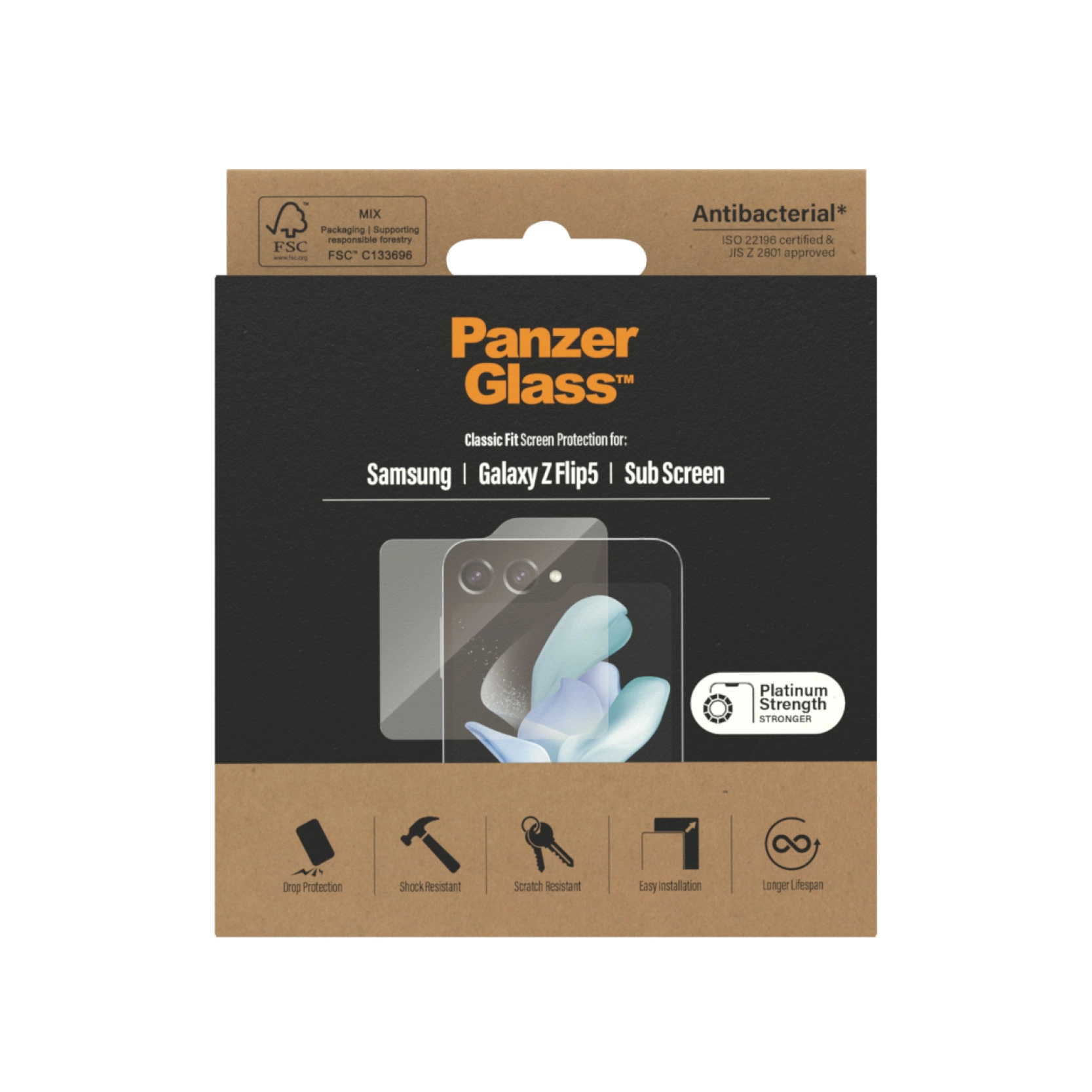 The Ultra-Wide Fit screen protector covers the entire front surface of your phone. It comes in FSC™-certified packaging that can be recycled.