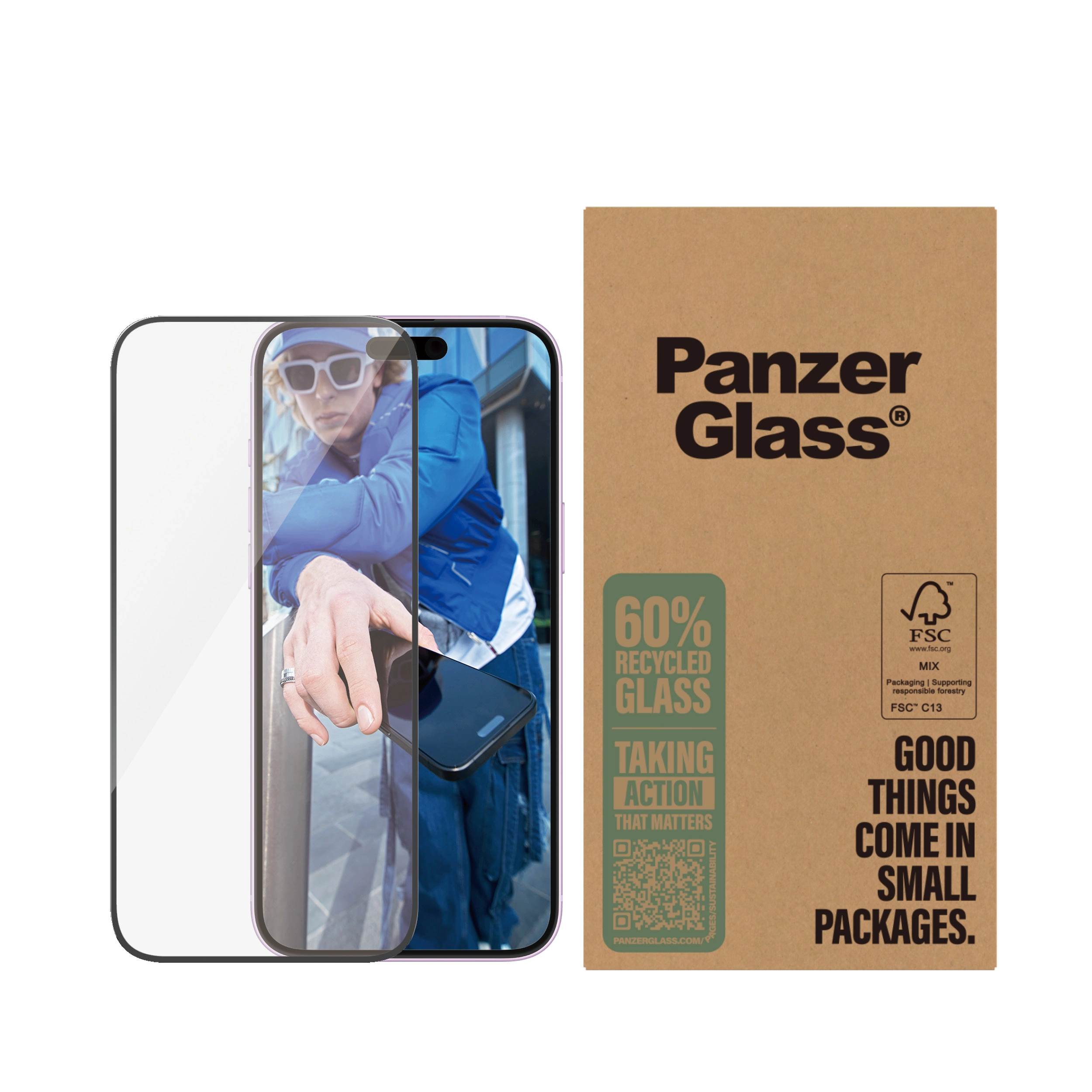 This screen protection prolongs the lifetime of your phone so that one day you can pass it on to someone else who will love it just as much as you do. It’s the new circle of phone life and one way of working toward a more sustainable future. Another is to use less packaging. In 2024, we reduced the amount of paper in our PanzerGlass® core product packaging design by an average of 66%*. And like all our products, it comes in a box made of recyclable FSC™-certified paper.