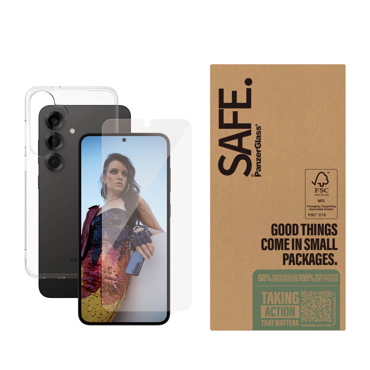 Be super fresh. Be superfly. Be super SAFE. When life is tough (and pavements too), this 2-in-1 protection combo from SAFE. by PanzerGlass® comes to the rescue. The combo features a screen protector made of 60% recycled material and a soft, transparent TPU case made of 100% recycled plastic, keeping your precious phone SAFE. from pocket plunges, dance floor mishaps, selfies gone wrong, and your everyday fumbling, dropping and screen cracking.