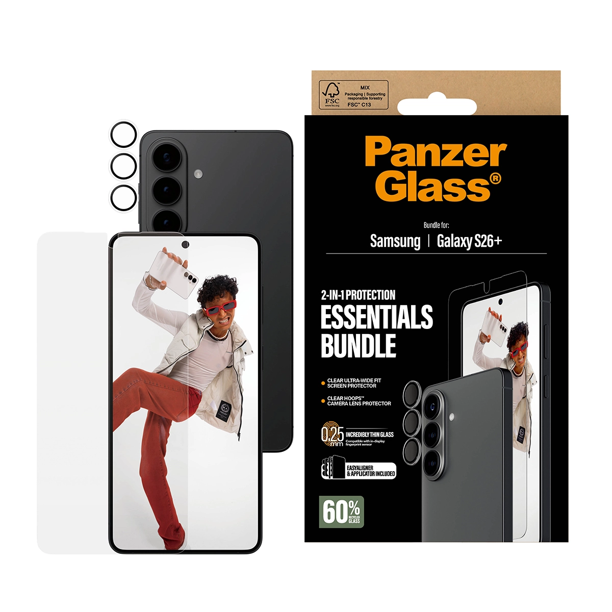 Love your camera? Love your screen? Then this 2-in-1 protection pack from PanzerGlass® has your name written all over it. The Ultra-Wide Fit Screen Protector, made from 60% recycled material, and the Hoops® Camera Lens Protector keep your screen and lenses safe from accidental bumps against sharp-edged table corners, crushing falls onto stone-hard pavements, and other hazards of everyday life. The screen protector even has a smudge-free coating with an antibacterial effect that reduces traces of fingerprints.