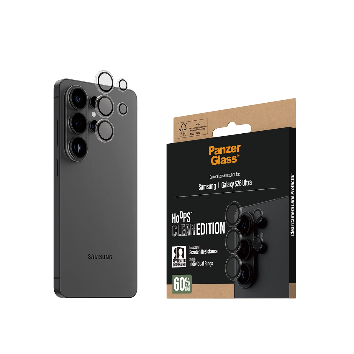 No ”Oops!” with Hoops! The PanzerGlass® Hoops Camera Lens Protector keeps your camera lenses safe from accidental drops on stone-hard floors, bumps against sharp corners, and the screeching kiss of keys in your pocket. The slim profile optic rings are equipped with scratch-and shock-resistant glass and a metal frame that protect your lenses as well as looking great. And if you’re worried about image distortion, you can rest easy: Hoops don’t affect the clarity of your lenses or the quality of your photos – they just give you a bit more peace of mind. The optic rings are designed for easy application and perfect fit. They are equipped with a silicone adhesive along the edges and come with an easy-to-use applicator that makes installation so simple that most people can do it on the first try! And remember: Once Hoops are installed, you’ll never again fear the sight of your phone tumbling to the ground camera first. This may not happen, but if it does, you’ll regret not having clicked “add to cart”. Hoops protect and prolong the lifetime of your phone so that one day you can pass it on to someone else who will love it just as much as you do. It’s the new circle of phone life. By extending the lifespan of our devices, we postpone the need to produce new devices. This is one way of working toward a more sustainable future. And to top it all off, Hoops – of course, comes in a recyclable FSC™-certified box.