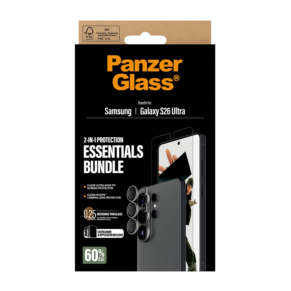 Love your camera? Love your screen? Then this 2-in-1 protection pack from PanzerGlass® has your name written all over it. The Ultra-Wide Fit Screen Protector, made from 60% recycled material, and the Hoops® Camera Lens Protector keep your screen and lenses safe from accidental bumps against sharp-edged table corners, crushing falls onto stone-hard pavements, and other hazards of everyday life. The screen protector even has a smudge-free coating with an antibacterial effect that reduces traces of fingerprints.