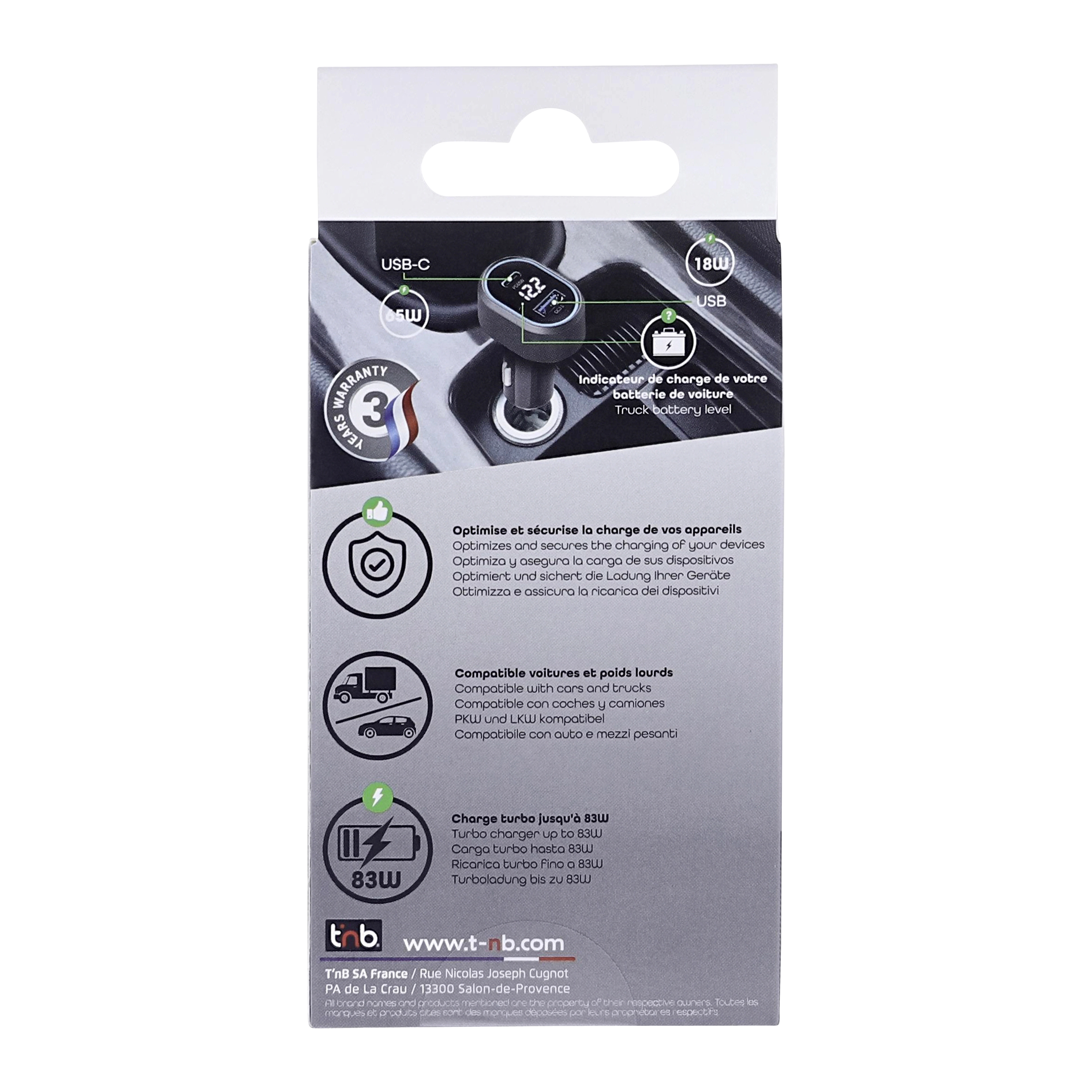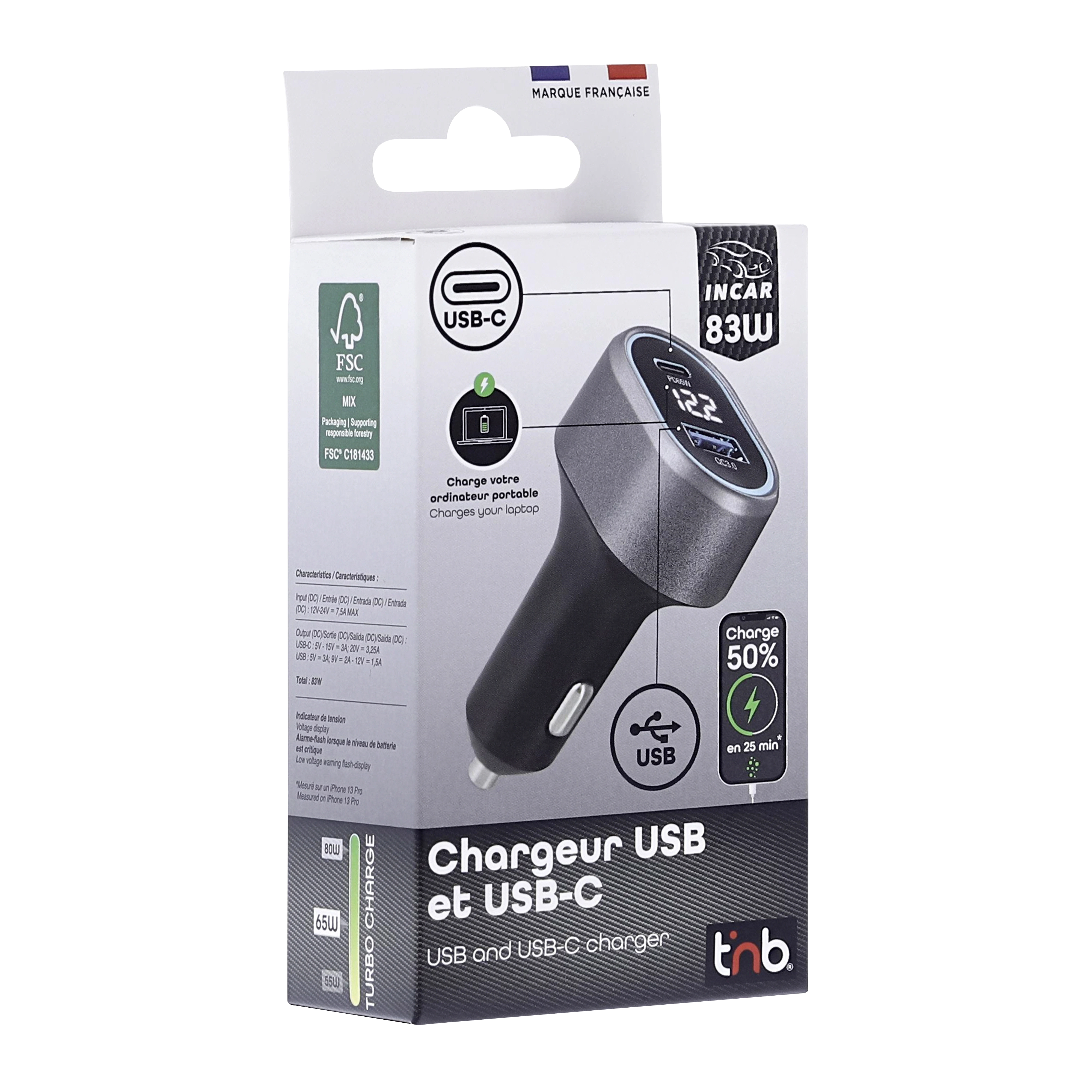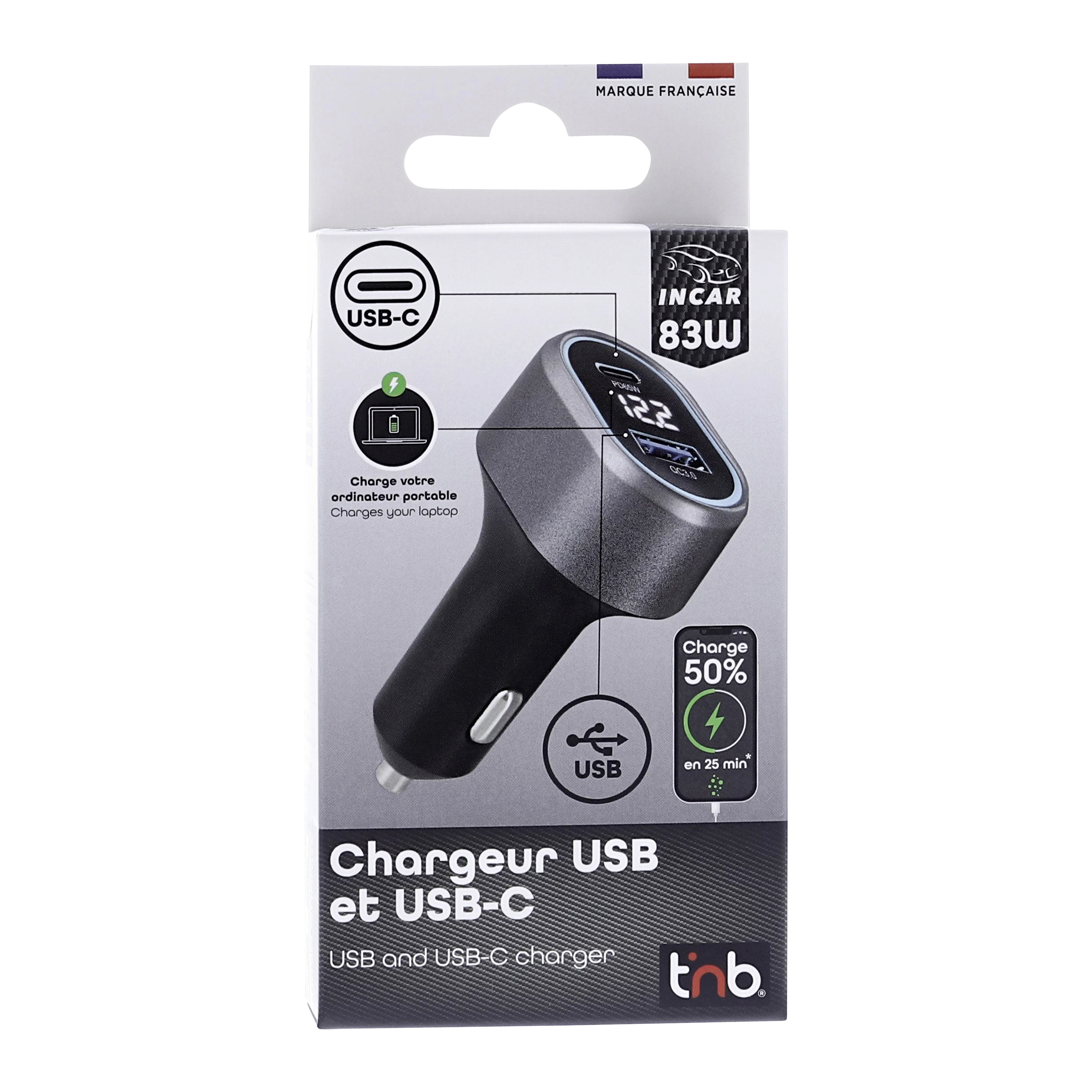 Do you want to quickly charge your phone, tablet and even laptop in your vehicle? Equipped with the latest turbo charging technologies, this high-power cigarette lighter charger gives you the possibility to charge your laptop in your vehicle! The CACPOWER has 2 outputs to quickly charge 100% of mobile devices on the market: - USB-A QC3.0 port for a power of 18W - USB-C PD port with a power of 65W: capable of charging a smartphone, a tablet and a laptop (<17 inches) The maximum total power of the charger is 83W A digital display is present on the charger and will tell you the voltage of your vehicle. The CACPOWER combines a neat, premium and compact design with high charging power