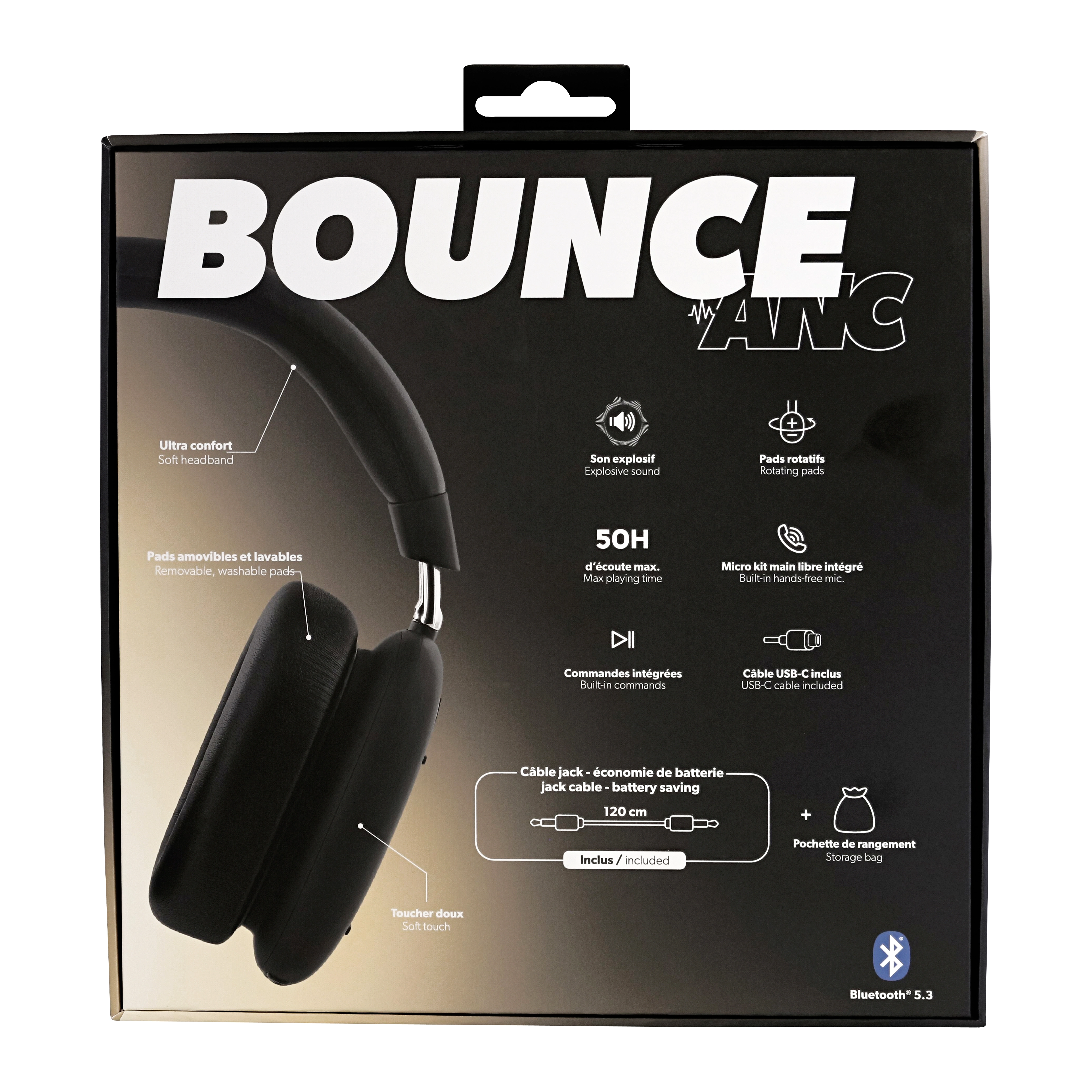 Thanks to their super-encompassing design, BOUNCE headphones offer ultra-powerful natural isolation from outside noise. Combined with active noise reduction technology, which reduces ambient noise by up to 25 dB, BOUNCE headphones truly immerse you in your own musical world.