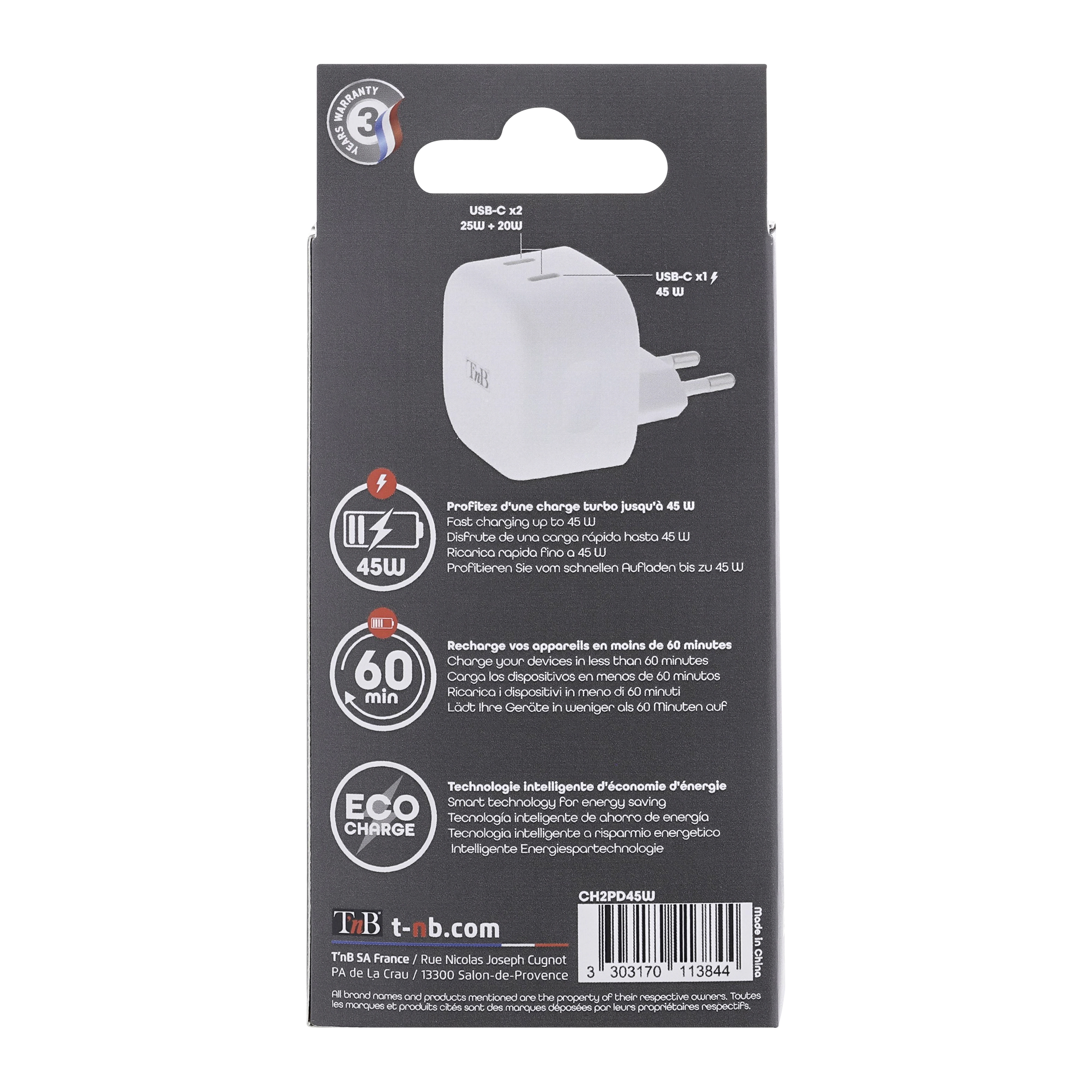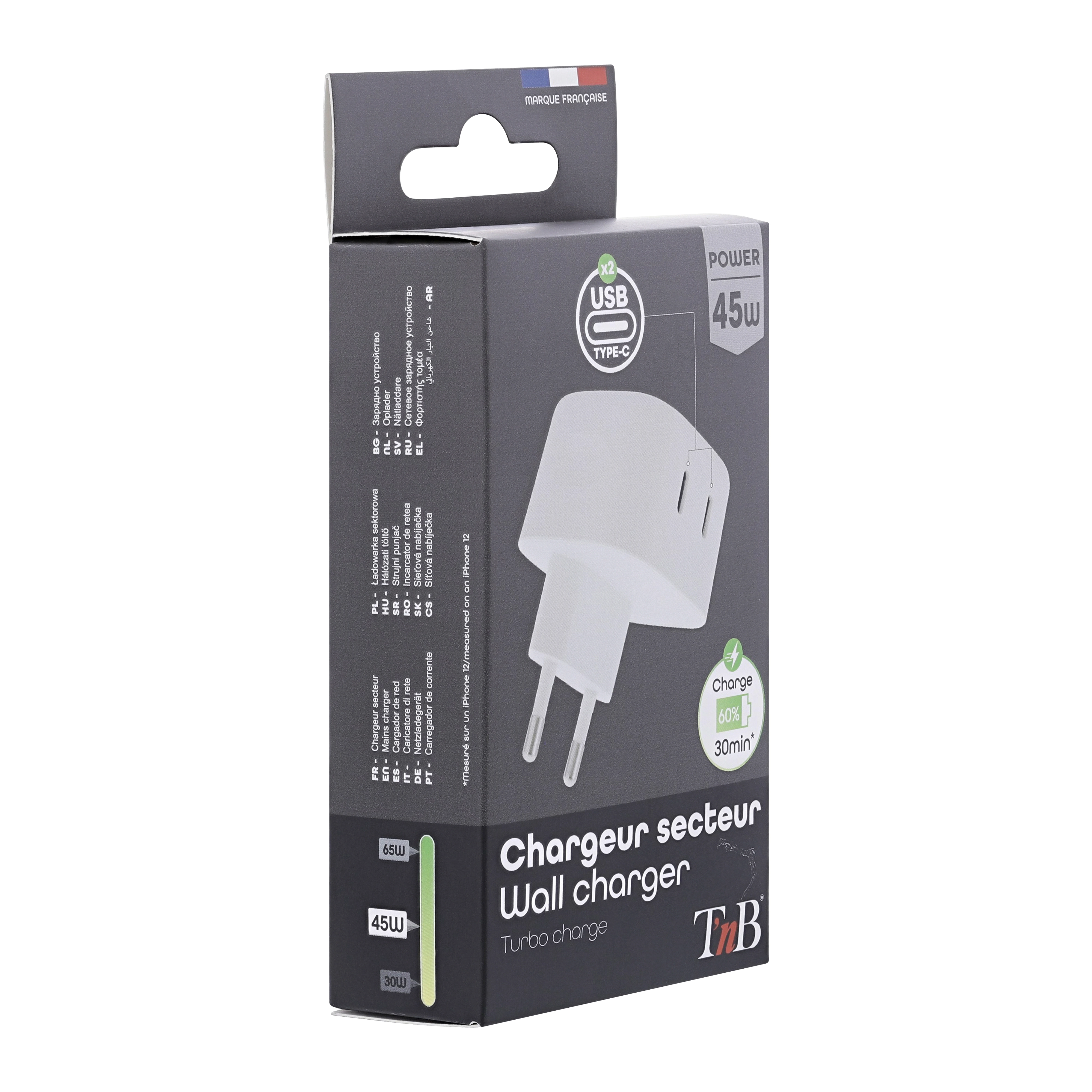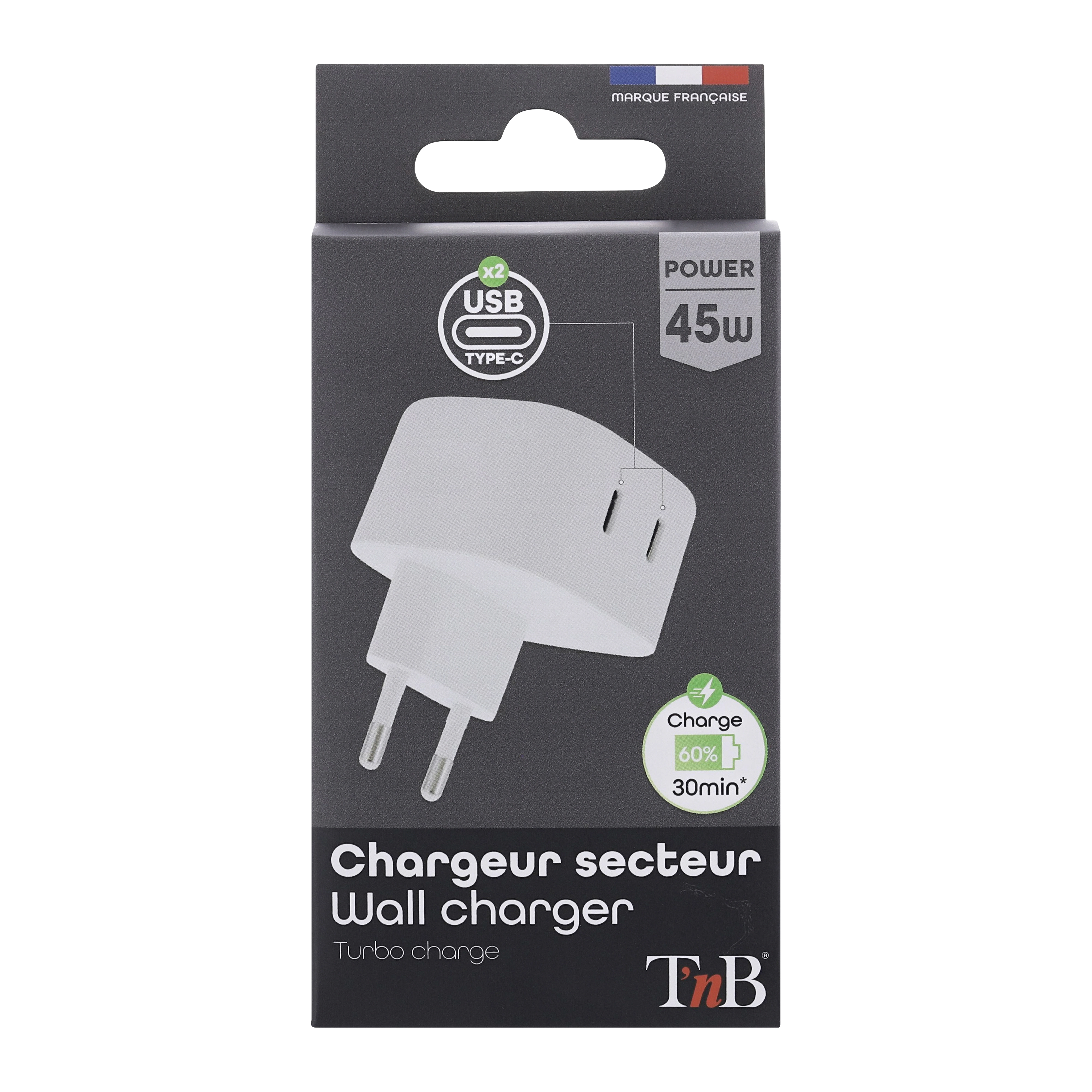 Quickly charge all your mobile devices with USB Power Delivery technology. This charger is compatible with all devices equipped with a USB Type-C port, up to 45W. The charger is equipped with two USB-C outputs When using a single USB-C port, the power delivered will be 45W / using 2 USB-C ports simultaneously will deliver a power of 22.5W The PD function will provide optimal charging only on PD compatible devices. Its 45W power allows you to charge all your devices, from your laptop to your smartphone. The Power Delivery function allows you to charge your compatible devices very quickly, without damaging them thanks to protections against overvoltage, overheating and short circuits. The PD function is compatible with iPhone 12 Mini, 12, 12 Pro, 12 Pro Max, 11, 11 Pro, 11 Pro Max, XR XS, XS max, X, iPhone 8, iPhone 8 Plus.
