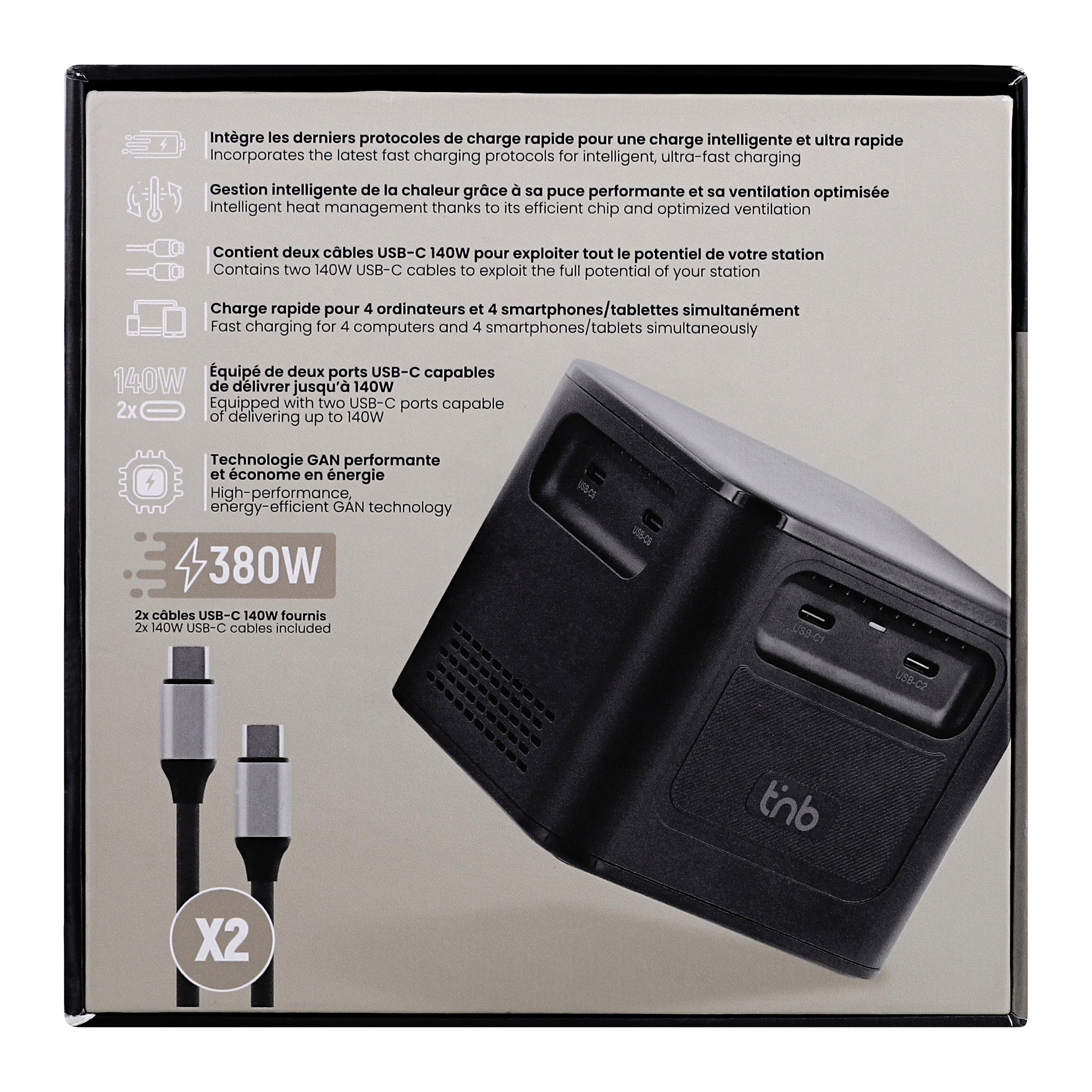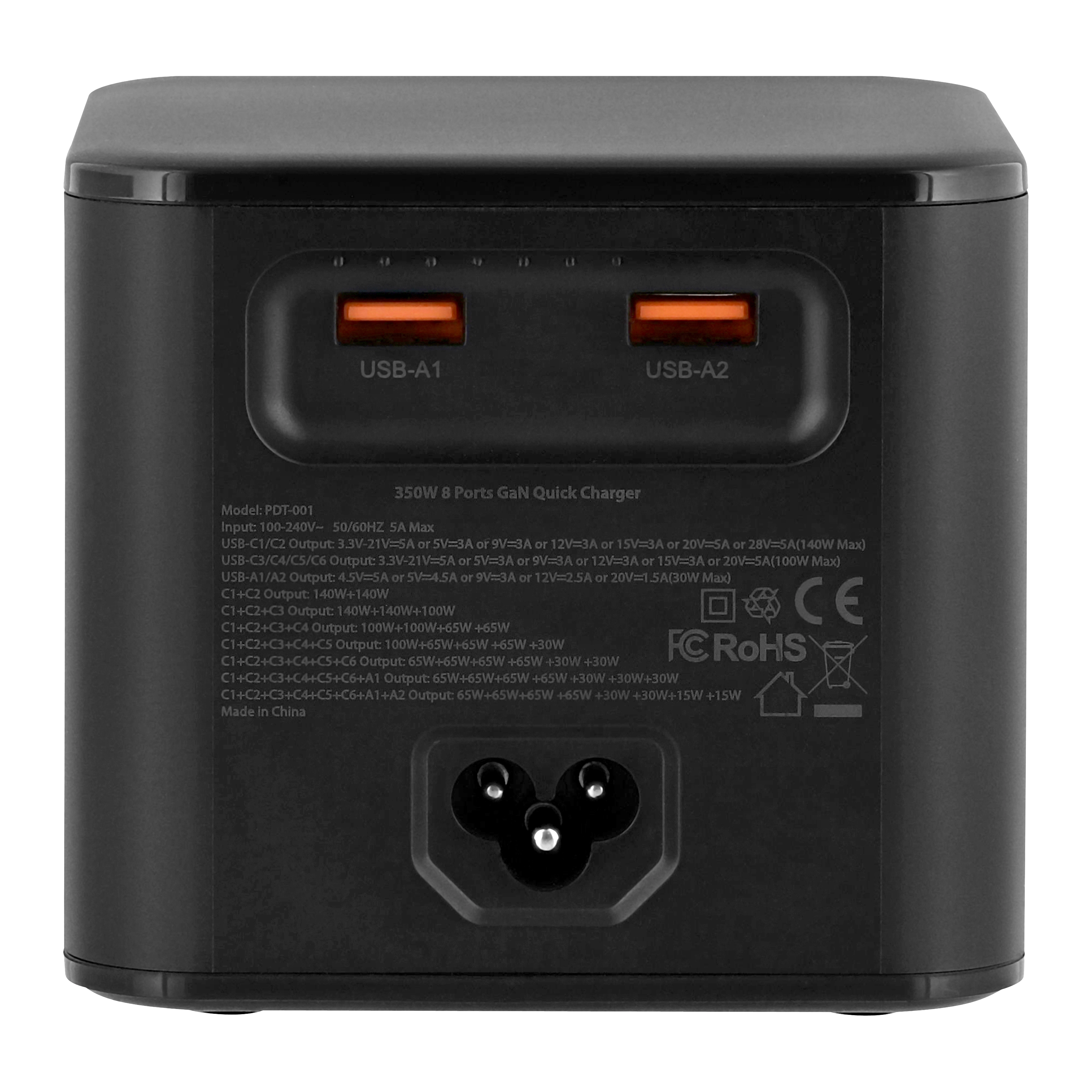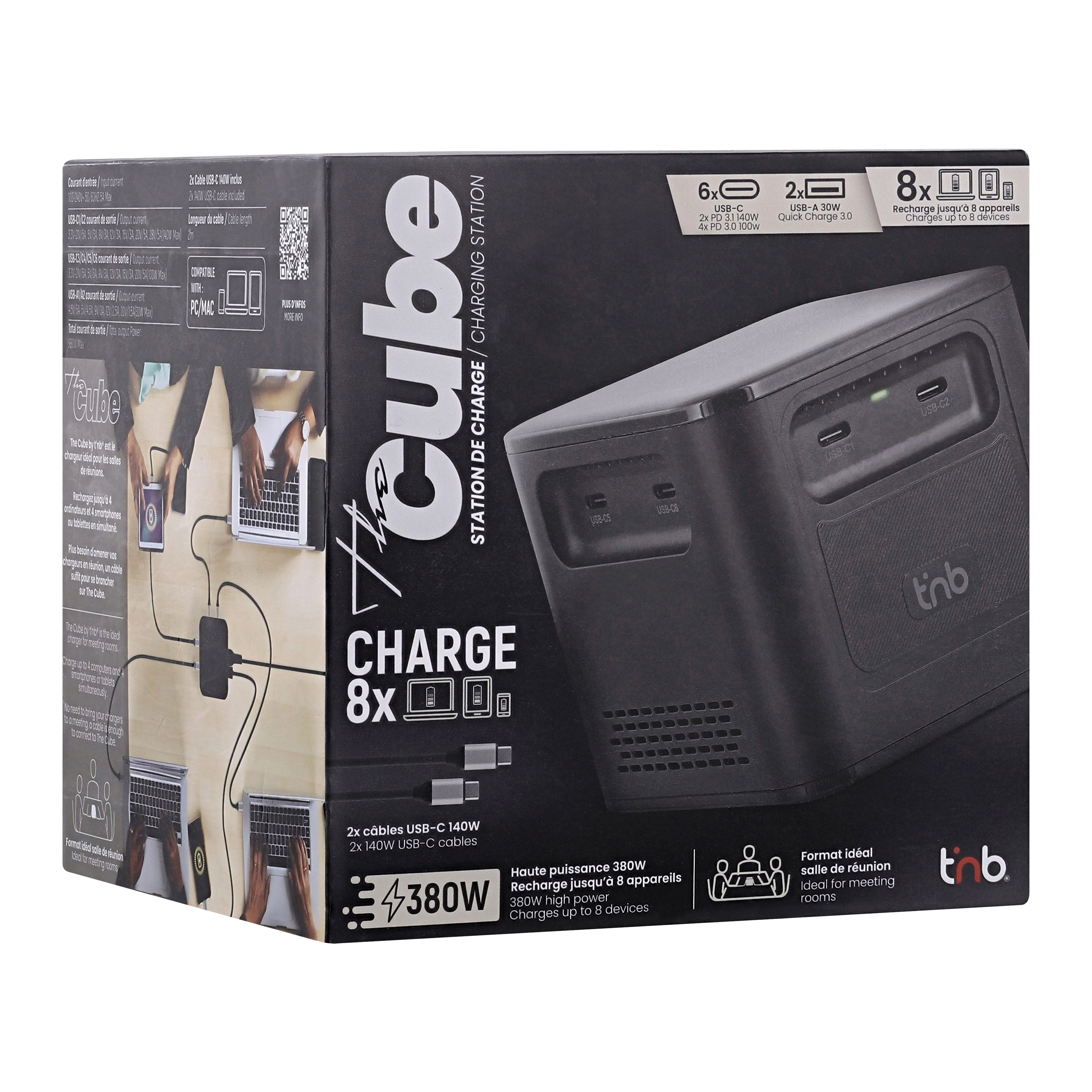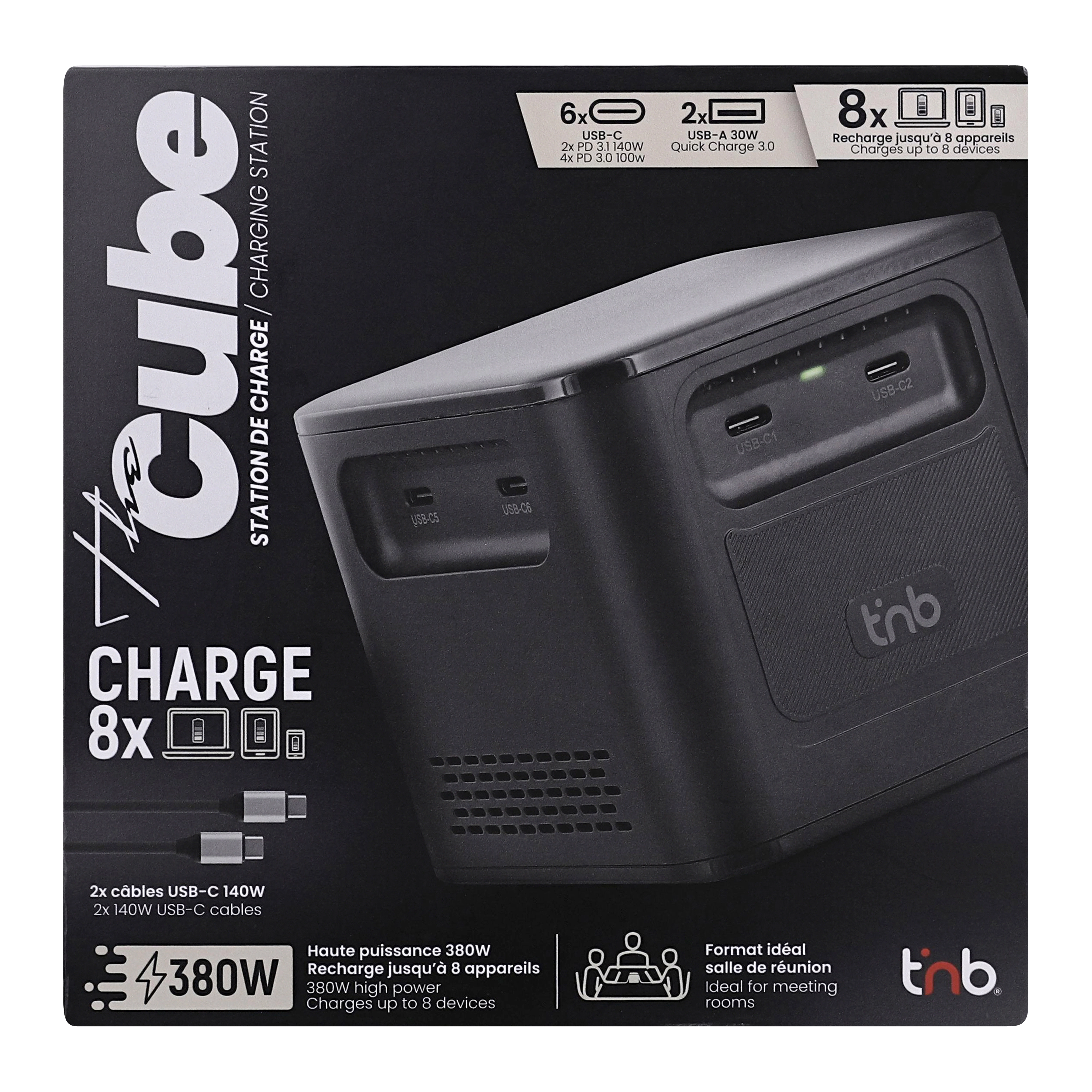 With its high power of 380W and its 8 charging ports, the charging station allows you to charge up to 8 devices at the same time. Its PD 3.1 technology allows it to deliver up to 140W on its USB-C1 and USB-C2 ports. Quick Charge 3.0 allows the two USB-A ports to deliver up to 30W. Its compact format organized in a square tower with 2 ports on each side allows it to be ideally placed in the center of a meeting table so that everyone can connect, from all sides. Comes with two 2m 140W USB-C/USB-C cables for a ready-to-use product. 1.5m mains connection cable for easy positioning. Power distribution according to the ports used: C1+C2 = 140W + 140W | C1+C2+C3 = 140W + 140W + 100W | C1+C2+C3+C4 = 100W + 100W + 65W + 65W | C1+C2+C3+C4+C5 = 100W + 65W + 65W + 65W + 30W | C1+C2+C3+C4+C5+C6 = 65W + 65W + 65W + 65W + 30W + 30W | C1+C2+C3+C4+C5+C6+A1 = 65W + 65W + 65W + 65W + 30W + 30W + 30W | C1+C2+C3+C4+C5+C6+A1+A2 = 65W + 65W + 65W + 65W + 30W + 30W + 15W + 15W |