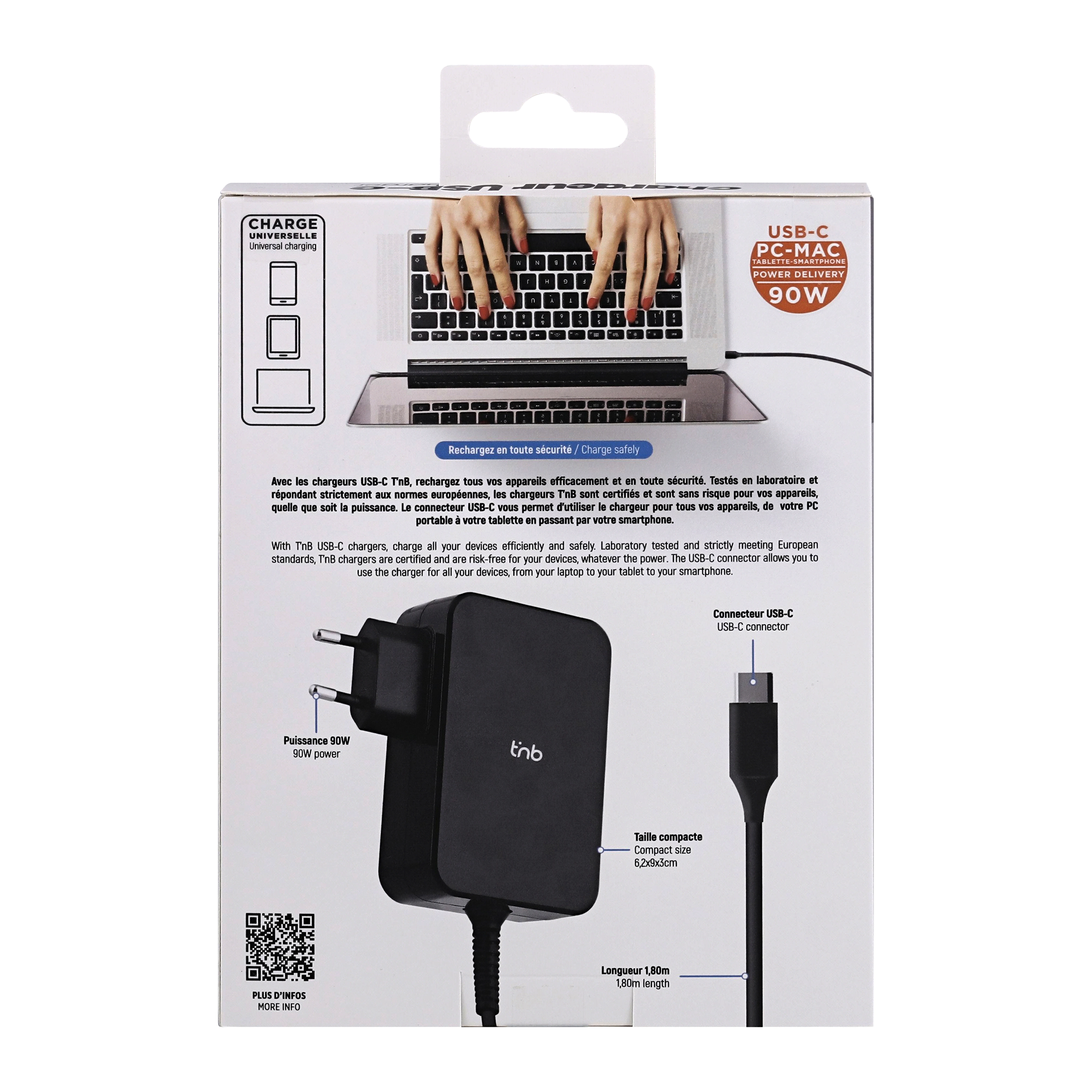 90W USB-C charger with wall plug. Compact dimensions to take it anywhere. Allows you to charge all your devices, smartphones, tablets, computers. Its 180 cm cable gives you good flexibility in your installation, wherever you are.