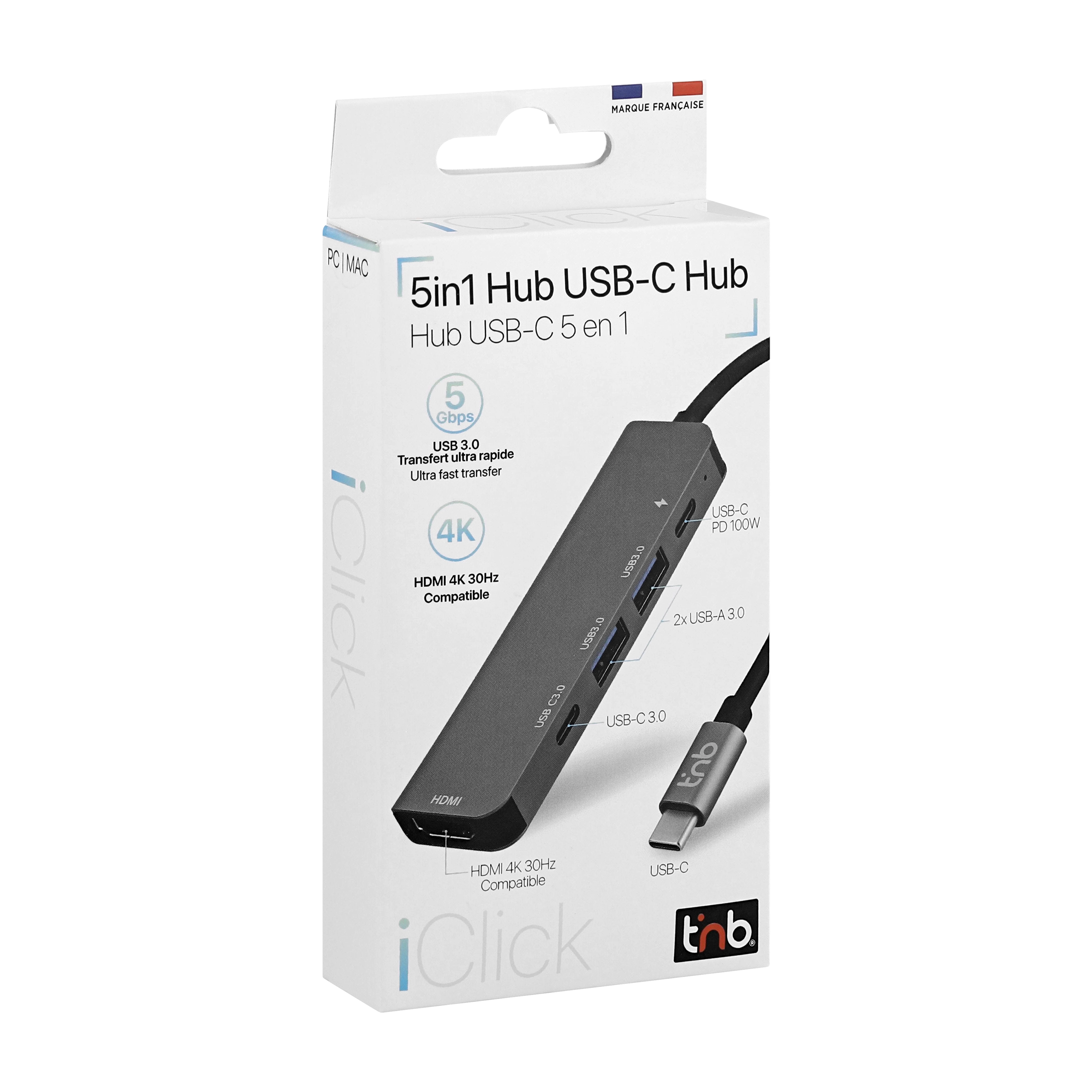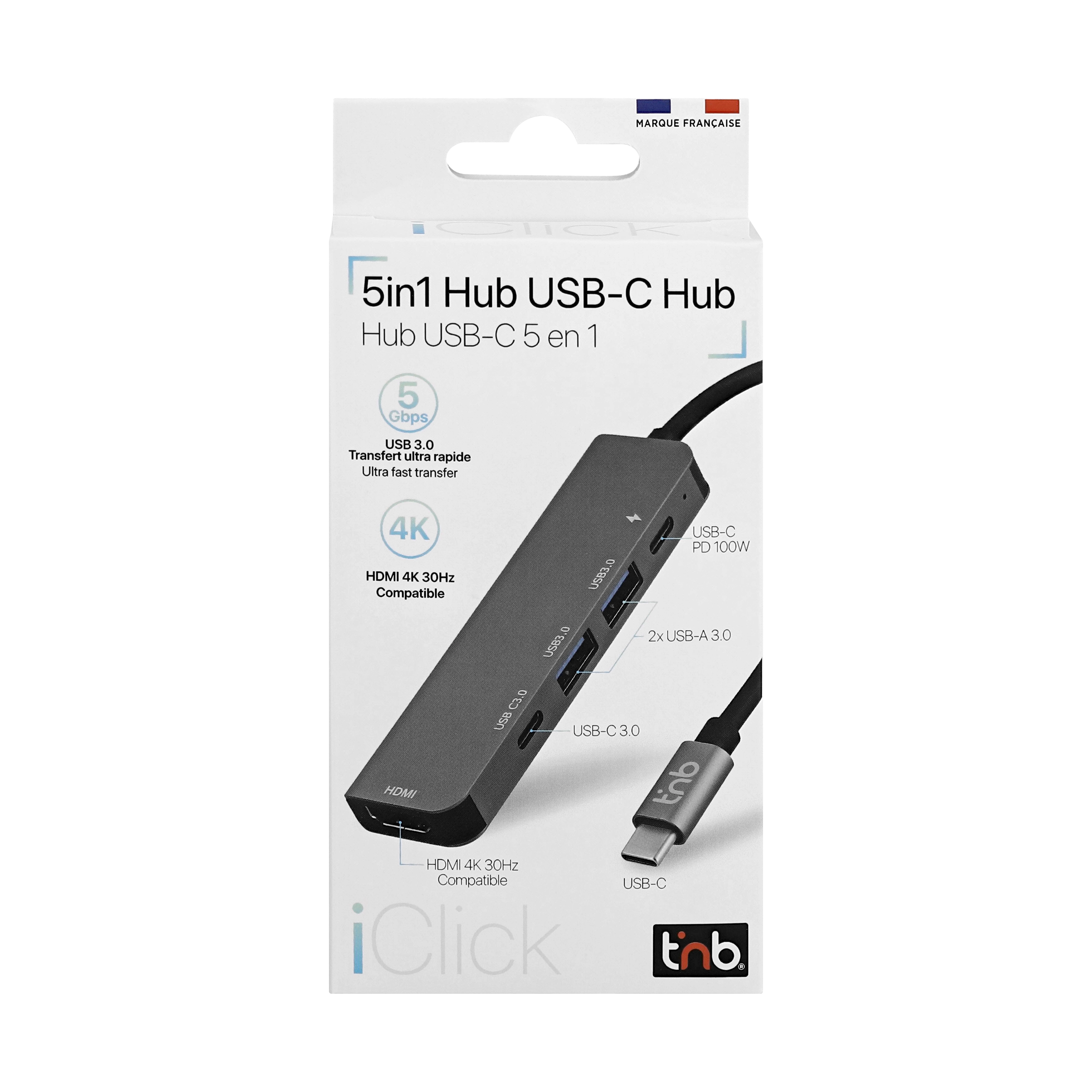 5 in 1 USB-C Hub. Plug&Play, no installation, easy to use. 5 ports: - 1x HDMI 4K 30Hz - 2 x USB-A 3.0 (5 Gbps). - 1x USB-C 3.0 (5 Gbps) - 1x USB-C PD 100W (connect a charger to your PC)