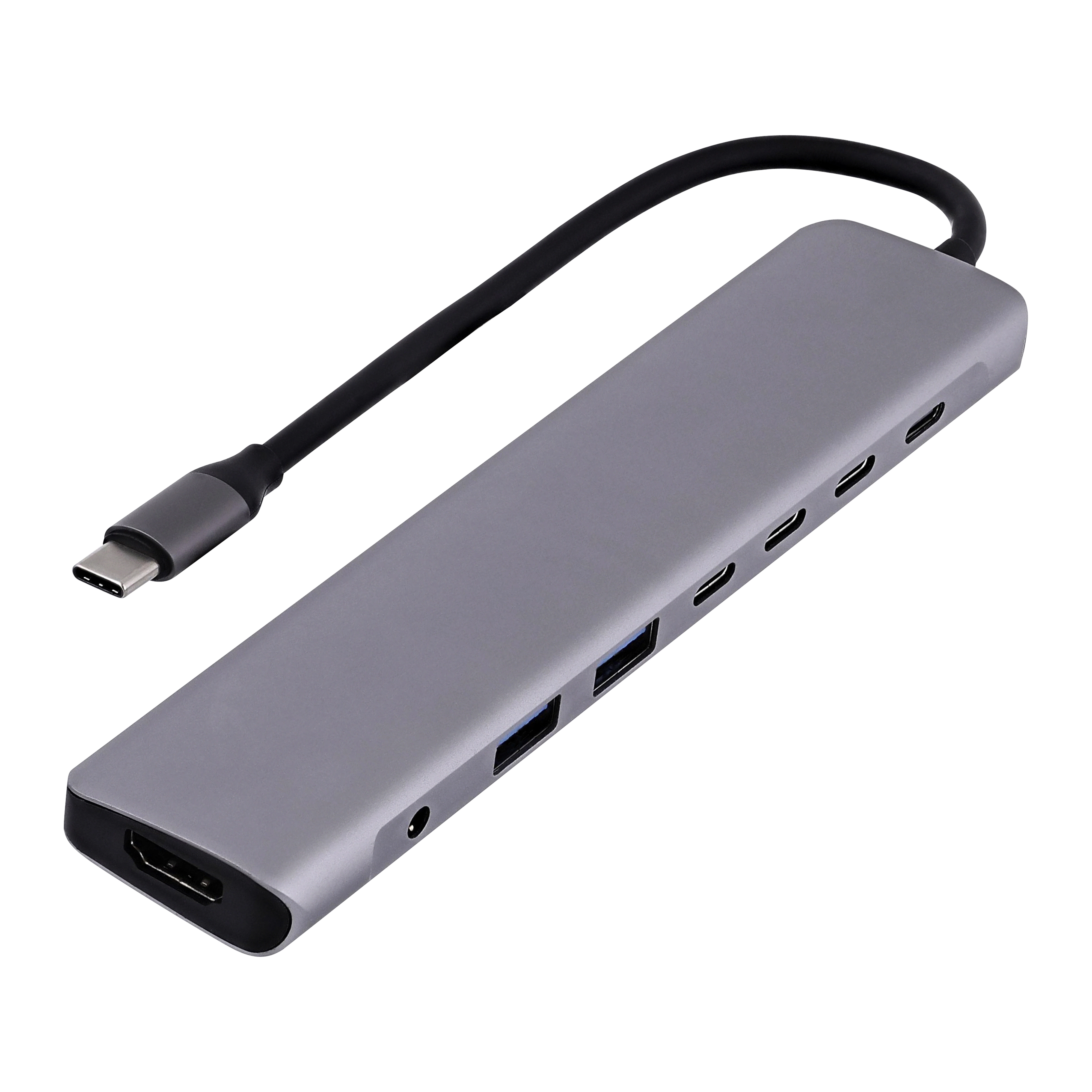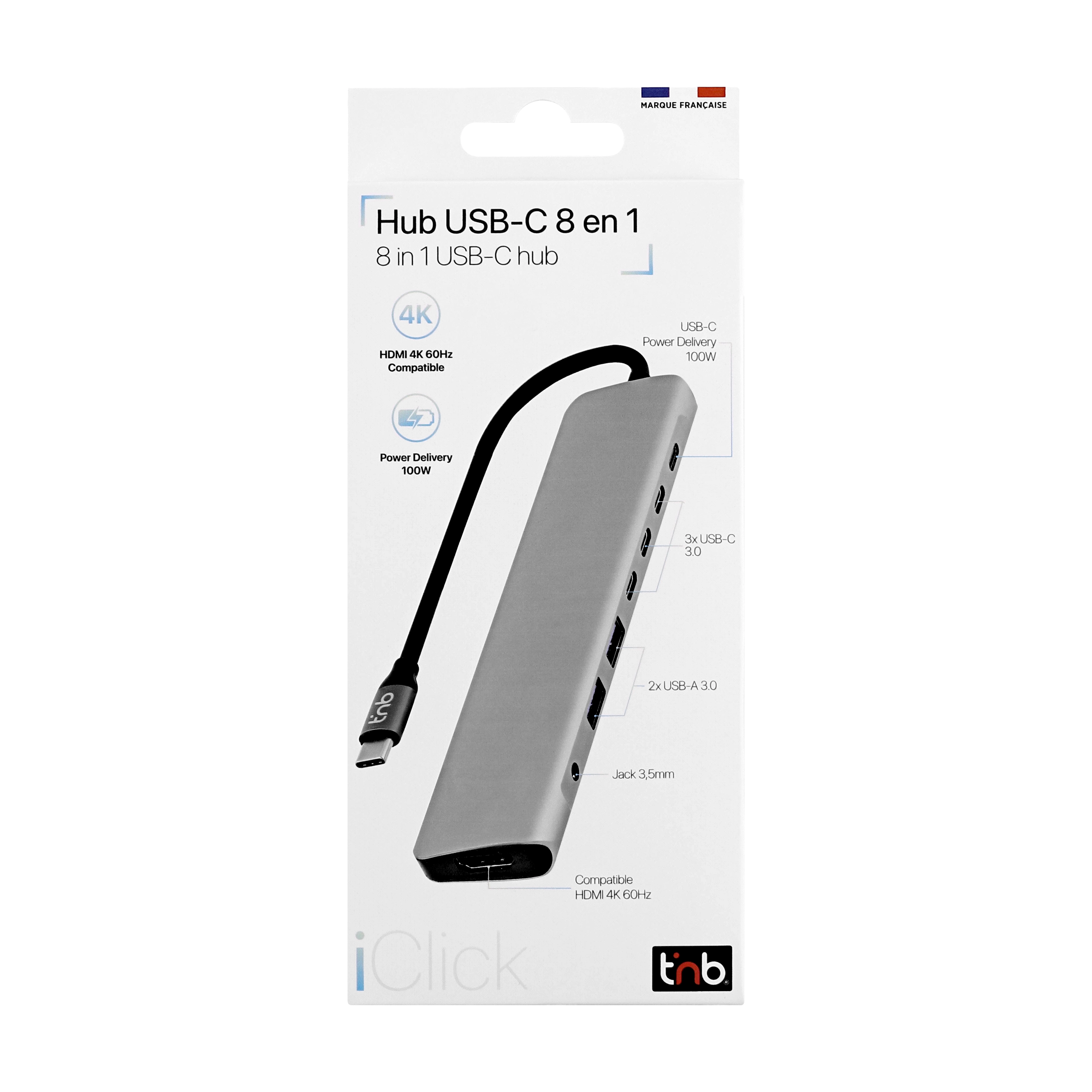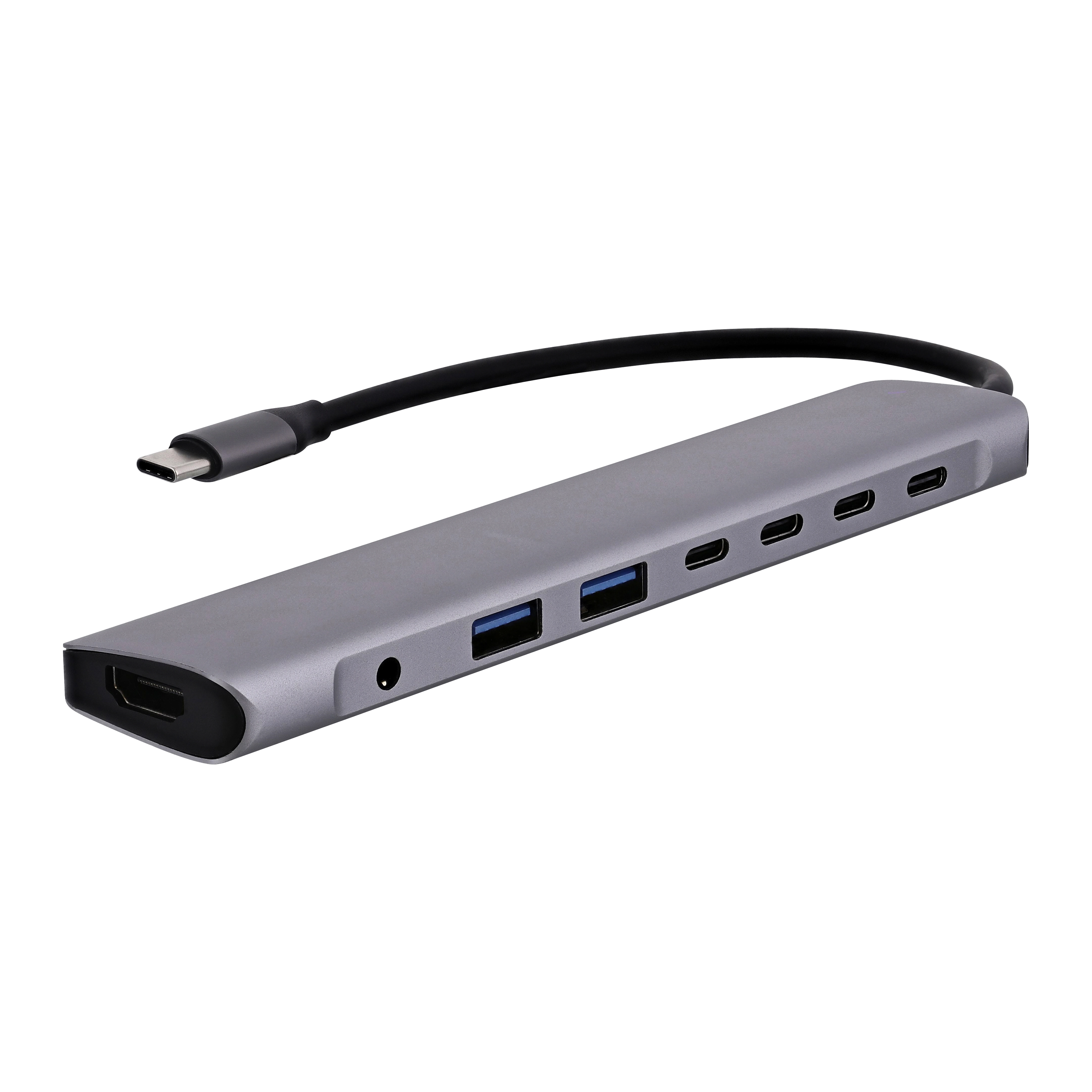 8 in 1 Hub. USB Type-C input. Plug&Play, no installation, easy to use. - 2 x USB-A 3.0 (5 Gbps data transfer speed). - 3 x USB-C 3.0 - 1x USB-C PD 100W (charge transfer to your notebook) - 1 x HDMI 4k60Hz - 1 x 3.5mm jack.