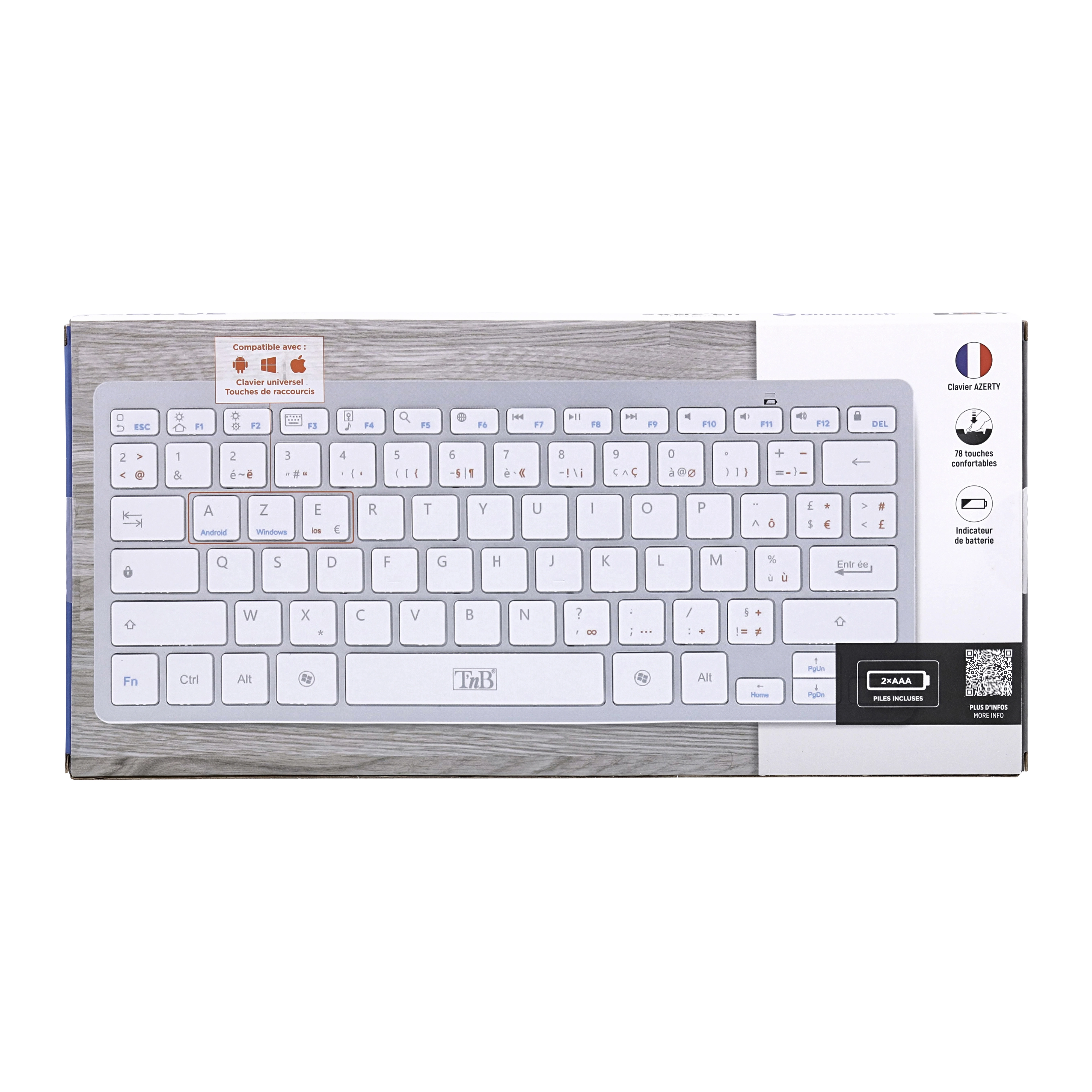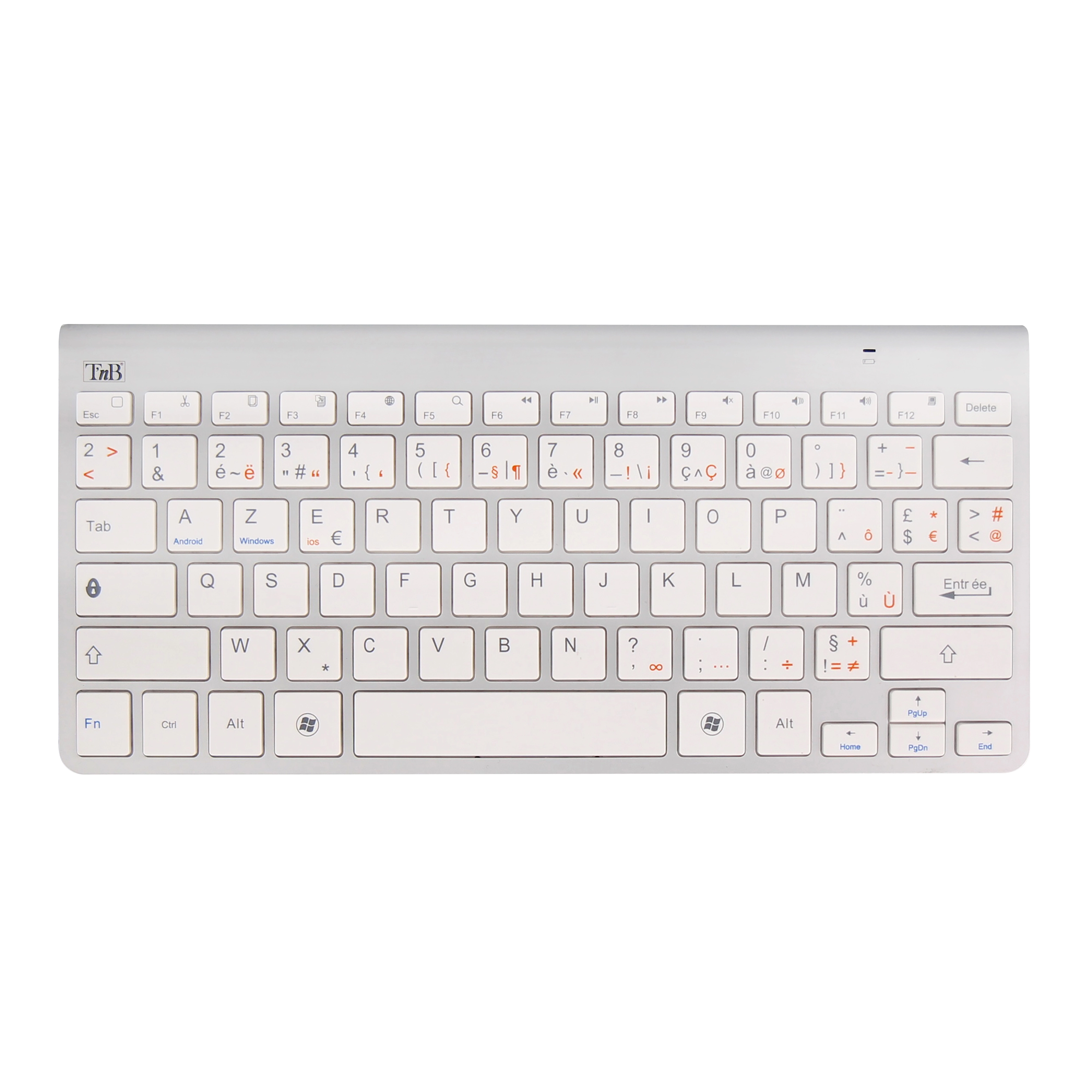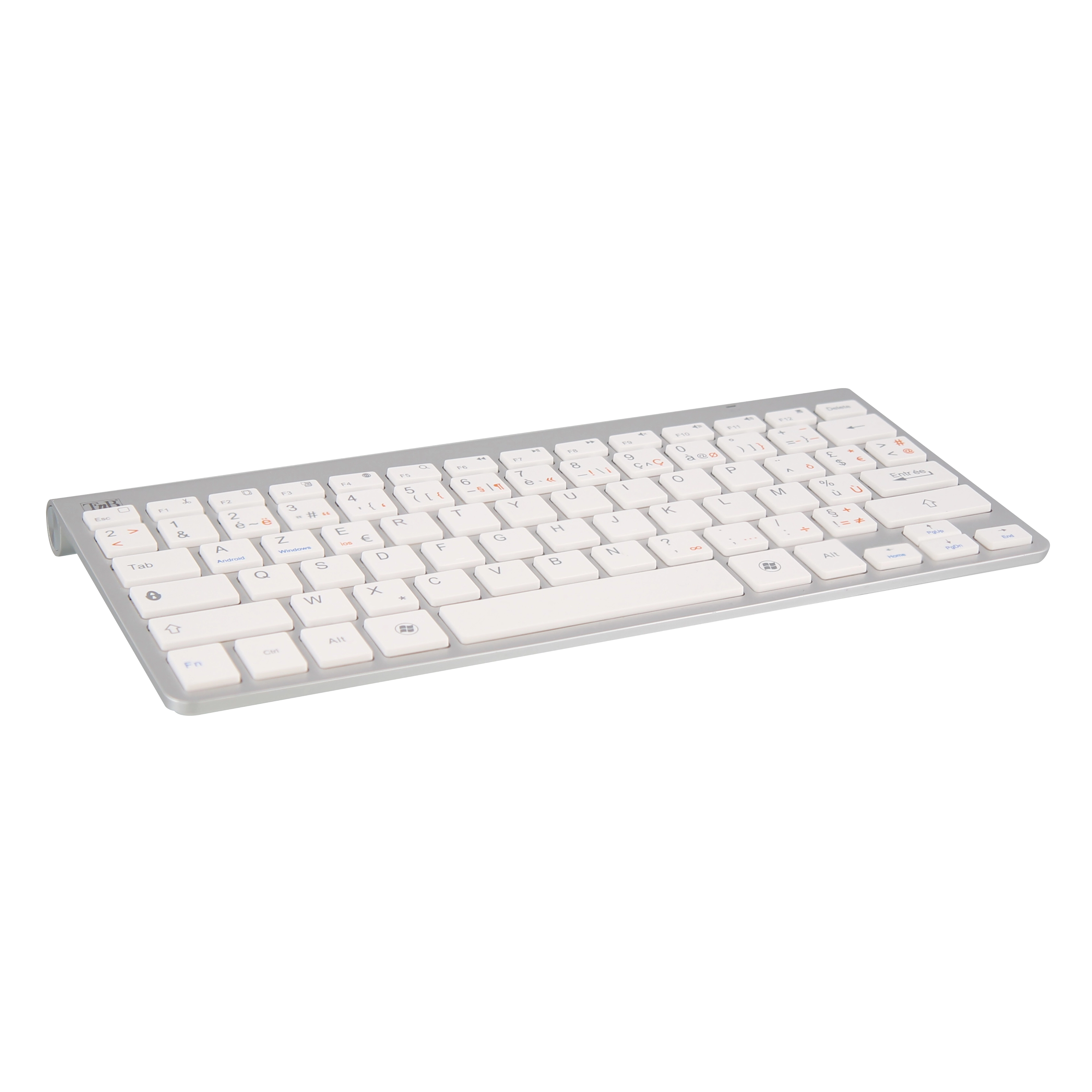 Compact 78-Key Wireless Bluetooth Keyboard Designed to connect to computers equipped with Bluetooth technology. Compatible with PCs, tablets and other Bluetooth devices. Aluminum base and white keys with battery indicator.