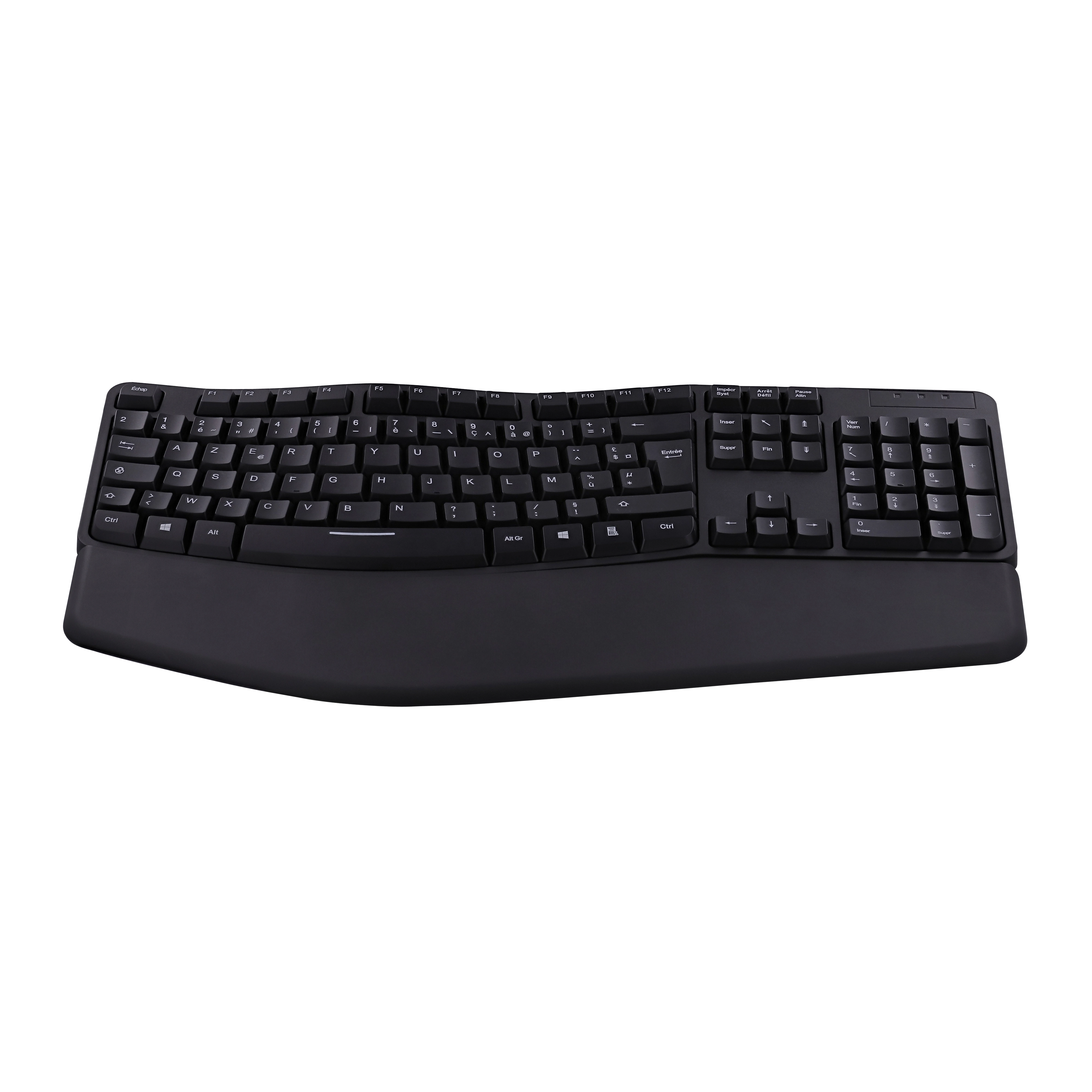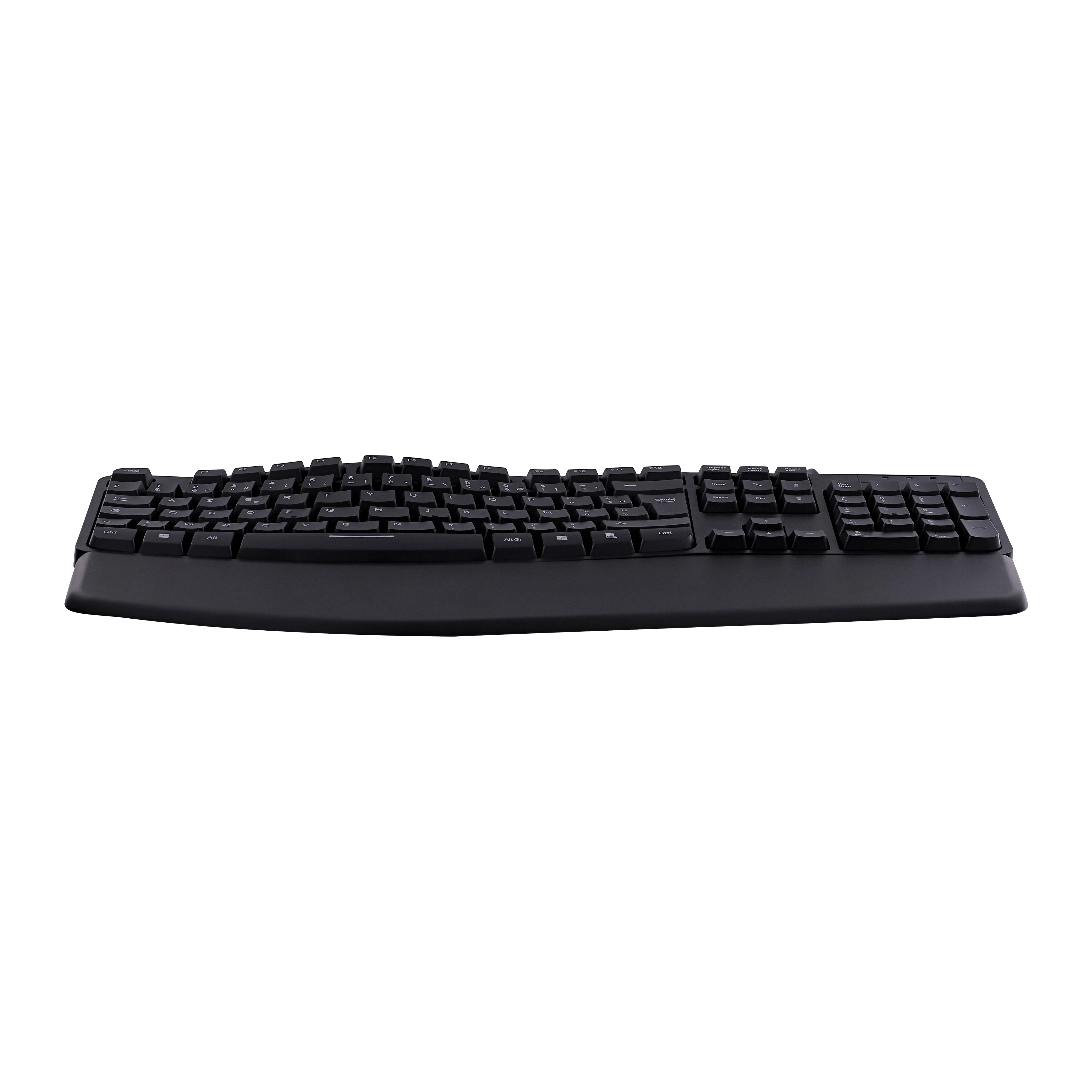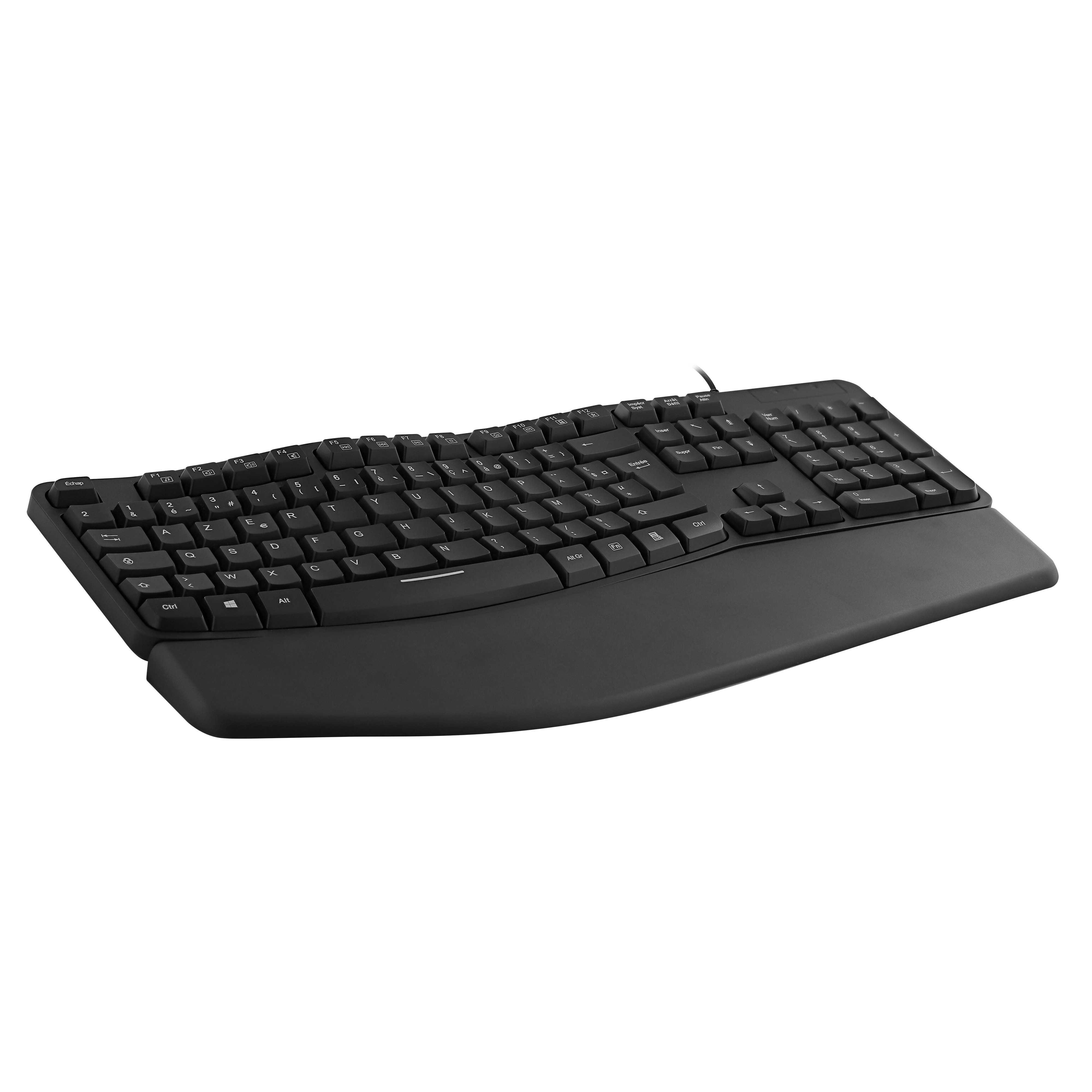 Ergonomically shaped keyboard with numeric keypad. Its ergonomic wave shape minimizes wrist movements in order to reach all the keys with minimal effort. This relieves the wrists for long uses such as at work. Its undulation allows for easy and instinctive handling, even for those uninitiated to ergonomic keyboards. Its magnetic wrist rest provides ideal support in front of the keyboard so as not to have to raise your arms. This avoids unnecessary strain on the arm muscles. Adjustable tilt for an even more comfortable position. Non-slip pads for use firmly anchored on the desk.