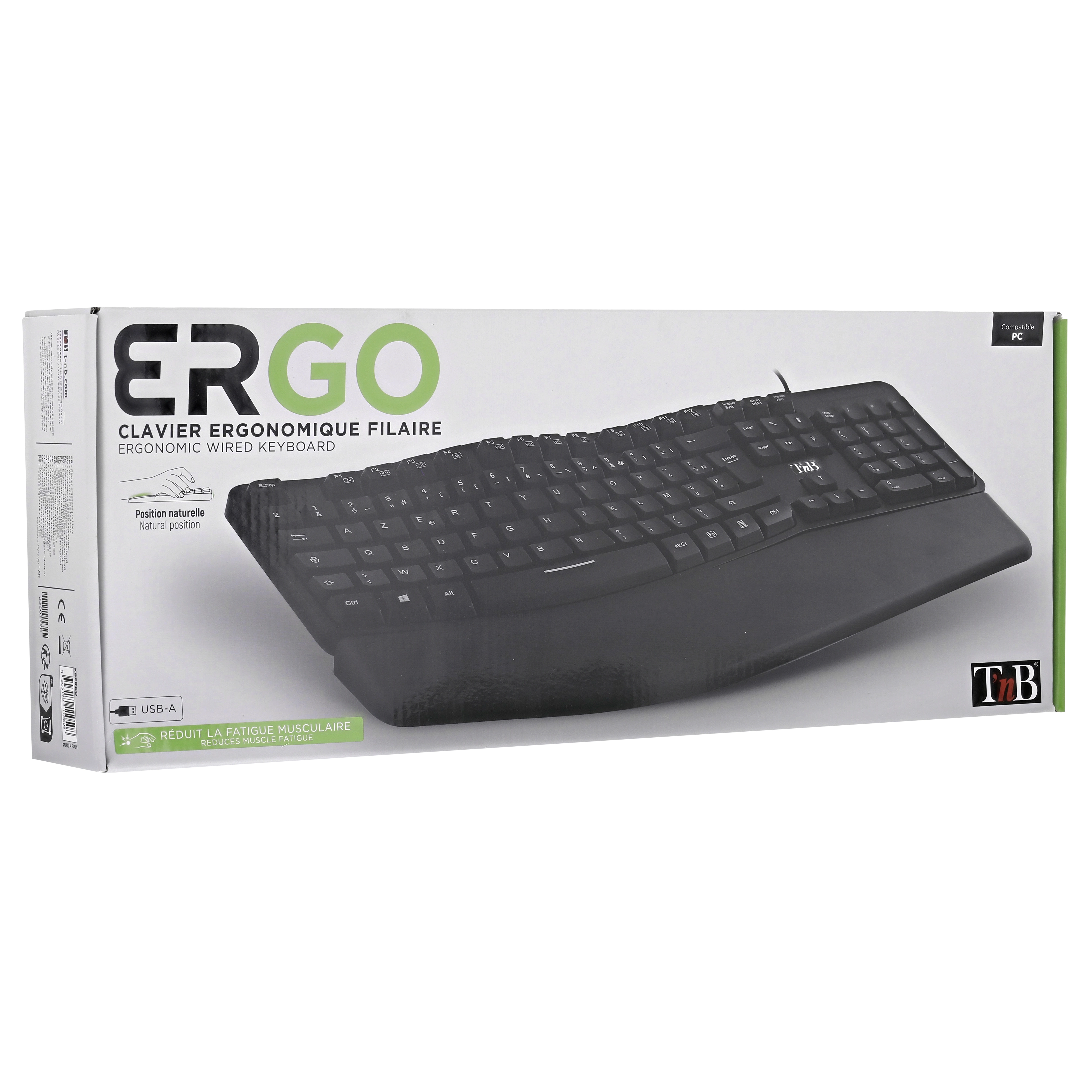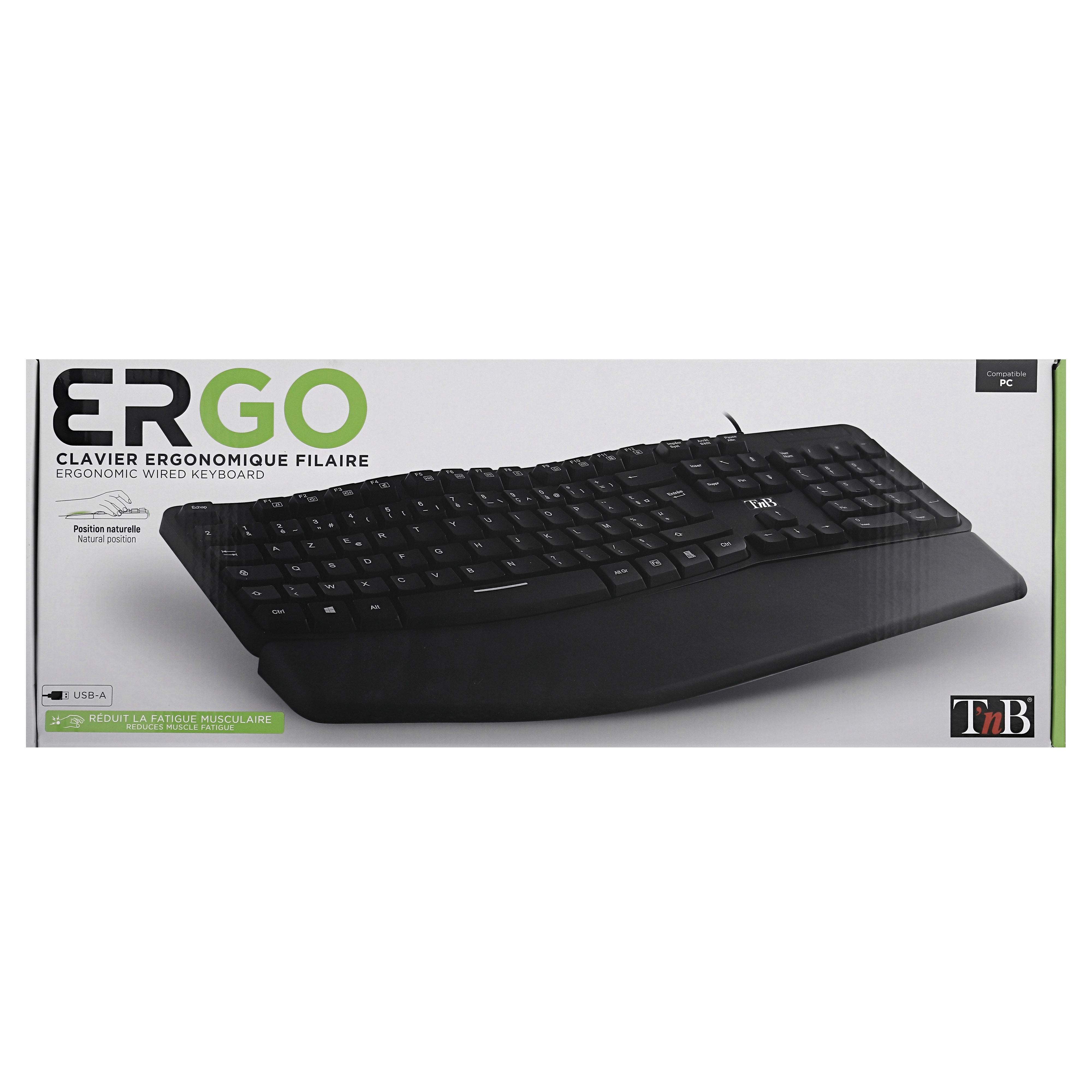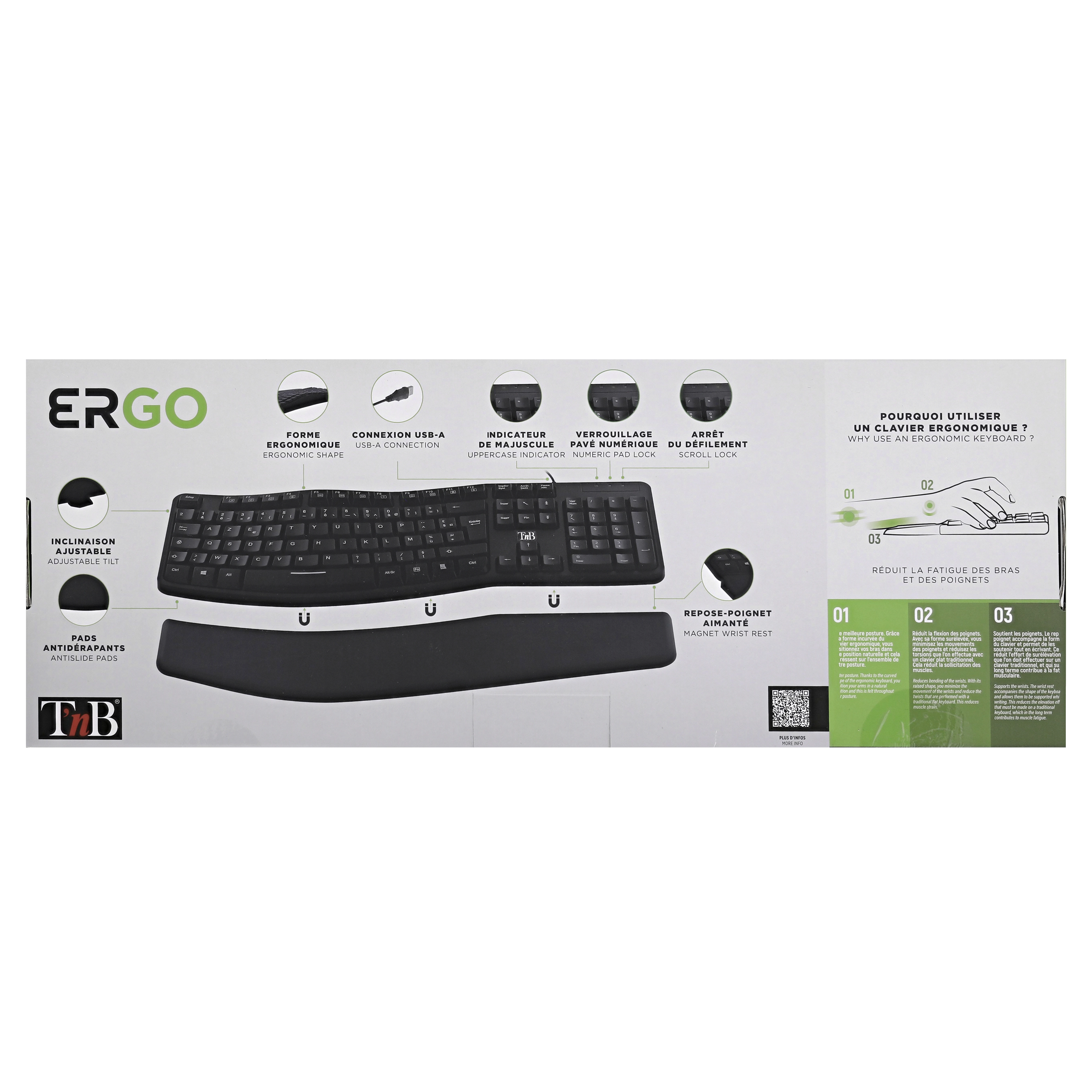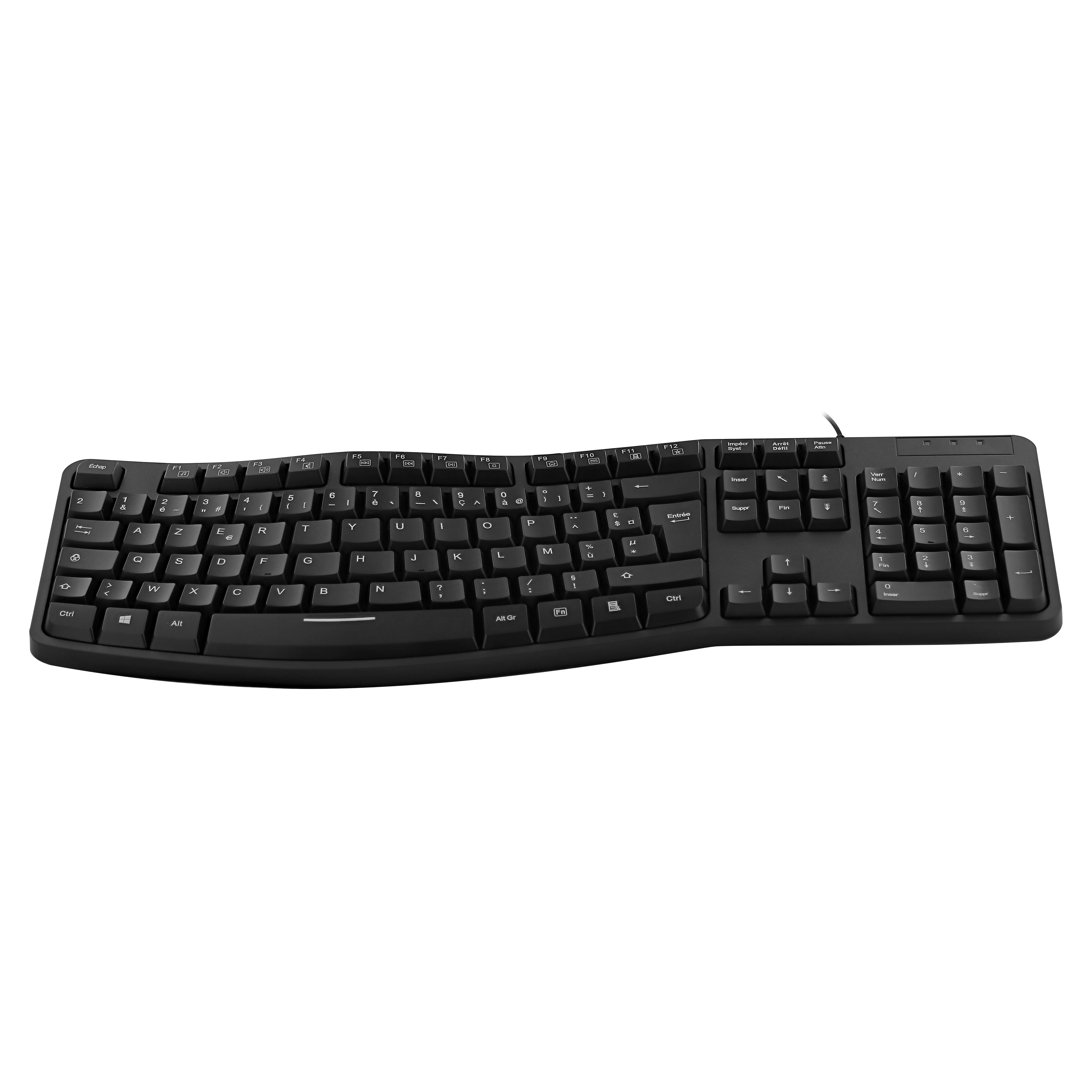 Ergonomically shaped keyboard with numeric keypad. Its ergonomic wave shape minimizes wrist movements in order to reach all the keys with minimal effort. This relieves the wrists for long uses such as at work. Its undulation allows for easy and instinctive handling, even for those uninitiated to ergonomic keyboards. Its magnetic wrist rest provides ideal support in front of the keyboard so as not to have to raise your arms. This avoids unnecessary strain on the arm muscles. Adjustable tilt for an even more comfortable position. Non-slip pads for use firmly anchored on the desk.