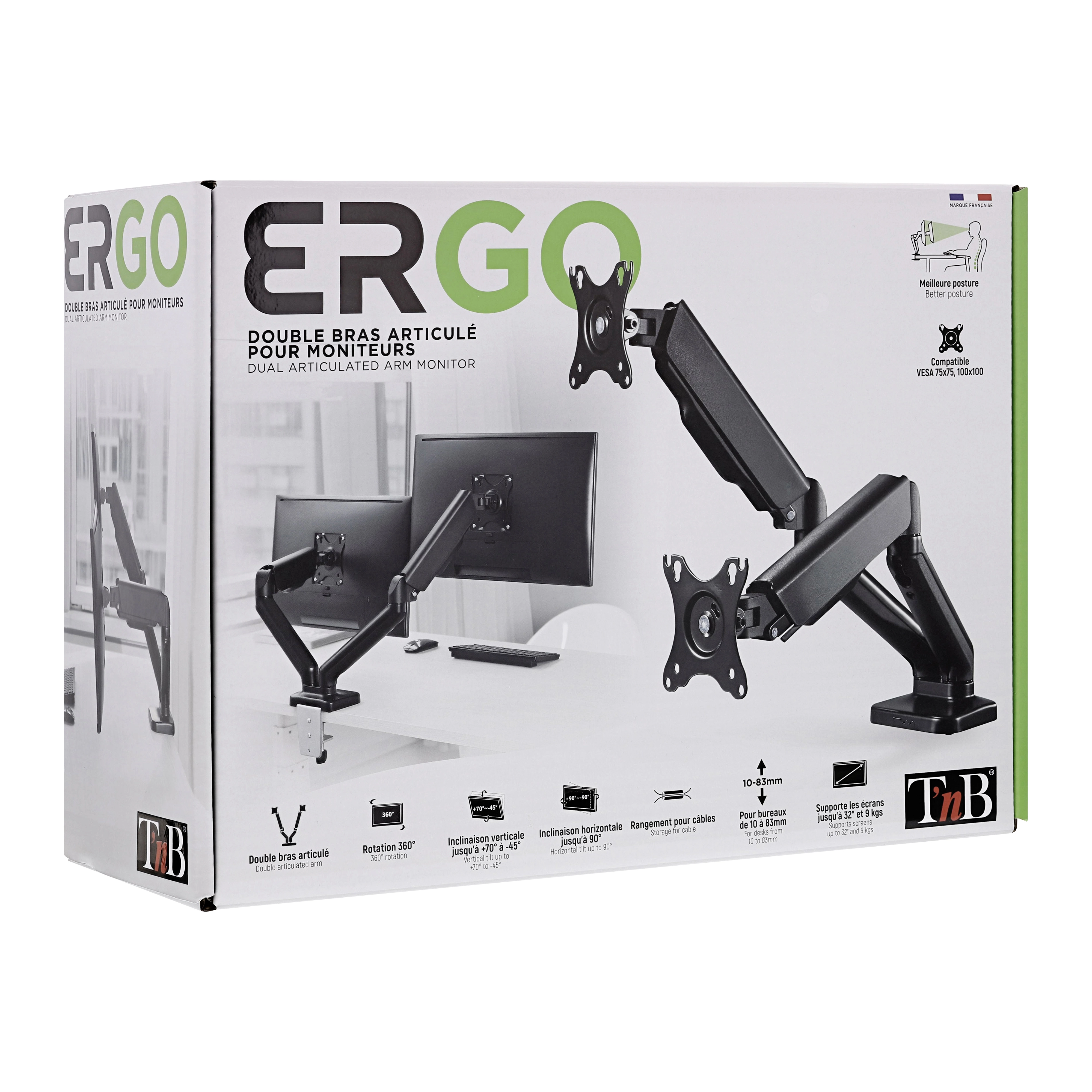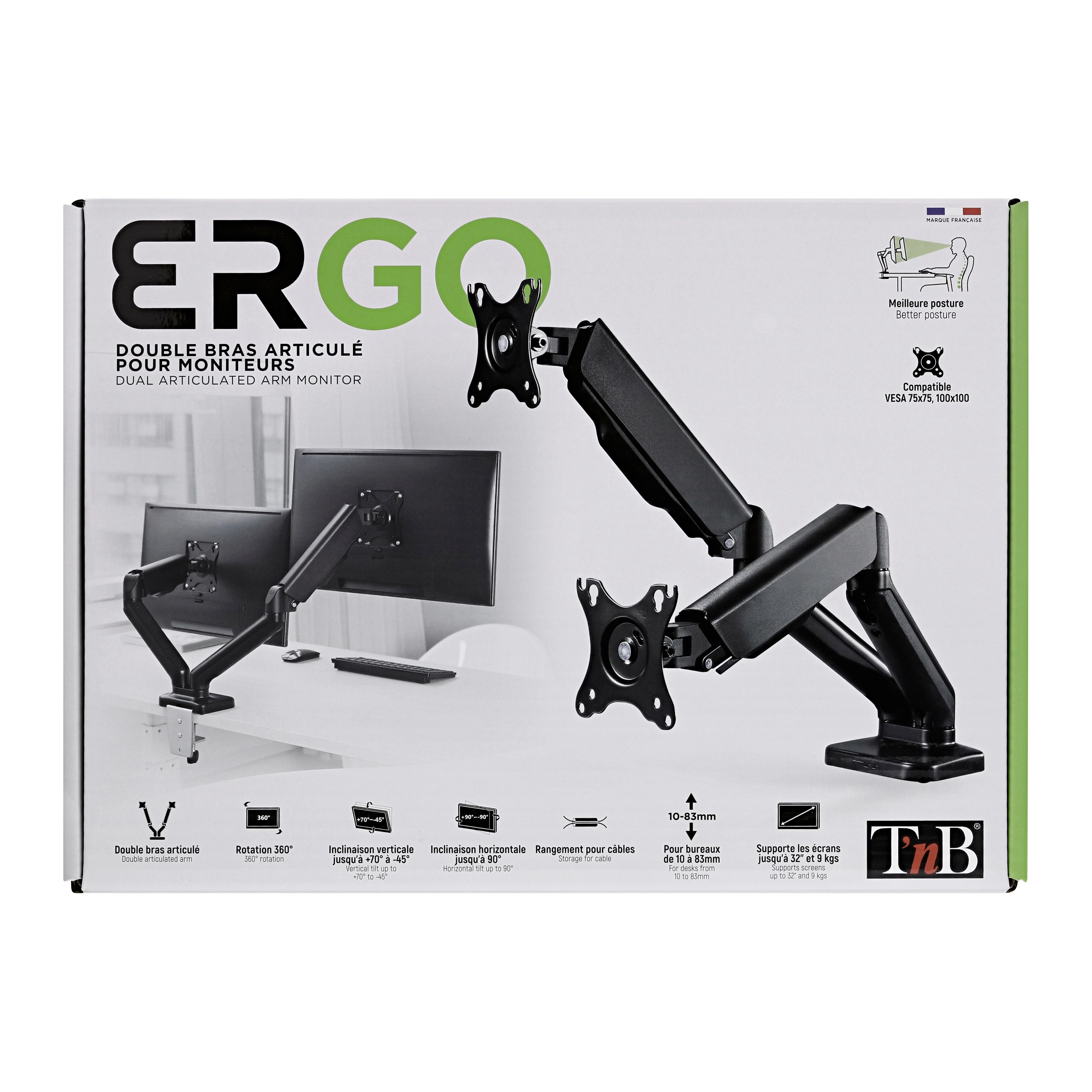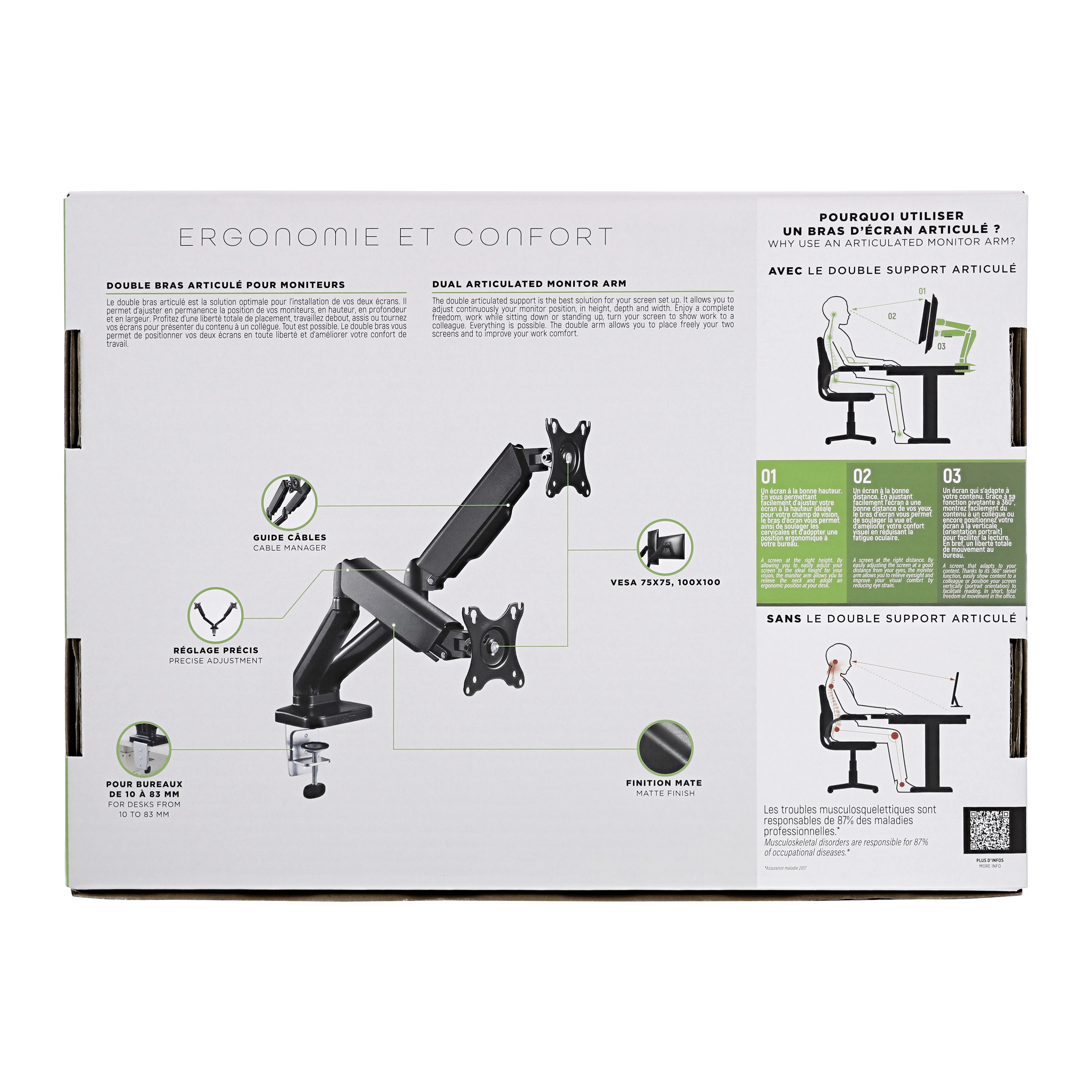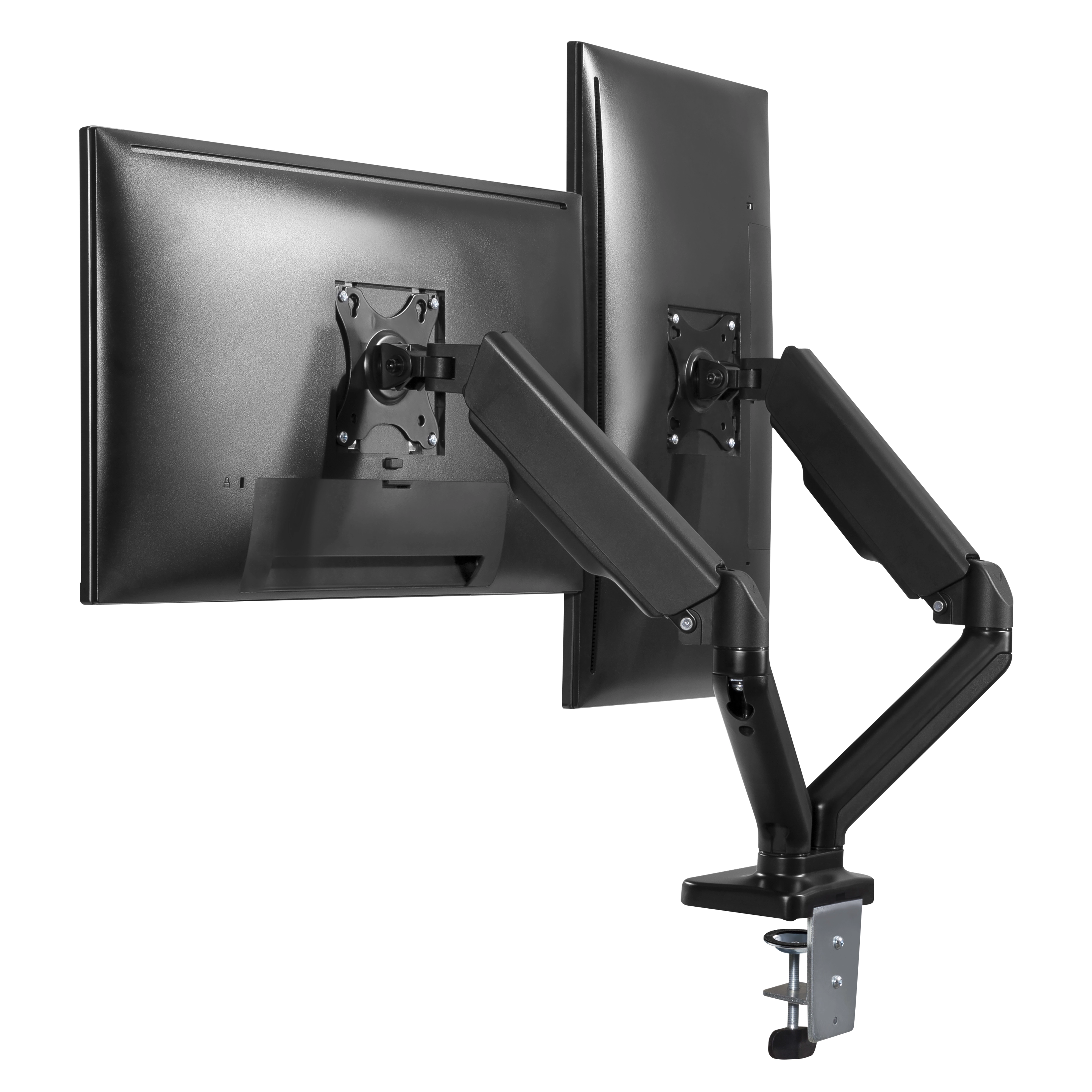 Double monitor arm with full articulation and 360° adjustment. The double articulated monitor arm is the optimal solution for installing your two screens. It allows you to continuously adjust the position of your monitors, in height, depth and width. Enjoy total freedom of placement, work standing or sitting or turn your screens to present content to a colleague. Everything is possible. The double arm allows you to position your 2 screens freely and improve your working comfort. Its gas spring allows you to adjust the position and counterbalance the weight of the screen with precision. Cable guide integrated into the body of the arm to facilitate desk storage and free up space. Two integrated mounting options: clamping screw and drilling kit.