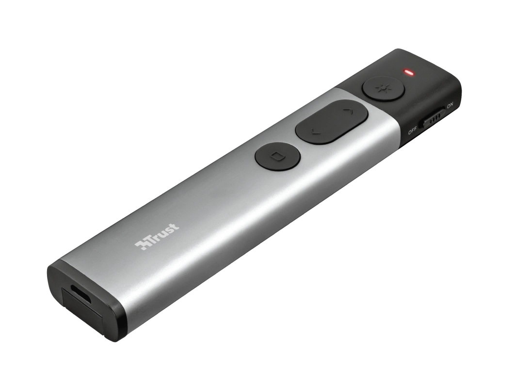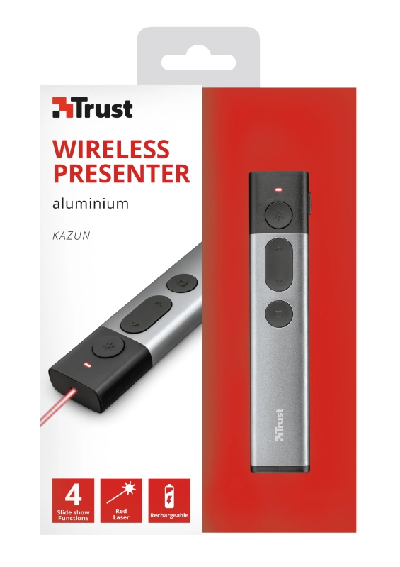The Kazun Presenter includes four PowerPoint functions: you can easily start and stop your presentation, go to the next and previous slide or go to a black screen. The red laser pointer can be used to emphasize important aspects of your presentation, ensuring that your audience knows exactly what you are talking about.