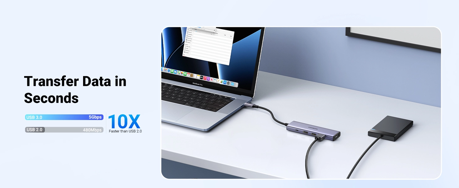 Say goodbye to endlessly dragging file transfers. The hub is equipped with USB-A 3.0 ports that allow data transfer speeds of up to 5 Gbps. Now justaRCzy a few moments to transfer all the photos, videos, documents or high-resolution audio files you need.