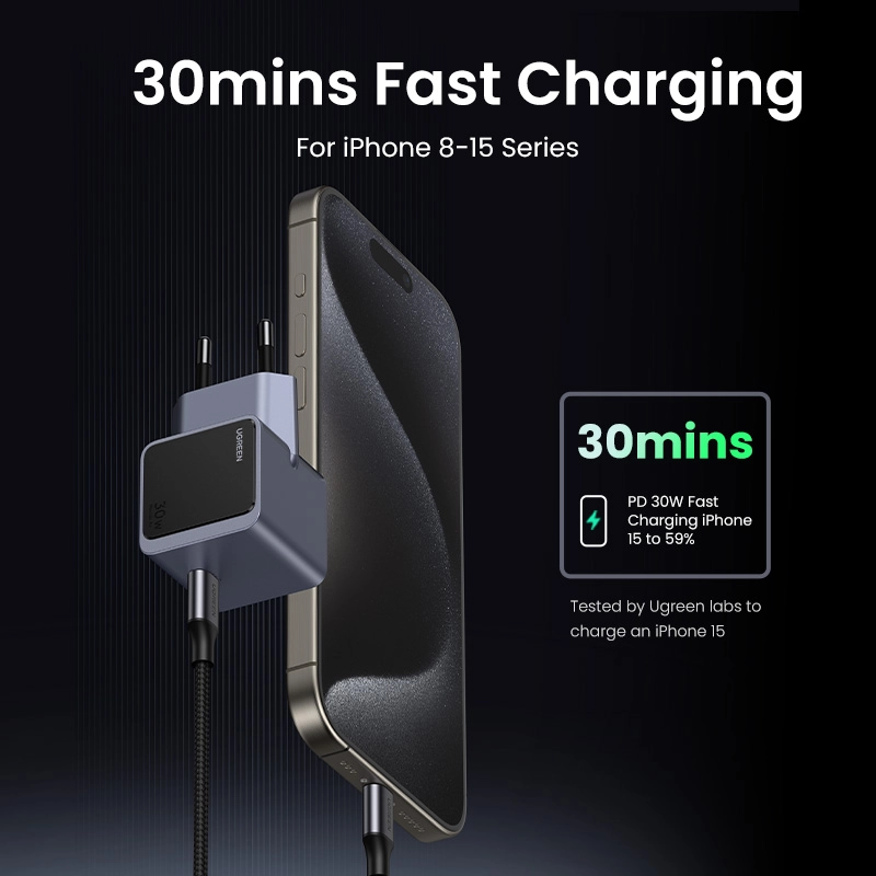 Ugreen Nexode S 30W USB-C GaN Fast Charger EU gray. Charger type: Indoor, Power source type: AC, Charger compatibility: Mobile phone, Power bank, Telephone. Product colour: Grey