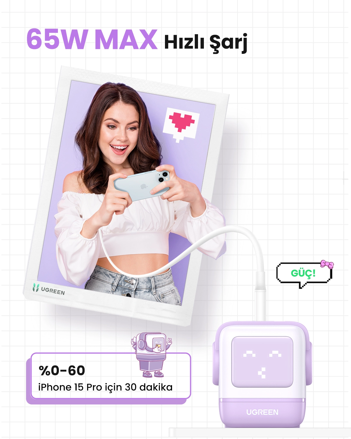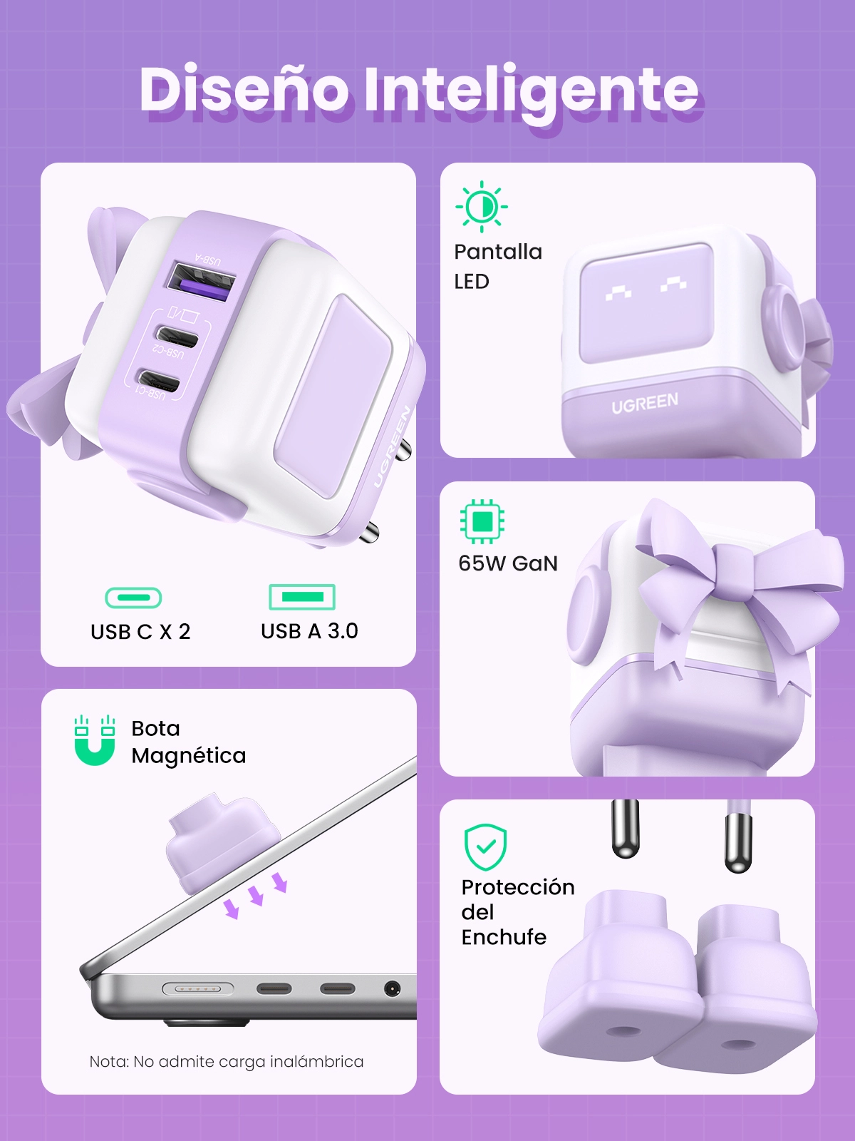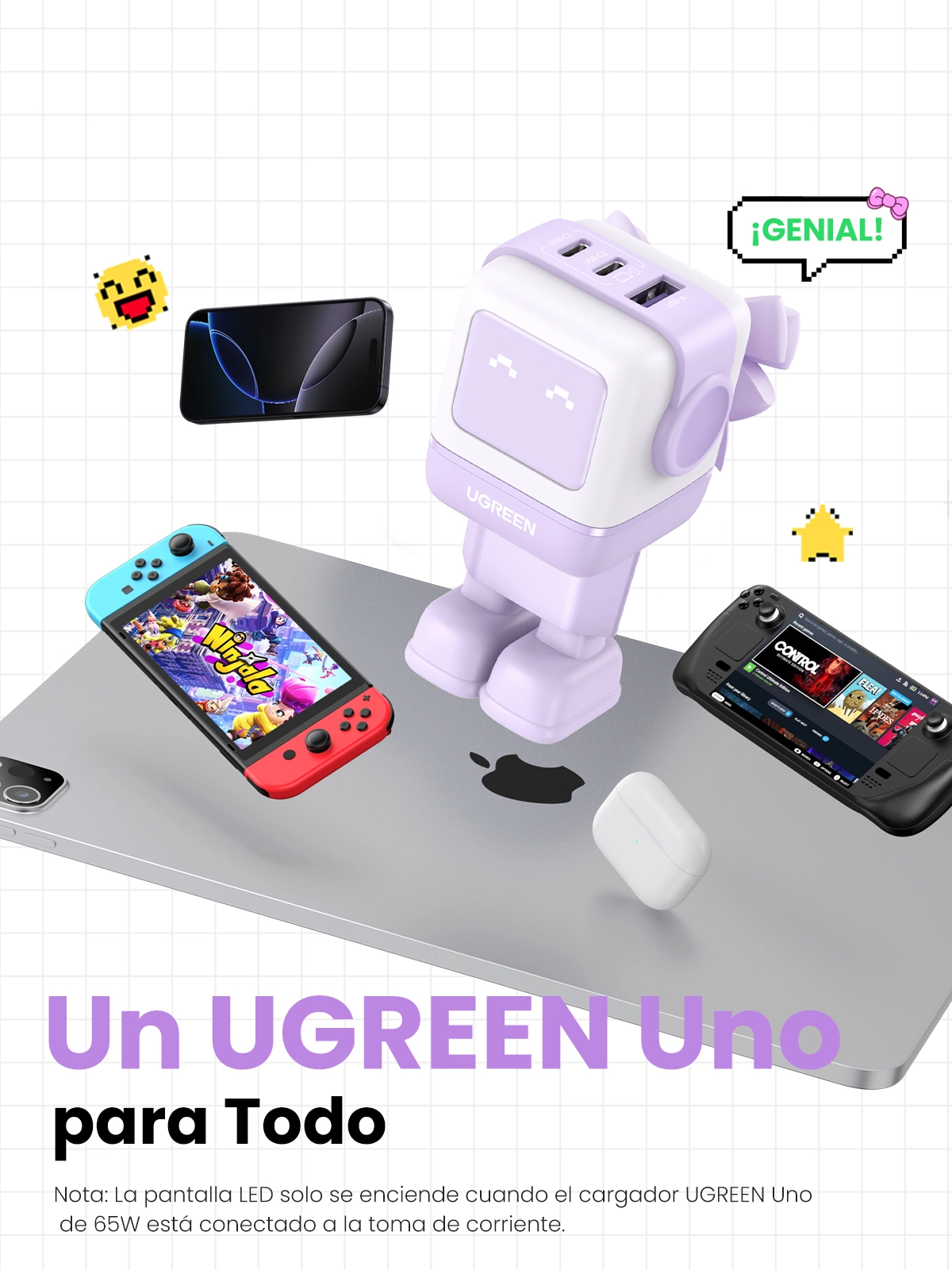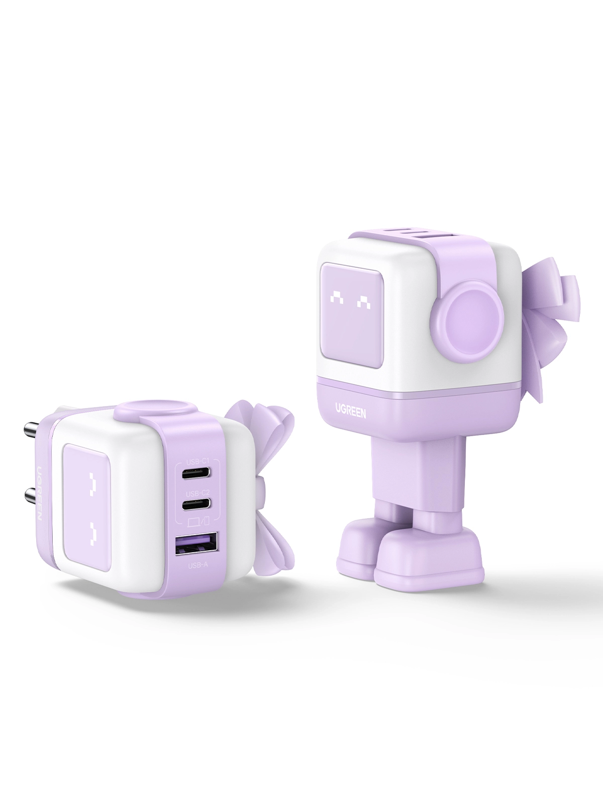 Ugreen Nexode RG 65W 3-Port GaN. Charger type: Indoor, Power source type: AC, Charger compatibility: Mobile computer, Mobile phone, Mouse, Laptop, Power bank, Telephone, USB 2.0 ports quantity: 1, USB Type-C ports quantity: 2, Fast charging. Product colour: Pink