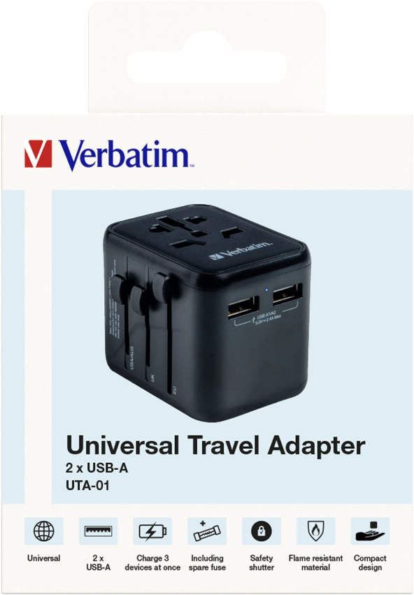 The Verbatim Universal Travel Adapter can be used in more than 180 countries – take it everywhere with you and never be out of power. This world-to-world multi plug will allow you to connect to any local power supply around the world and recharge your power-hungry devices, like laptops and camera batteries. The two USB-A ports on the bottom can charge all your USB devices including smartphones, Bluetooth speakers, tablets, power banks, and Kindles.