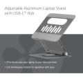 CLUB3D Verstelbare aluminium laptopstandaard met USB-C®-hub. Kleur van het product: Grijs. Breedte: 260 mm, Diepte: 224 mm, Hoogte: 56 mm. Breedte verpakking: 315 mm, Diepte verpakking: 264 mm, Hoogte verpakking: 84 mm. Aantal per verpakking: 1 stuk(s)