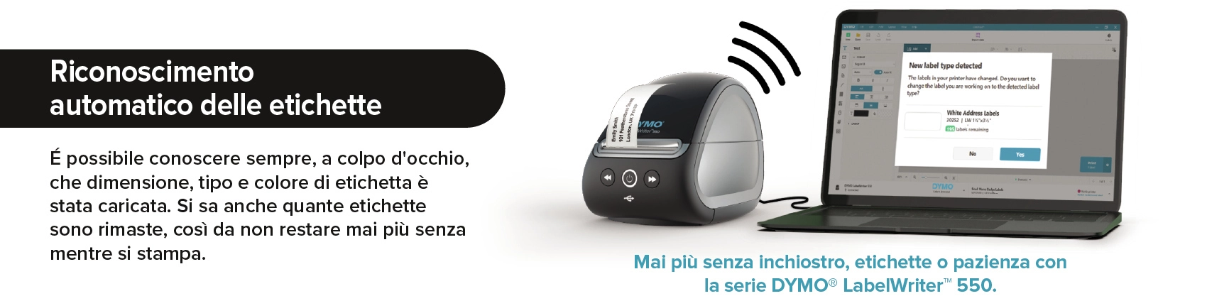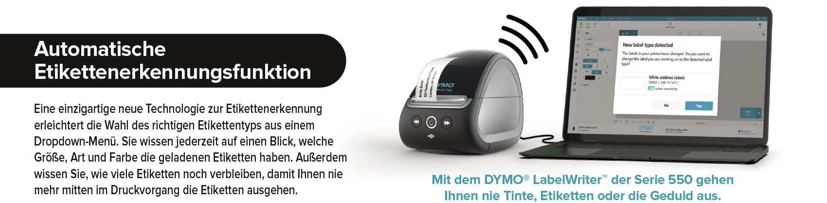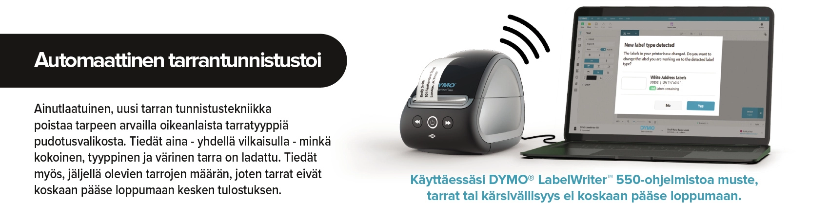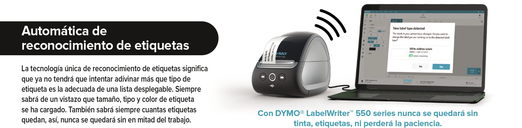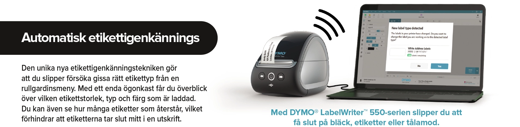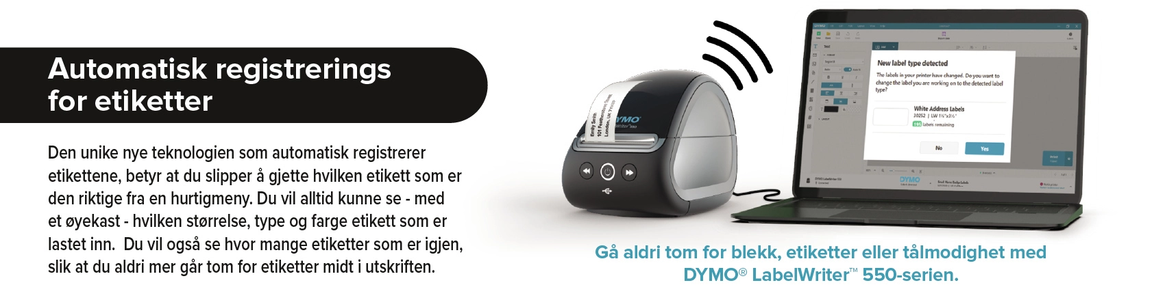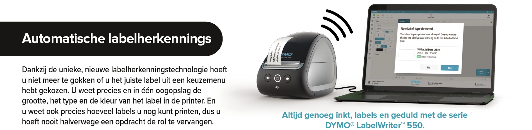 Met de DYMO® LabelWriter™ 5XL kunt u standaard grote (brede) labels printen, waardoor deze printer ideaal is voor al uw professionele labels, van veiligheid en opslag tot streepjescodes, volgen van middelen, signalering en meer. De directe thermische technologie werkt zonder dure inkt of toner, en de intelligente software DYMO® Connect for Desktop maakt verbinding met uw PC of Mac en biedt diverse mooie ontwerpen voor uw labels. Dankzij de unieke, nieuwe labelherkenningstechnologie hoeft u niet meer te gokken of u het juiste label uit een keuzemenu hebt gekozen. U weet altijd de afmetingen, het type en de kleur van het label dat in de printer is geplaatst en hoeft niet halverwege een opdracht te stoppen om de rol te vervangen. Grote labels printen voor uw bedrijf is ineens een stuk sneller en eenvoudiger geworden.