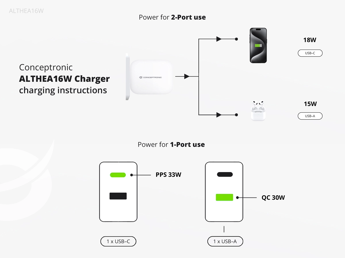Conceptronic ALTHEA16W. Type oplader: Binnen, Type stroombron: AC, Lader compatibiliteit: Universeel. Ingangsspanning: 100 - 240 V, Uitgangsspanning (max): 20 V. Aantal USB-Type-C-poorten: 1, Snel opladen, Stroomspanning bescherming: Oververhitting, Overbelasting, Kortsluiting. Snoerlengte: 1, 5 m, Kleur van het product: Wit