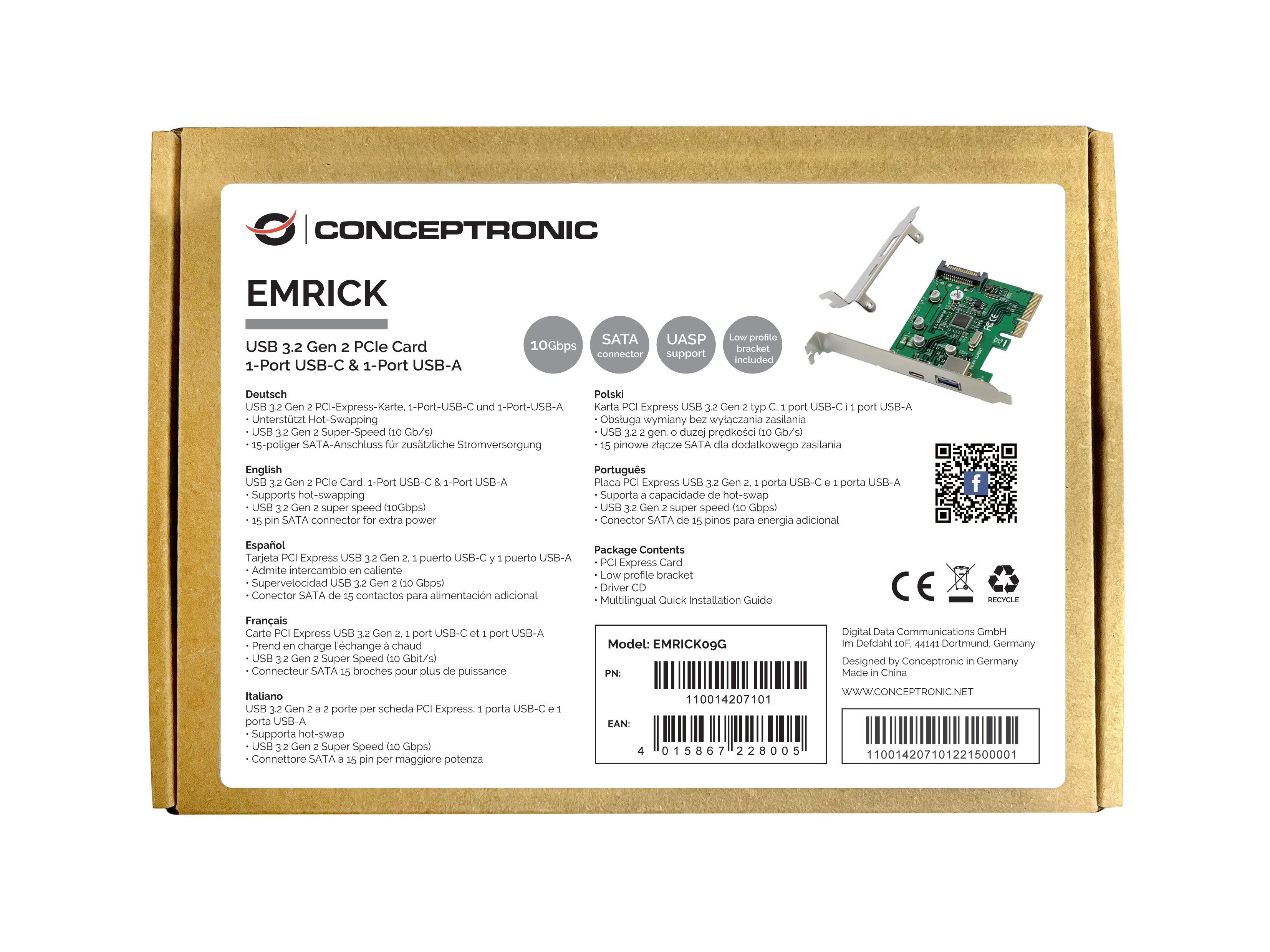 Conceptronic EMRICK09G. Hostinterface: PCIe, Output interface: USB 3.2 Gen 2 (3.1 Gen 2), Uitbreidingskaartstandaard: PCI 3.0. Kleur van het product: Groen, Land van herkomst: China. Ondersteunt Windows: Windows 7 Ultimate x64, Windows 10, Windows 7 x64, Windows 10 Education, Windows 8, Windows 10. . . . Breedte: 58 mm, Diepte: 80 mm, Hoogte: 20 mm. Breedte verpakking: 125 mm, Diepte verpakking: 175 mm, Hoogte verpakking: 30 mm
