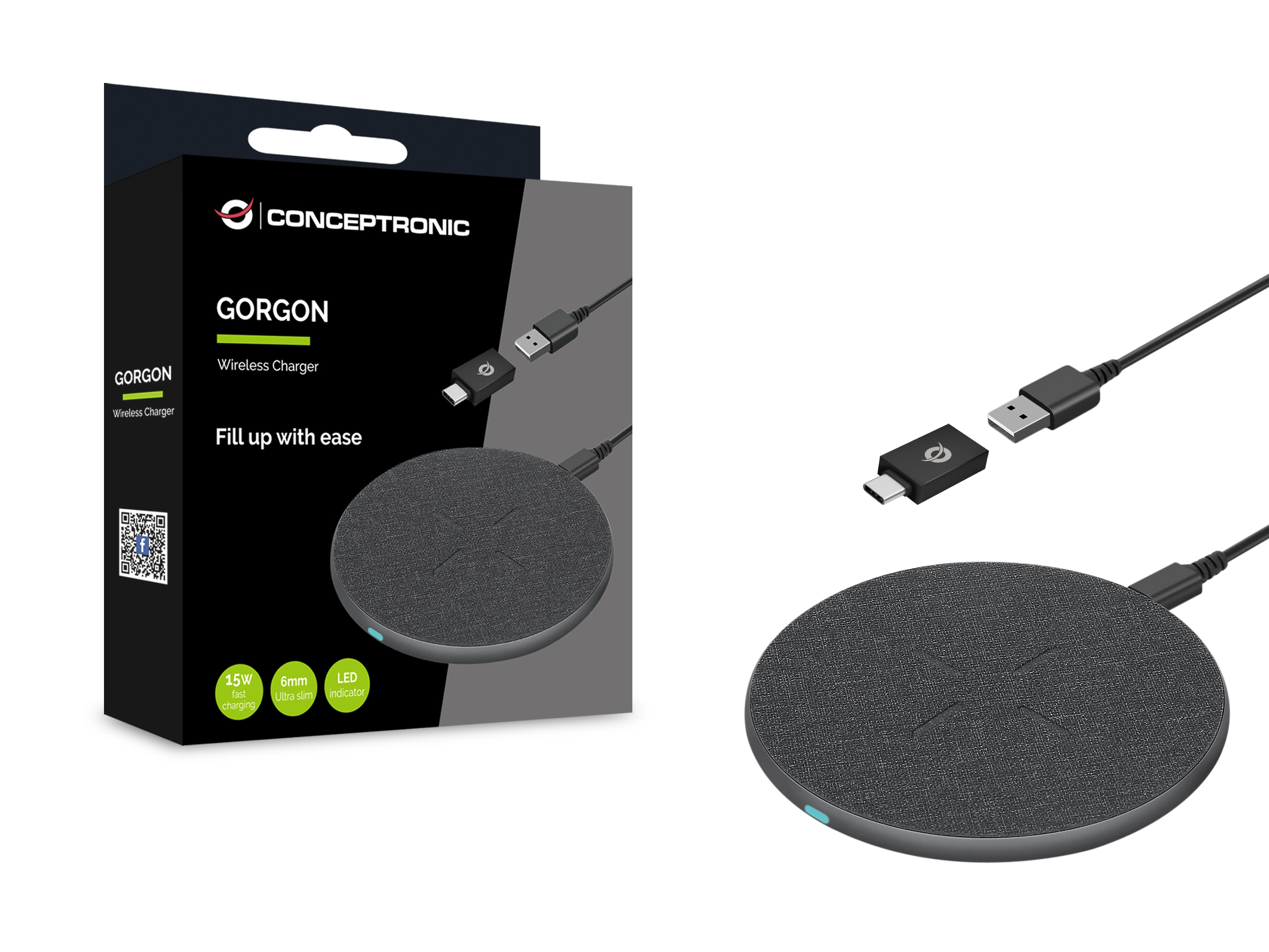 Conceptronic GORGON03G. Type oplader: Binnen, Type stroombron: USB, Lader compatibiliteit: Headset, Smartphone, Draadloos opladen, Snel opladen. Kleur van het product: Grijs