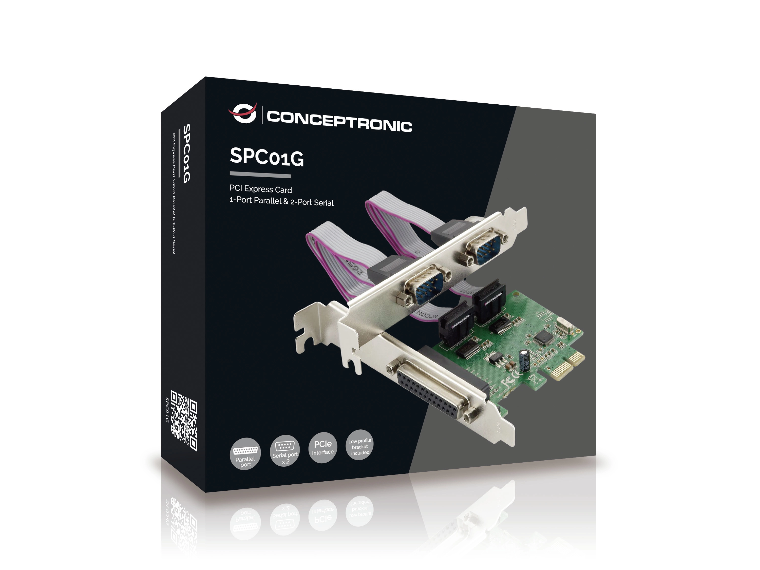 Conceptronic SPC01G. Hostinterface: PCIe, Output interface: Parallel, RS-232, Uitbreidingskaartstandaard: PCIe 1.1. Kleur van het product: Groen, Land van herkomst: China. Data transfer snelheid (max): 2, 5 Gbit/s. Breedte: 59 mm, Diepte: 1, 6 mm, Hoogte: 78 mm. Breedte verpakking: 140 mm, Diepte verpakking: 30 mm, Hoogte verpakking: 165 mm
