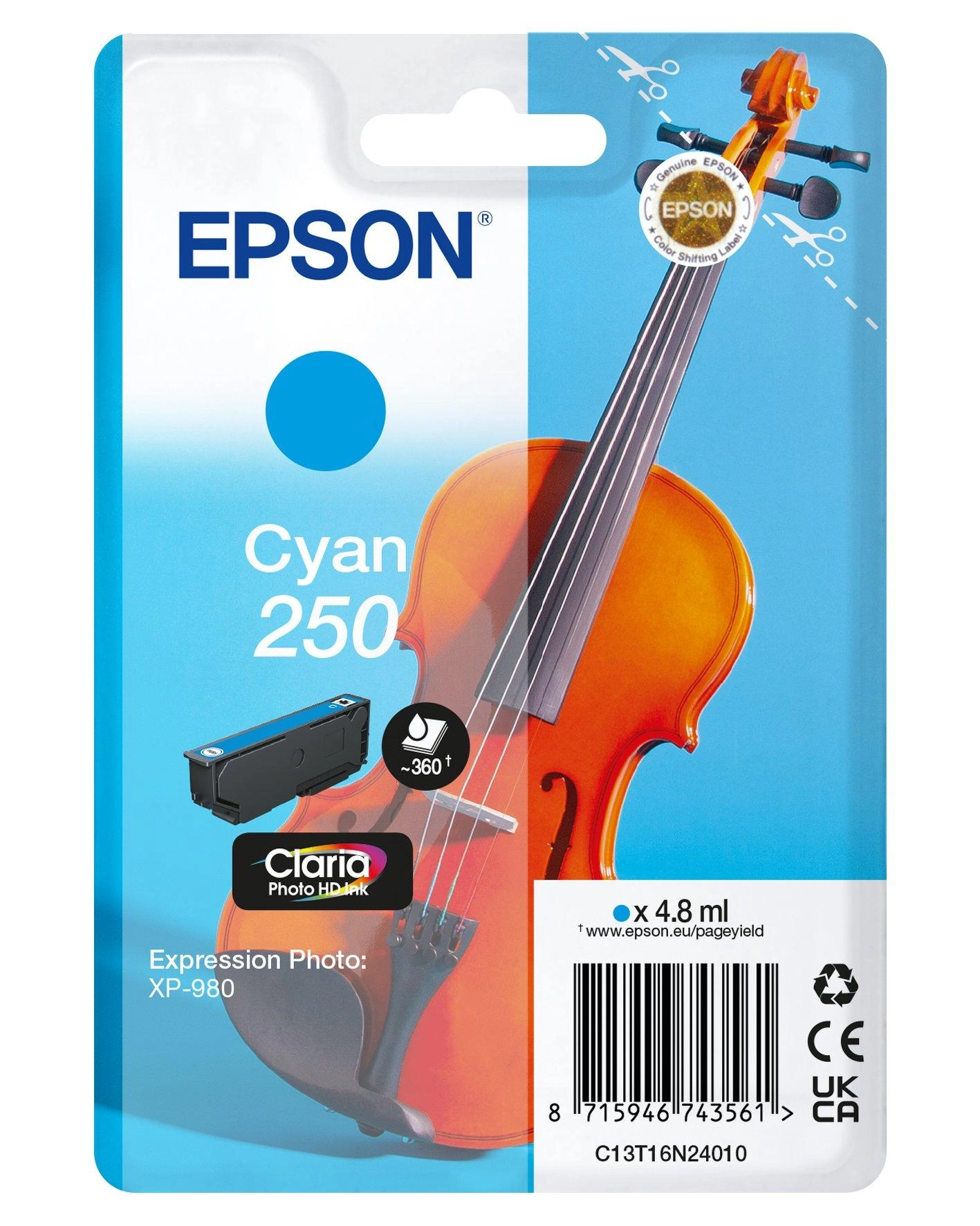 Epson 250 Violin Claria Photo HD. Type aanbod: Enkele verpakking, Volume gekleurde inkt: 4, 8 ml, Printkleuren: Cyaan, Aantal per verpakking: 1 stuk(s)