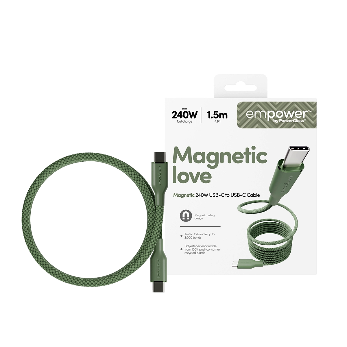PanzerGlass empower™ by ® Magnetic 240W USB-C to USB-C Cable | USB 2.0 | 1.5M | Sage. Kleur van het product: Groen