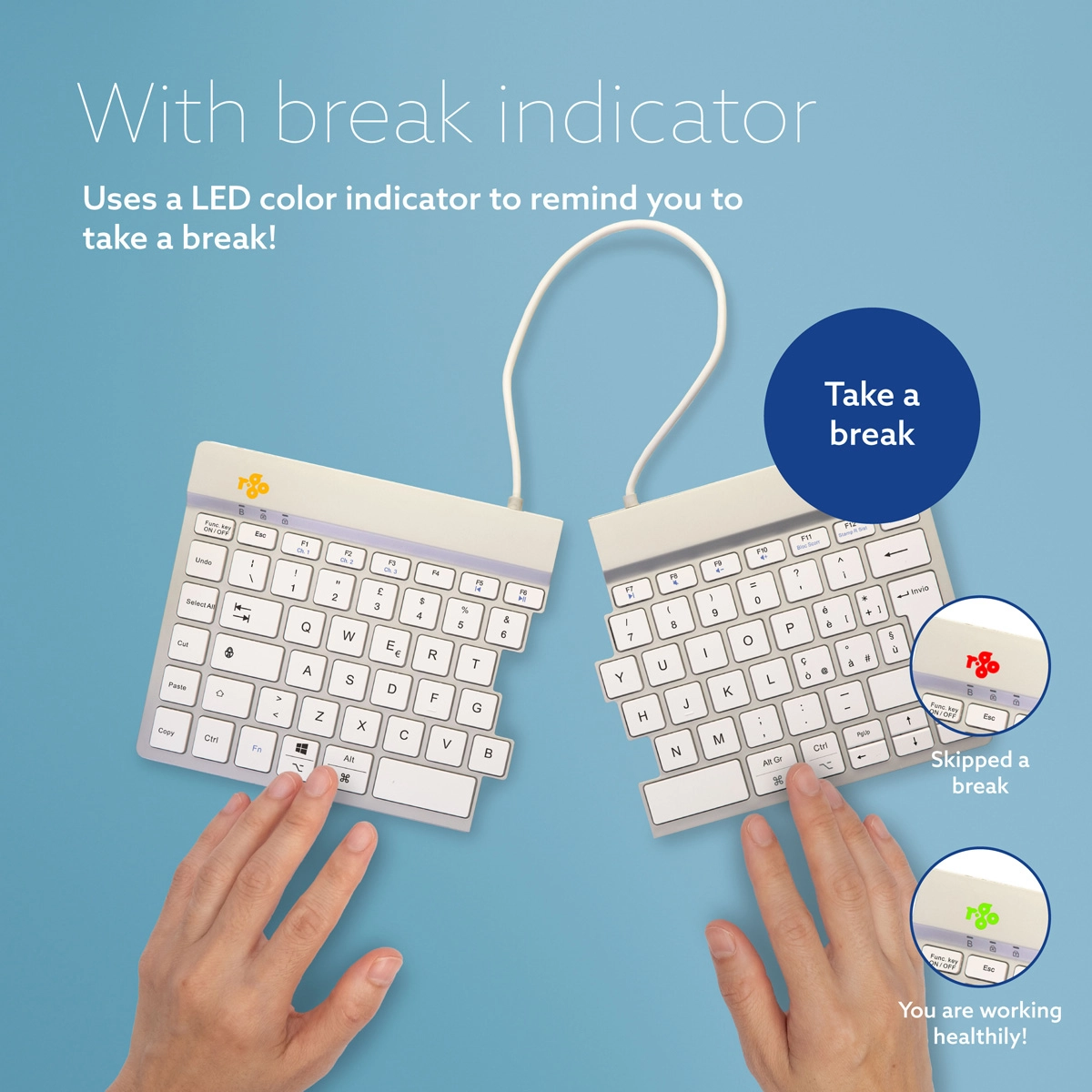 Het R-Go Split Break toetsenbord is een ergonomisch gesplitst toetsenbord met geïntegreerde pauzesoftware. Dit toetsenbord stimuleert je om regelmatig pauzes te nemen. Zo blijft de doorbloeding van je lichaam op peil, voorkom je overbelasting en blijf je fit tijdens je werkdag. Het toetsenbord bestaat uit twee losse delen, die je elk in gewenste opstelling kunt plaatsen. Dit splitsen voorkomt een knik in de polsen tijdens het typen. Typen met rechte polsen verlaagt de spierspanning en voorkomt afknelling van pezen en bloedvaten. Door de ingebouwde magneet kun je de twee afzonderlijke delen van het toetsenbord met 1 beweging veranderen in een compact toetsenbord. Het compacte formaat zorgt ervoor dat de muis altijd binnen handbereik ligt. Door de lichte toetsaanslag is er minimale spierspanning aanwezig tijdens het typen. Het toetsenbord is vlak, waardoor je handen en polsen tijdens het typen plat en ontspannen zijn. De LED- kleursignalen in het toetsenbord geven aan hoe gezond je werkt en wanneer het tijd is voor een pauze. Tijdens het typen verandert het lampje van kleur, zoals een stoplicht. Groen betekent ‘goed bezig’, oranje dat het tijd is voor een pauze, rood dat je te lang hebt doorgewerkt. Door deze subtiele kleursignalen ontvang je op een eenvoudige en positieve wijze feedback over je pauzegedrag. Dit product werkt samen met de R-Go Break Software dat de Benelux Office Product Award 2021 heeft gewonnen.