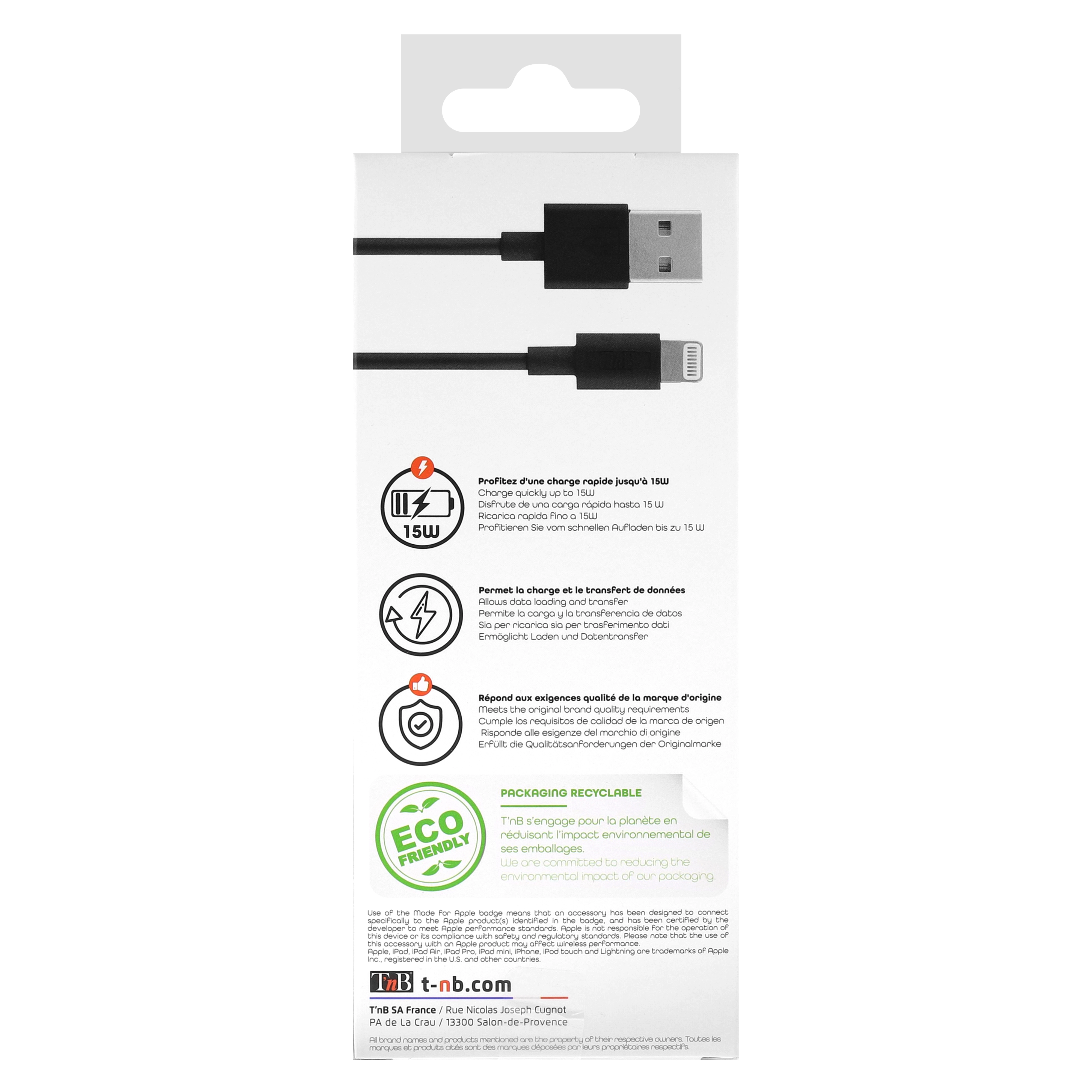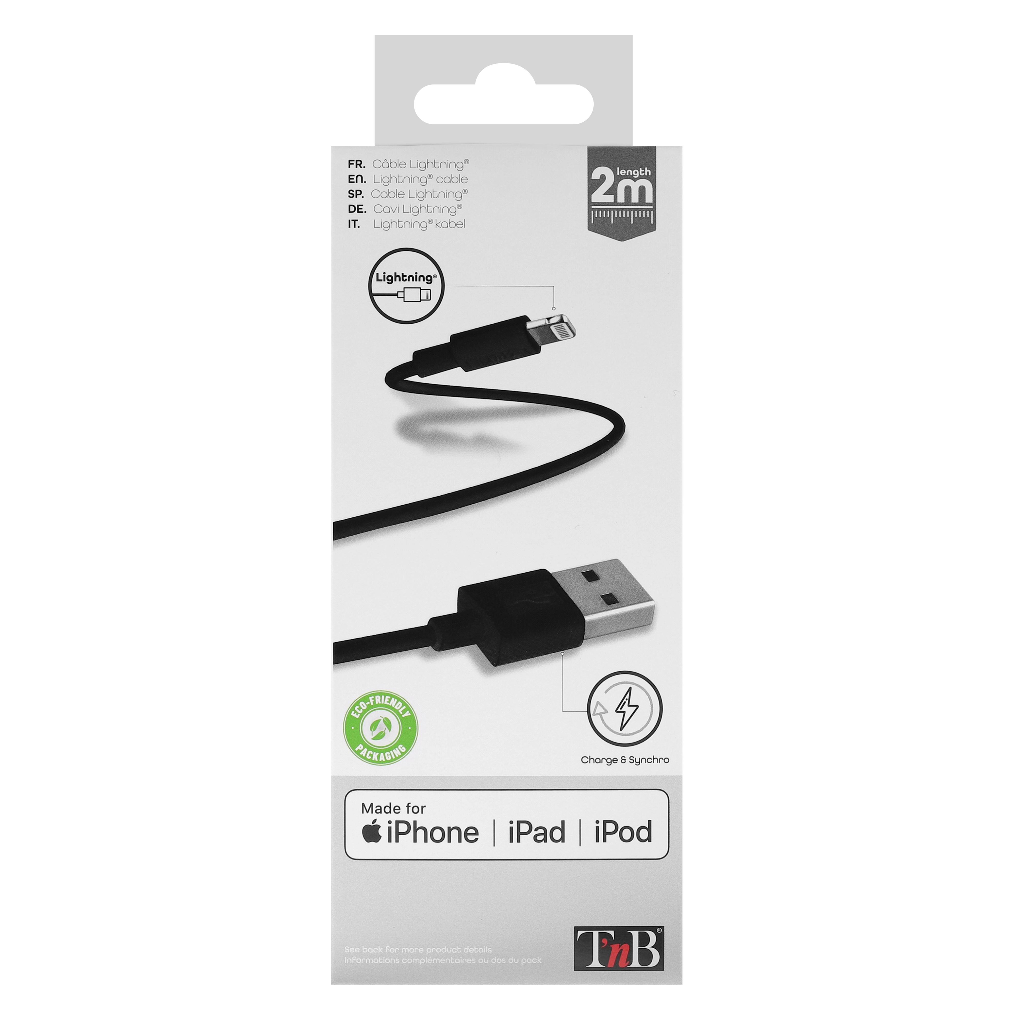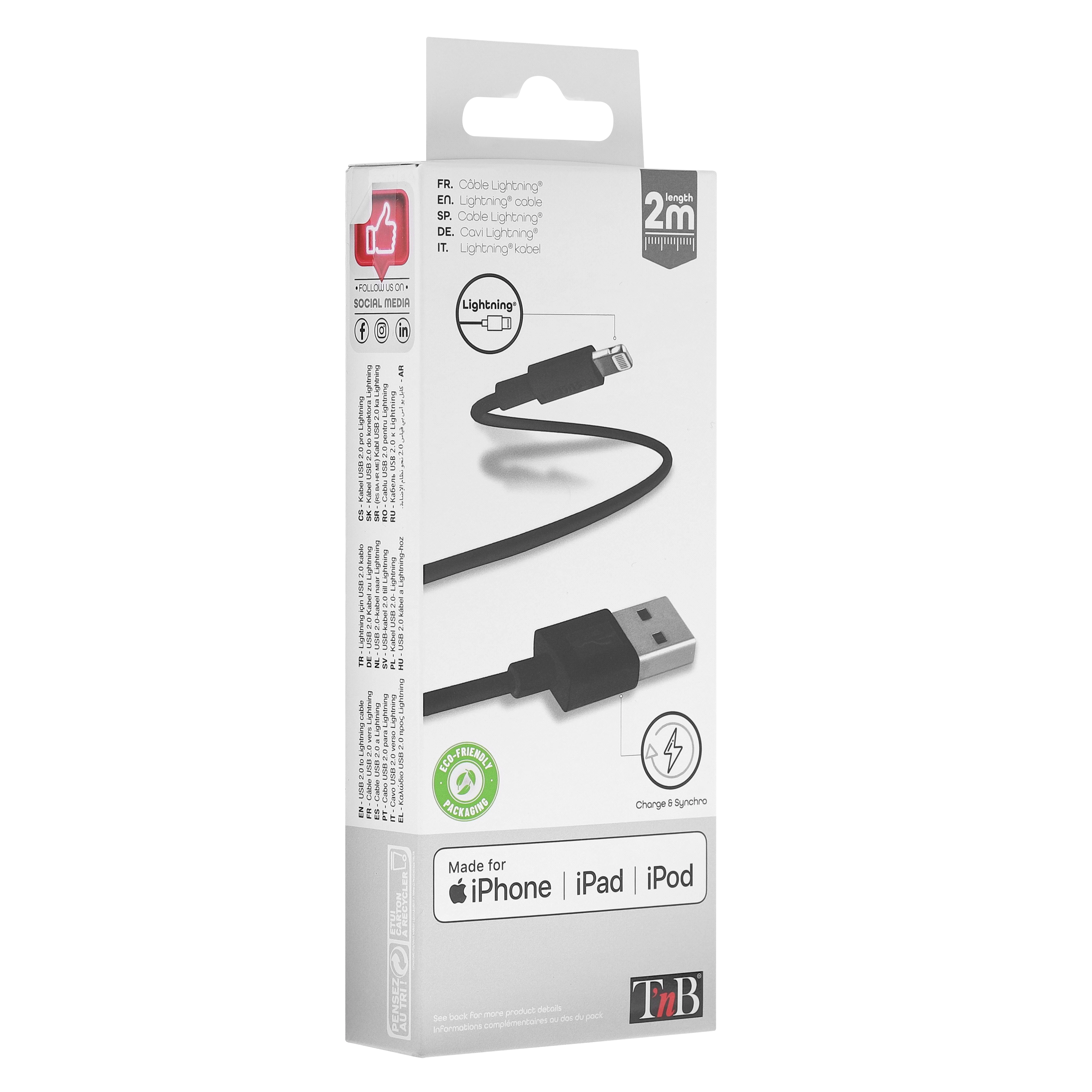 Its ideal size of 2M is equally suited to home use as it is to use in your car or office, practical and space-saving, it will follow you everywhere. Designed to support 15W charging, it will recharge your Apple device in no time. It will also allow you to transfer data. All T'nB Lightning® cables are tested and approved by Apple®, a guarantee of their high quality. USB/Lightning cable for charging and syncing with Apple® license: - iPhone 12mini / iPhone 12 / iPhone 12 Pro / iPhone 12 Pro Max / iPhone SE / iPhone 11 pro max / iPhone 11 pro / iPhone 11 / iPhone XS max / iPhone XR / iPhone XS / iPhone S / iPhone 5C / iPhone 5 - iPad Pro (12/9-inch) / iPad Pro (9.7-inch) / iPad mini 4 / iPad mini 3 / iPad air 2 / iPad Air / iPad mini 2 / iPad mini / iPad (4th generation) - iPod touch (6th generation) / iPod touch (5th generation) / iPod nano (7th generation)