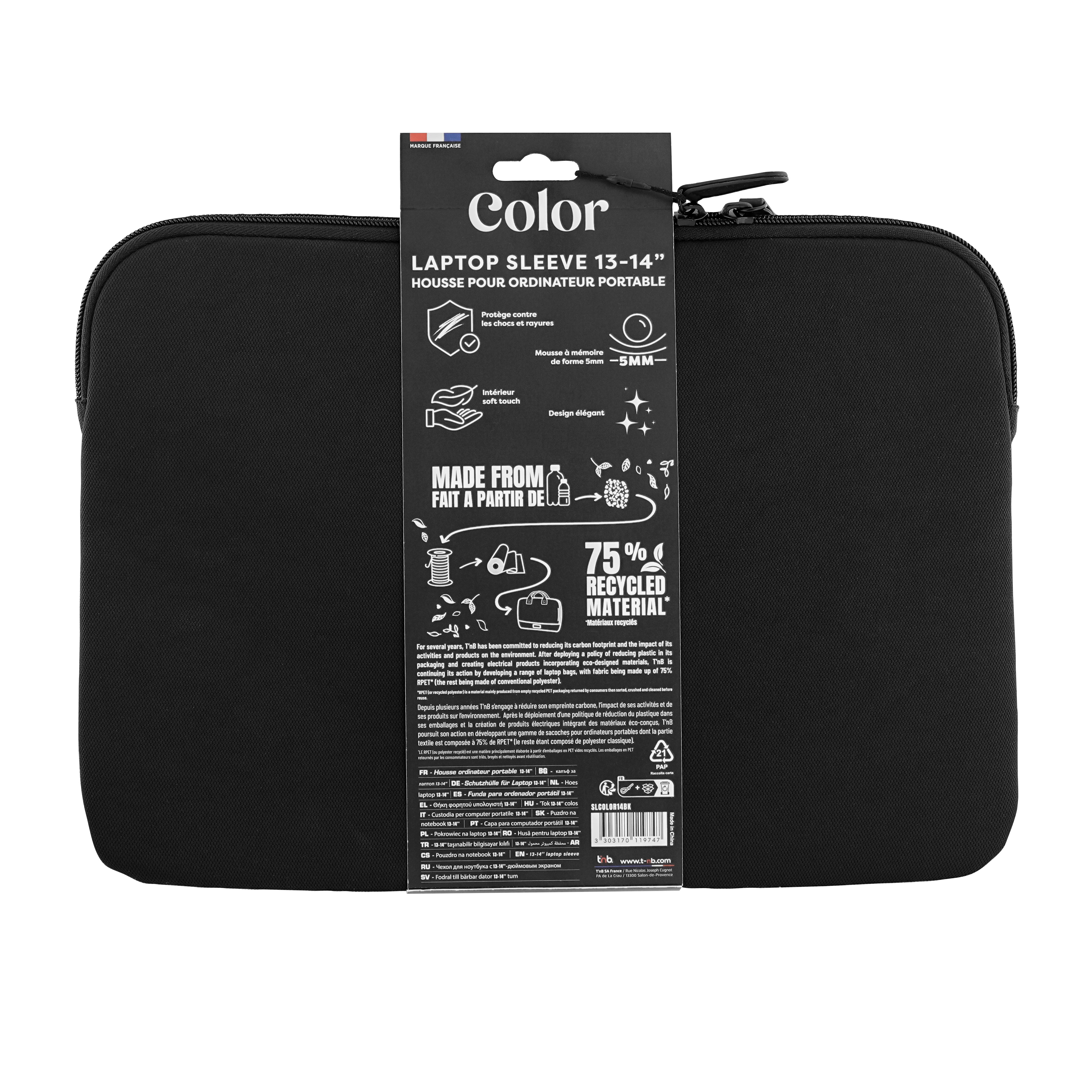 This PC case from the COLOR range accompanies you on a daily basis and allows you to combine protection and style. Fall for its sober and solid colors, with an elegant and refined finish. In addition to being stylish, this case will protect your computer against shocks. Indeed, the 5mm memory foam will absorb shocks and prevent any accidents. Also avoid all types of scratches with the soft touch colored interior, soft to the touch and effective in protecting your tablet / computer. We have thought of every detail, which is why the design has been worked on down to the zipper. The latter has been designed to be elegant while blending perfectly with the design of the case. At T'nB, we are very committed to the environment and to our CSR values. This is why this product is 75% RPET, i. e. made from recycled and recyclable plastic. This case is compatible with all types of computers / tablets, up to 14 inches!