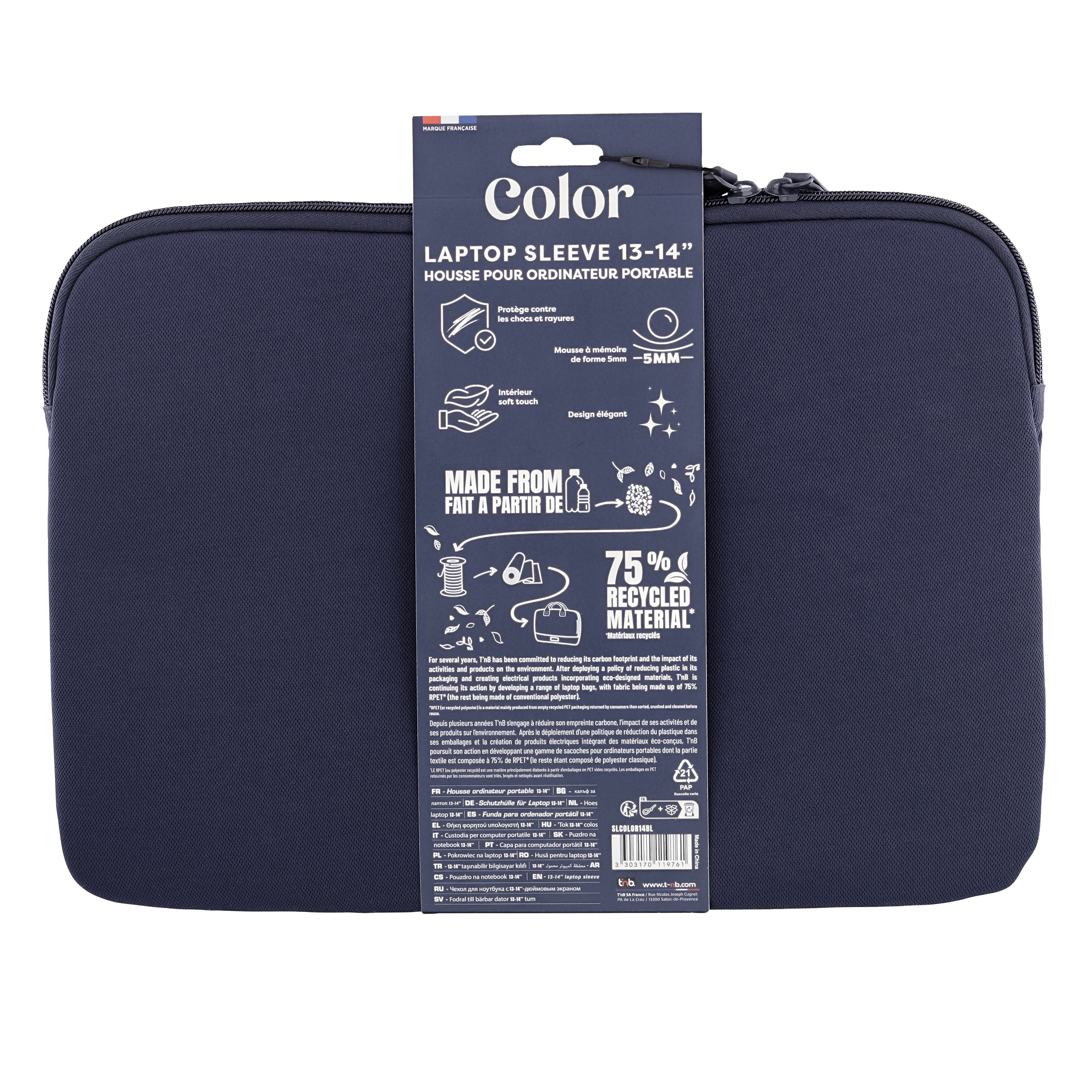 This PC case from the COLOR range accompanies you on a daily basis and allows you to combine protection and style. Fall for its sober and solid colors, with an elegant and refined finish. In addition to being stylish, this case will protect your computer against shocks. Indeed, the 5mm memory foam will absorb shocks and prevent any accidents. Also avoid all types of scratches with the soft touch colored interior, soft to the touch and effective in protecting your tablet / computer. We have thought of every detail, which is why the design has been worked on down to the zipper. The latter has been designed to be elegant while blending perfectly with the design of the case. At T'nB, we are very committed to the environment and to our CSR values. This is why this product is 75% RPET, i. e. made from recycled and recyclable plastic. This case is compatible with all types of computers / tablets, up to 14 inches!